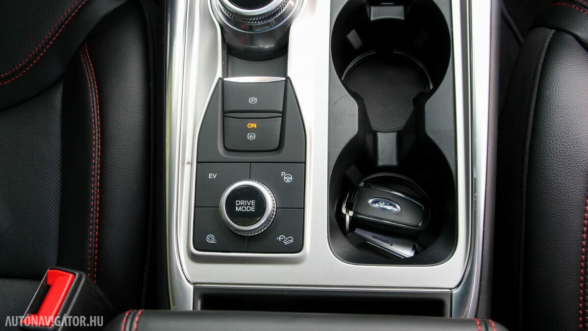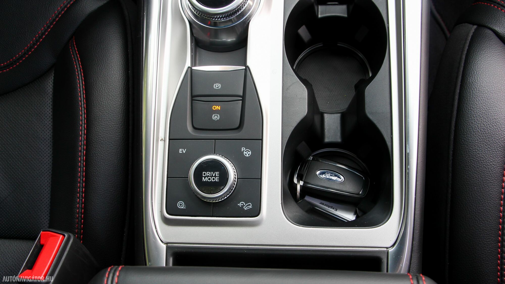 A villanymotor így a benzinmotor és a váltó között helyezkedik el, tisztán elektromos üzemben is a váltón keresztül (de kevesebb fokozatot használva) hajt, ha pedig hibridként használjuk az Explorert, a villanymotor pontosan azzal a fordulatszámmal dolgozik, amivel a benzinmotor is, így segít rá a hajtásra. Ha pedig nincs szükség az elektromos hajtásra, természetesen az amúgy a második sori ülések alá épített, kívülről is tölthető lítium-ion akkumulátort is táplálhatja generátorüzemben. Elképesztő belegondolni, hogy milyen számítógépes vezérlés kell ehhez a rendszerhez, de a dolog működik. A váltások olyan gyorsak és finomak, hogy teljesen észrevétlenek. Jót tesz az Explorer vezethetőségének, hogy a platformja alapvetően hátsókerekes (Amerikában az alapverzió csak hátul hajt), az európai, csakis PHEV verzió viszont mindenképp összkerekes: egy számítógépvezérlésű, a szenzorok jelei alapján a nyomatékosztást ezredmásodpercenként felülbíráló és elektromechanikus kuplunggal dolgozó rendszer dolgozik nekünk. Ezt kiegészíti még, hogy az ESP az elforgó kerekek fékezésével az oldalankénti nyomatékirányításra is képes, továbbá nem kevesebb, mint 7 menetmód által hangolhatjuk is az ESP-t egy forgókapcsolóval.