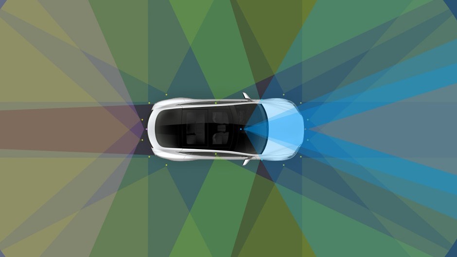 A teljesen önvezető Tesla is csak jogosítvánnyal rendelkező sofőrrel a vezetőülésben hajthat majd közútra - a képen az autón található kamerák és szenzorok elhelyezése látható