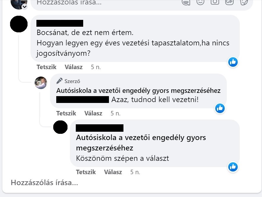 "Megjegyzés: ne feledje, hogy több mint egyéves vezetési tapasztalattal kell rendelkeznie!" Jogos kérdésként merül fel, hogy mégis honnan lenne vezetési tapasztalata valakinek, aki most akarja megszerezni a jogosítványát? Ha esetleg mégis van a jelentkezőnek rutinja jogosítvány nélkül, akkor ki fog meggyőződni arról, hogy nem csak a szerencsén múlt a túlélése a forgalomban? Főleg, amikor napi szinten jönnek szembe a hírek a jogosítvány nélküli, illetve a vezetéstől eltiltott sofőrök által okozott súlyos balesetekről. Erre konkrétan egy kommentelő is rákérdezett, ám az oldal a válaszadás után szinte azonnal törölte is a saját hozzászólását, szerencsére mi még időben elcsíptük.