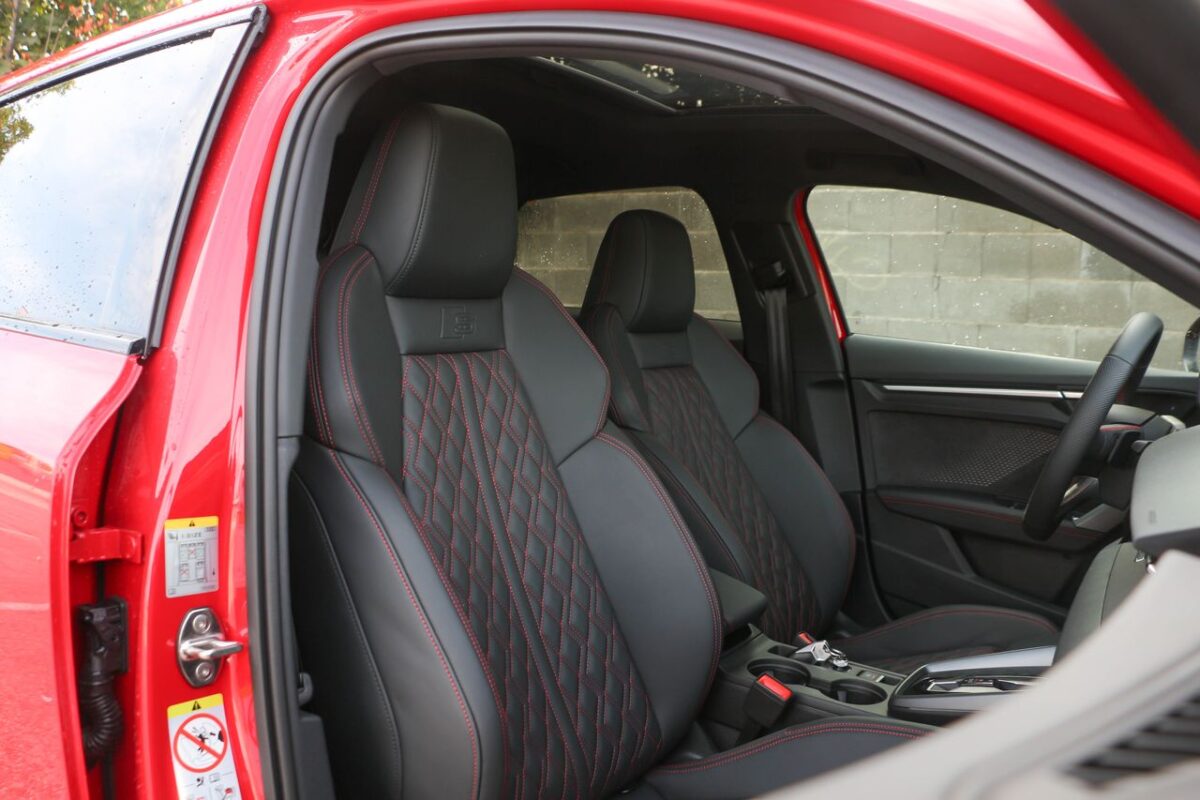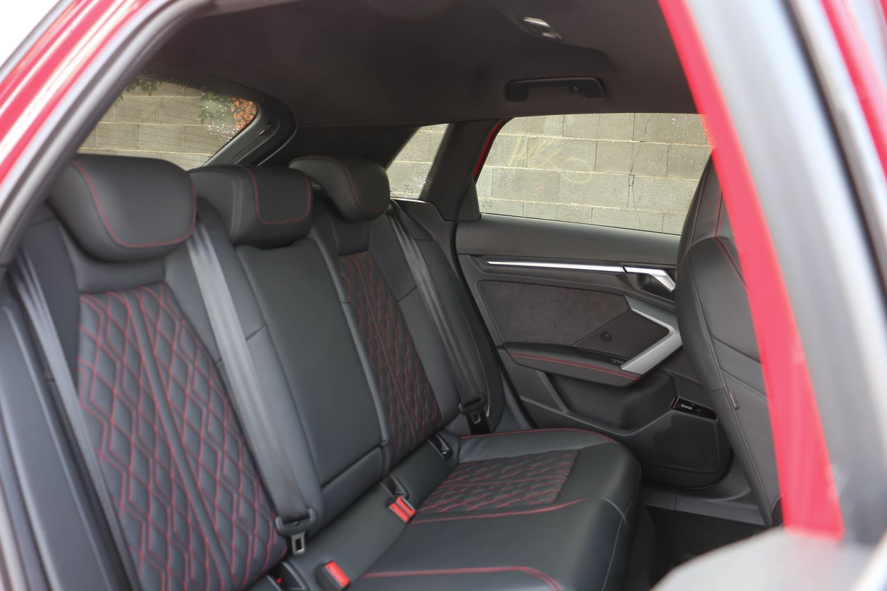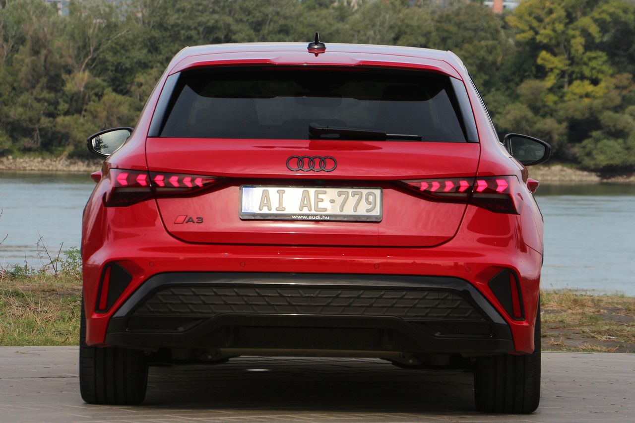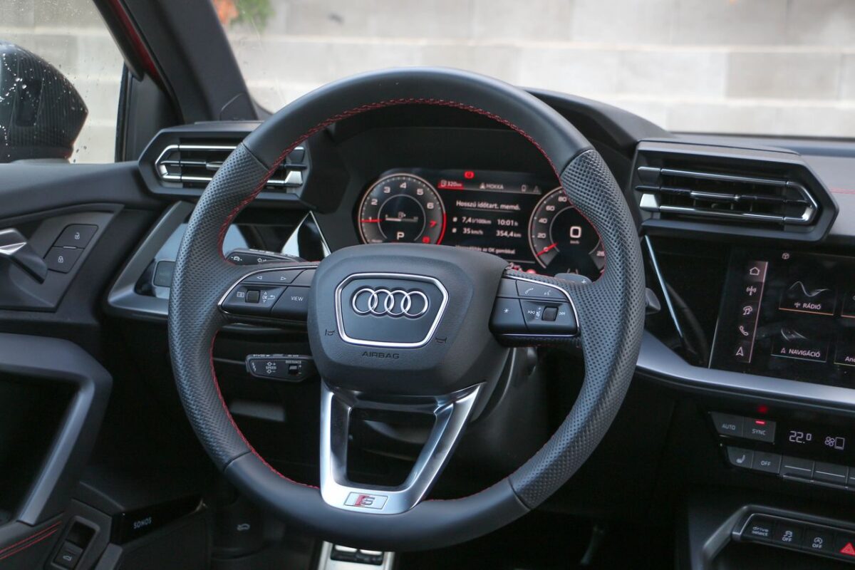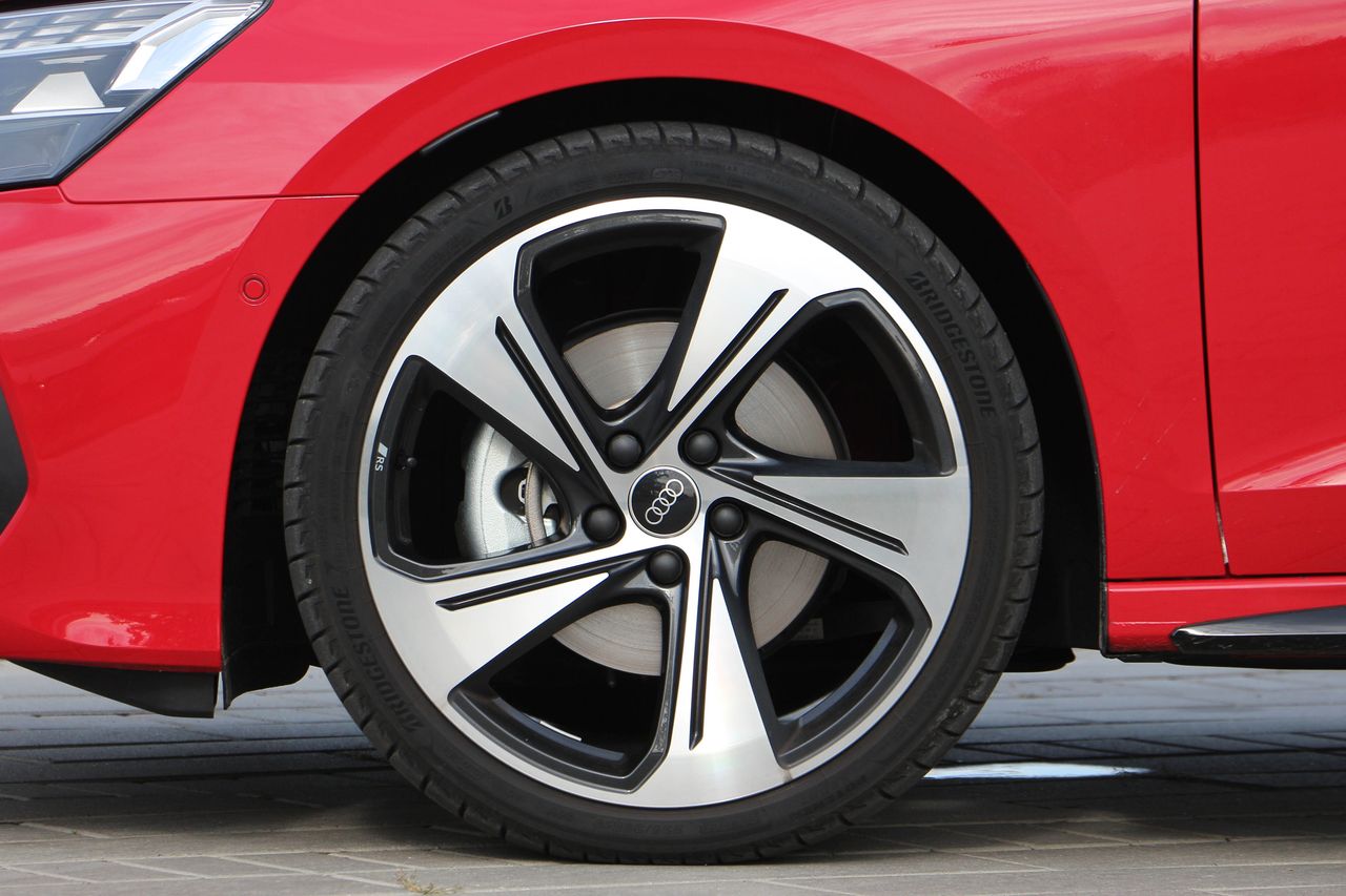 A sok kis apró részlet egy sportos autóvá áll össze, amit még tudtak fokozni a karbonhatású burkolatot kapó tükörházzal, a vörös metálfényezéssel, és az apró légterelővel a csomagtér-ajtón. Mégis ha valaki rápillant oldalról, jó eséllyel a 19 colos felnik fogják megragadni a figyelmét, amelyek az ezüst-fekete kombóval remekül kiegészítik a pirosat. Álló helyzetben a küllők kialakítása miatt a féknyereg is könnyen láthatóvá válik, amely fényezetlen marad, de ezen kár fennakadni, hiszen valamit az RS 3-nak is meg kell hagyni.