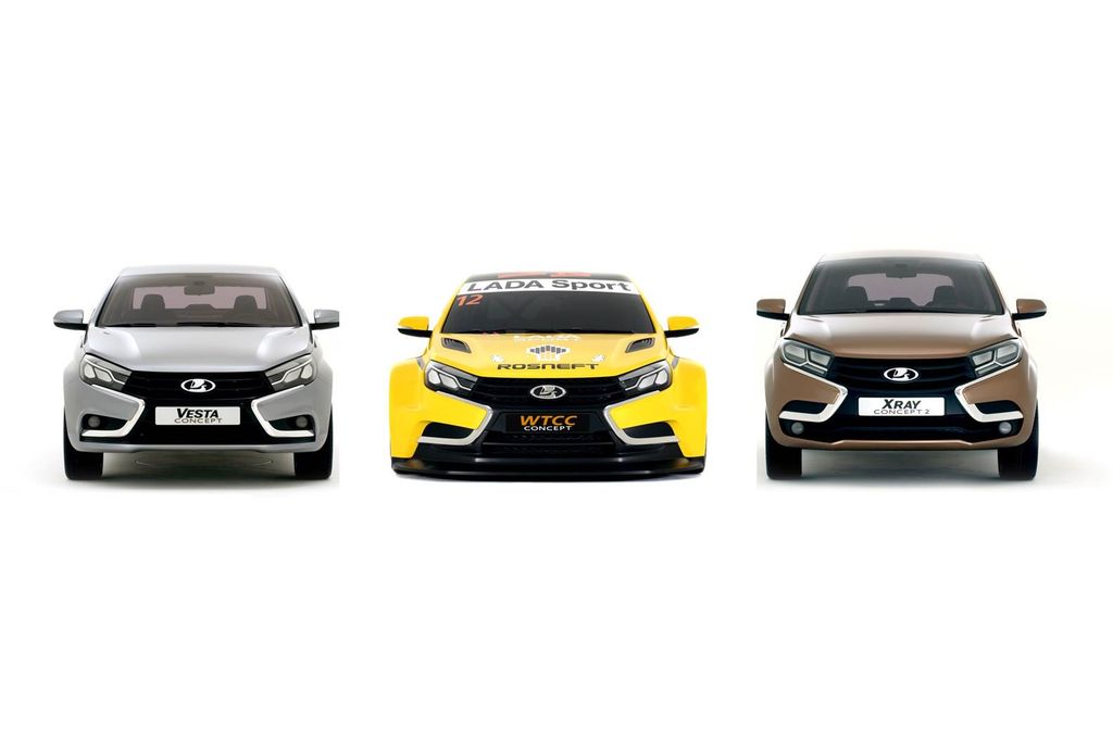 A Lada most is jelen van a WTCC-ben, a (karosszériájával) ott is futó Vesta hozzánk jövőre érkezhet. Balra az utcai Vesta, jobbra a szintén jövőre várható X-Ray crossover, melynél természetesen komolyabb terepjárója is van/lesz a Ladának