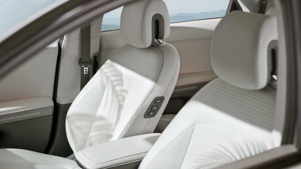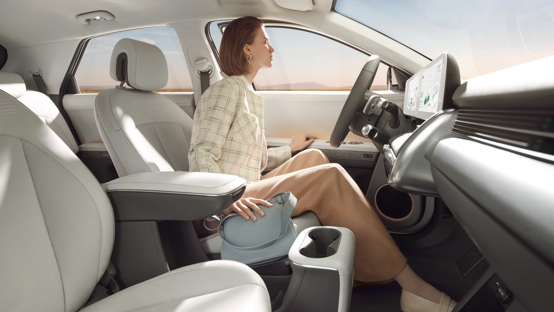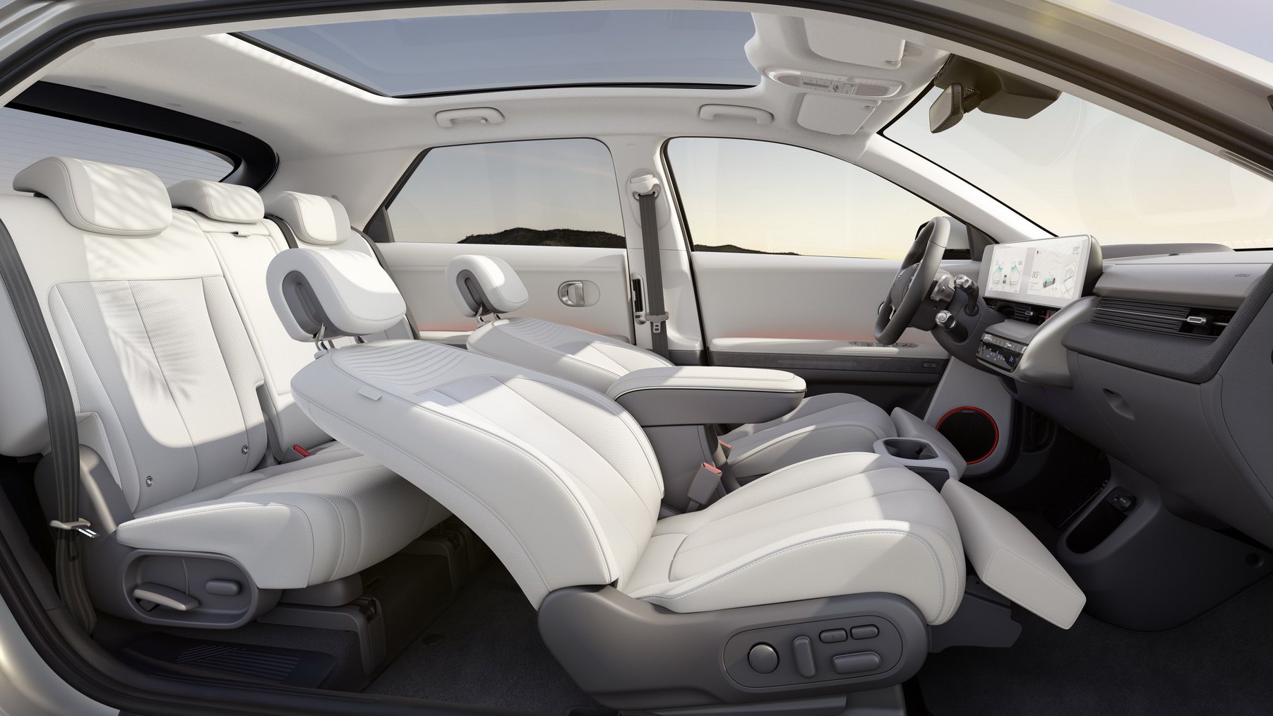 Csomagtere is hatalmas, 531 literes, amit még az orrában is kiegészíthet egy kisebb, 24-57 literes csomagtartó, kiviteltől függően. Az utastérben alkalmazott anyagok legtöbbje újrahasznosított műanyagból készül, az ülések speciális vázuknak köszönhetően 30%-kal vékonyabbak, mint egy hagyományos autóban, ezzel is növelni tudták a teret, valamint az ülések el is fektethetőek. A letisztult beltér érdekessége a Mercedes megoldásához hasonló, egy üveglap alá épített dupla kijelzős műszerfal-multimédia egység, melyben két 10,25 colos kijelzőt találunk. A tetőbe kerülhet napelem is, hogy az autó akkor is tudjon töltést felvenni, ha csak áll, viszont az Ioniq 5 töltése már alapból is kellőképpen hatékony.