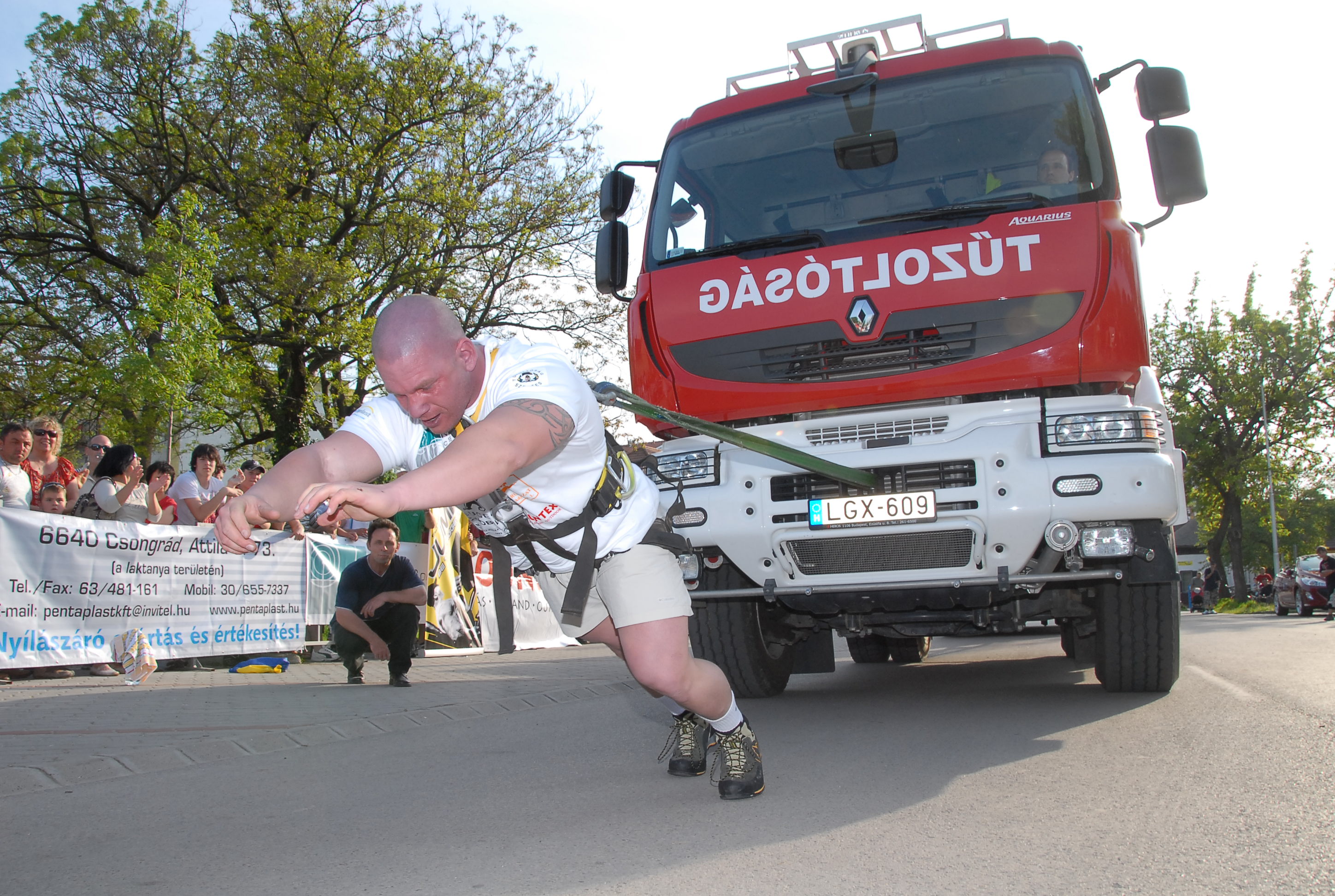 A többszörös Guinness rekorder három egymás után kötött kamiont szeretne egymaga elhúzni a hétvégén, Sinka Zsoltnak Kiskörös főterén szurkolhatnak!