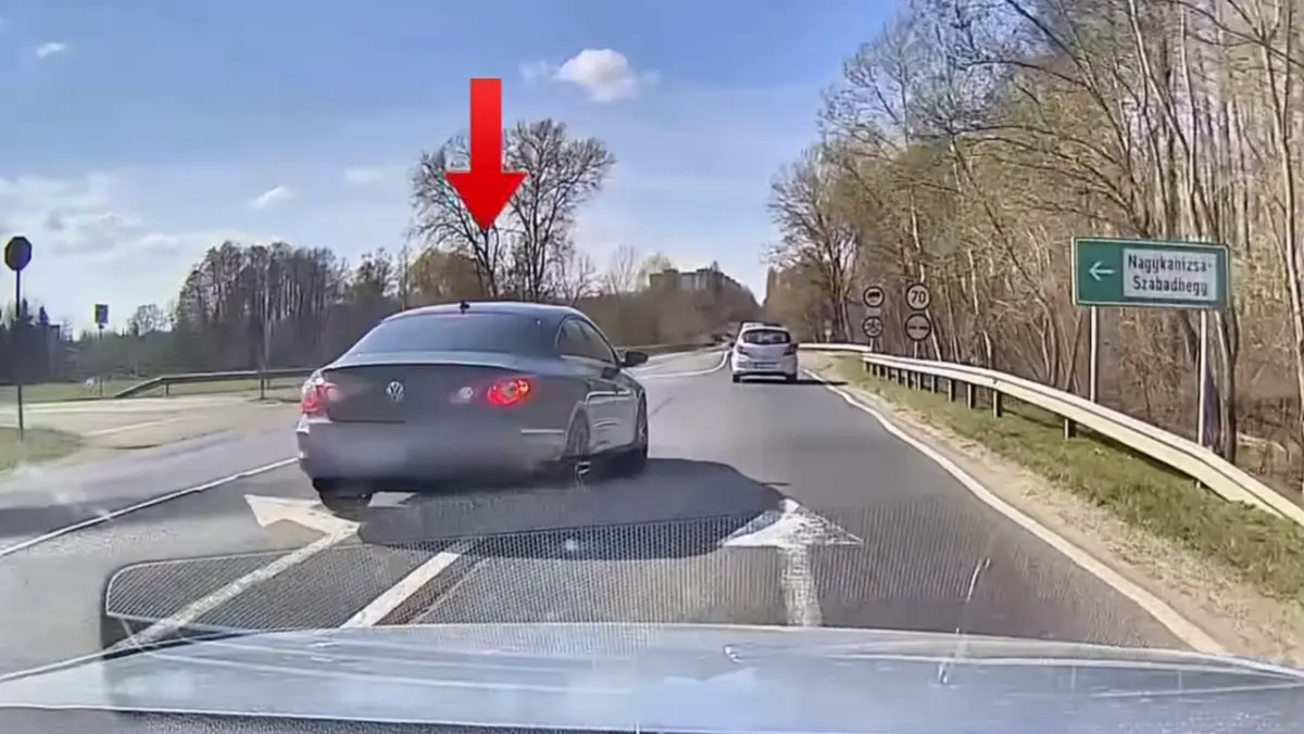 Nagykanizsán készült az alábbi felvétel, a tiltó jelzés ellenére, a kanyarodósávban, a záróvonalat átlépve előzött egy sofőr Nagykanizsán. A Volkswagen Passat CC vezetője azonban nem volt tisztában azzal, hogy a szürke autó, ami elé besorol, egy álcázott járőr két egyenruhással a fedélzeten. A rendőrök természetesen azon nyomban félreállították a szabálytalan sofőrt, akiről kiderült, hogy ennél jóval több vaj van a füle mögött. A Volkswagen ugyanis ki volt vonva a forgalomból, tehát még a szabályokat betartva sem közlekedhettek volna vele.