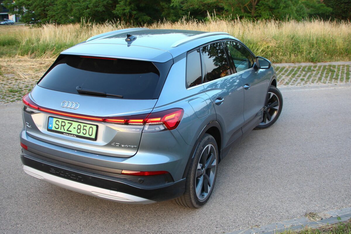 Egyedül az első ülésekről hiányoltam az elektromos állítási lehetőséget, és nem azért, mert lusta és sznob vagyok karokat húzogatni, csupán a 20 millió forint feletti árba igazán beleférhetett volna. A csomagtérre viszont nem lehet rossz szavam, alapból 520 literes, az üléseket lehajtva pedig majdnem másfél köbmétert kapunk, teljesen sík felülettel, amibe a kábelek sem zavarnak bele, mert a padló alatt tárolhatók. Szóval egy teljes értékű családi autóról van szó, amellyel kényelmes az utazás autópályán, országúton és városban is. Minden gyártó azon igyekszik, hogy ezt a mixet a lehető legjobban összehozza. Az Audinak sikerült a Q4-gyel. Talán már mondanom sem kell, hogy egy villanyautó vezetése kellemes. Nem a nagybetűs vezetési élményről szól, akkor sem ha 204 lóerős, mint a 40-es Q4, sokkal inkább a biztonságos, stresszmentes utazásról. Valójában ez utóbbit mostanában kezdik csak elérni azokkal a hatótávokkal, amelyek például a mi nem túl nagy országunkban bőven elegendőek az átlagos felhasználás során. A Q4 például minimum 466 kilométert tud megtenni a 82 kilowattórás akkupakkal, WLTP mérés szerint. Amikor a tesztautót átvettem, akkor épp 300 kilométeres hatótávot írt ki az adott töltöttségi szintjével. Alsóörsről indultam vele Budapestre, ahol aztán még a városban is tekeregtem vele kicsit. Összesen 177 kilométert tettem meg és ezután még 126 kilométer maradt a fedélzeti rendszer szerint, tehát reális volt a kezdeti 300 kilométeres “előrejelzés”. De a számoknál sokkal fontosabb, hogy egy pillanatig nem kellett azon gondolkodni elég lesz-e a hatótáv, márpedig ez nagyon fontos ahhoz a bizonyos stresszmentes autózáshoz. 19,8 kWh/100 km fogyasztást jelzett, ebben autópályázás, országút és városi tötymörgés is volt, végig klímázva, igaz azt ECO módban. [BANNER type="2"] Minden téren a kényelemre próbálták hangolni az autót. Adaptív lengéscsillapítós futóműve szépen kisimítja az úthibákat, alig érezni, ahogy átlibbennünk kátyúkon, keresztbordákon. Üzemmódválasztója dinamikus lehetőséget is kínál, de ettől csak jobb a gyorsulás, valójában nem lesz tőle sportosabb az autó, de nem is illene ez a karakteréhez. Továbbra is jó dolog, hogy alacsonyan van a tömegközéppontja, illetve hátul hajt, de ettől sem lesz versenyautó, hiszen az üres tömege 2050 kilogramm. Szóval nem kenyere a tempós kanyargás, de ha valaki mégis erre vetemedne, szépen tapad a kanyarokban, bolondbiztos a járgány.