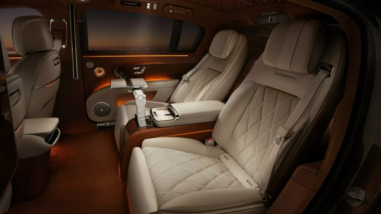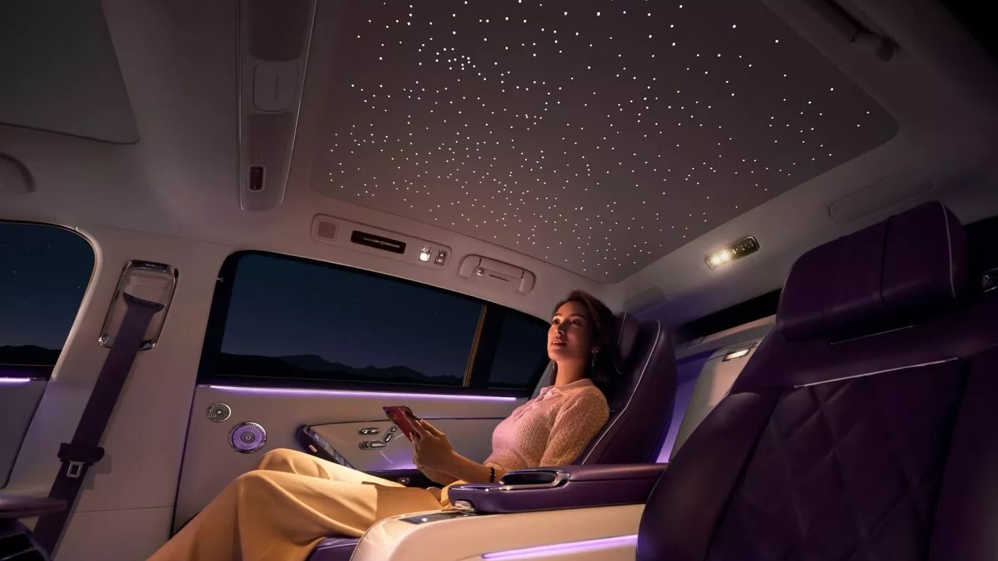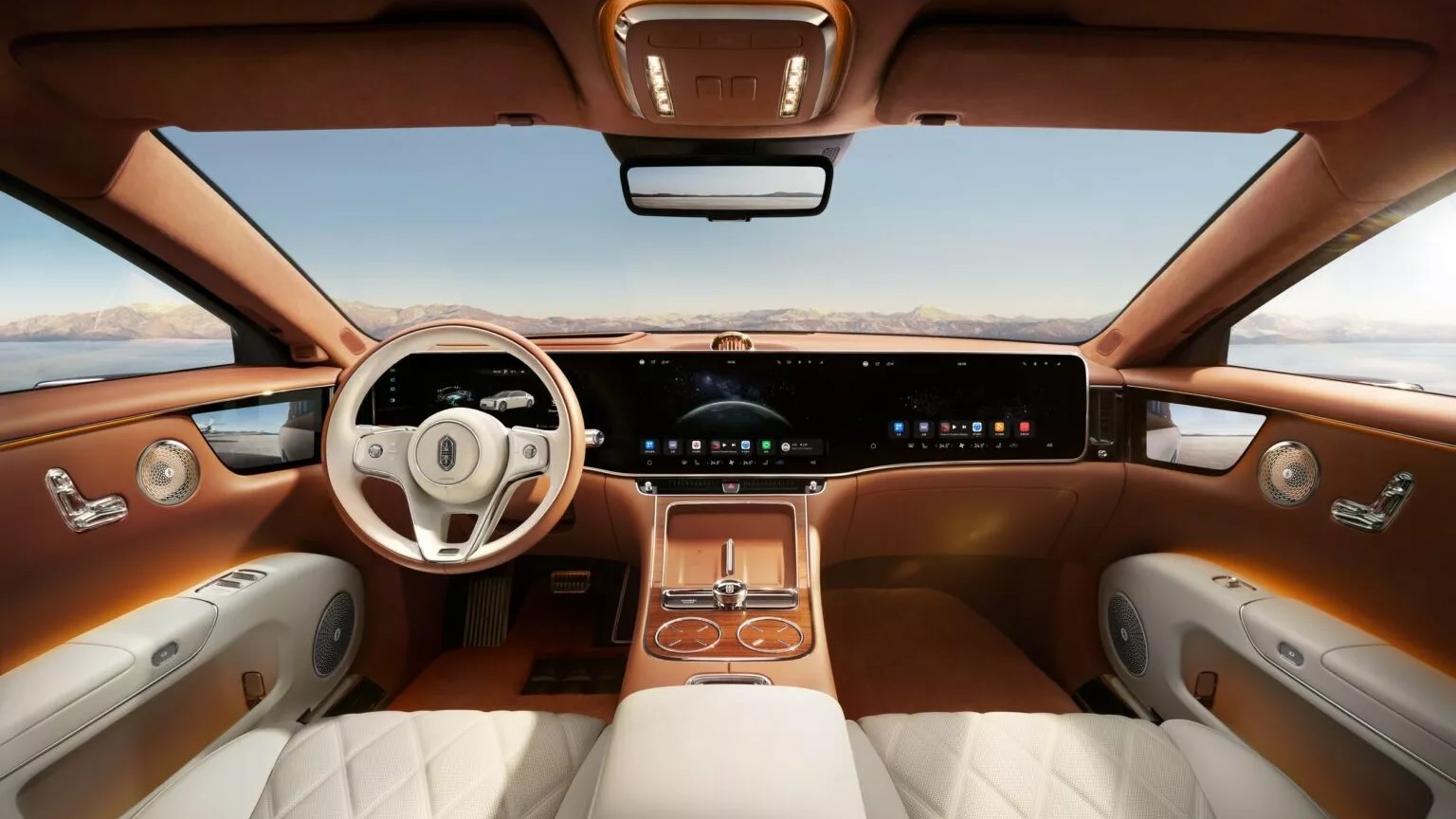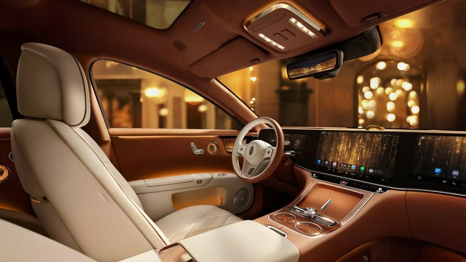 Ebben a kategóriában nem kérdés az anyagok minősége, finom a kétszínű bőrözés, de igazi fa is jutott a fedélzetre. A három képernyőből álló műszerfal erősen hajaz a Mercedes Hyperscreen rendszerére, de a stuttgarti autók Burmester hifijének hangszóróit is ügyesen lemásolták. A hátsó sorban két fotel várja a pihenésre vágyókat, az anyósülés mögötti akár le is fektethető a nagyobb kényelem érdekében. A felszereltség része a pezsgőspohár és a hűtő, de van kézbe vehető tablet, a Rolls-Royce stílusában a csillagos eget is plafonra varázsolták a tervezők.