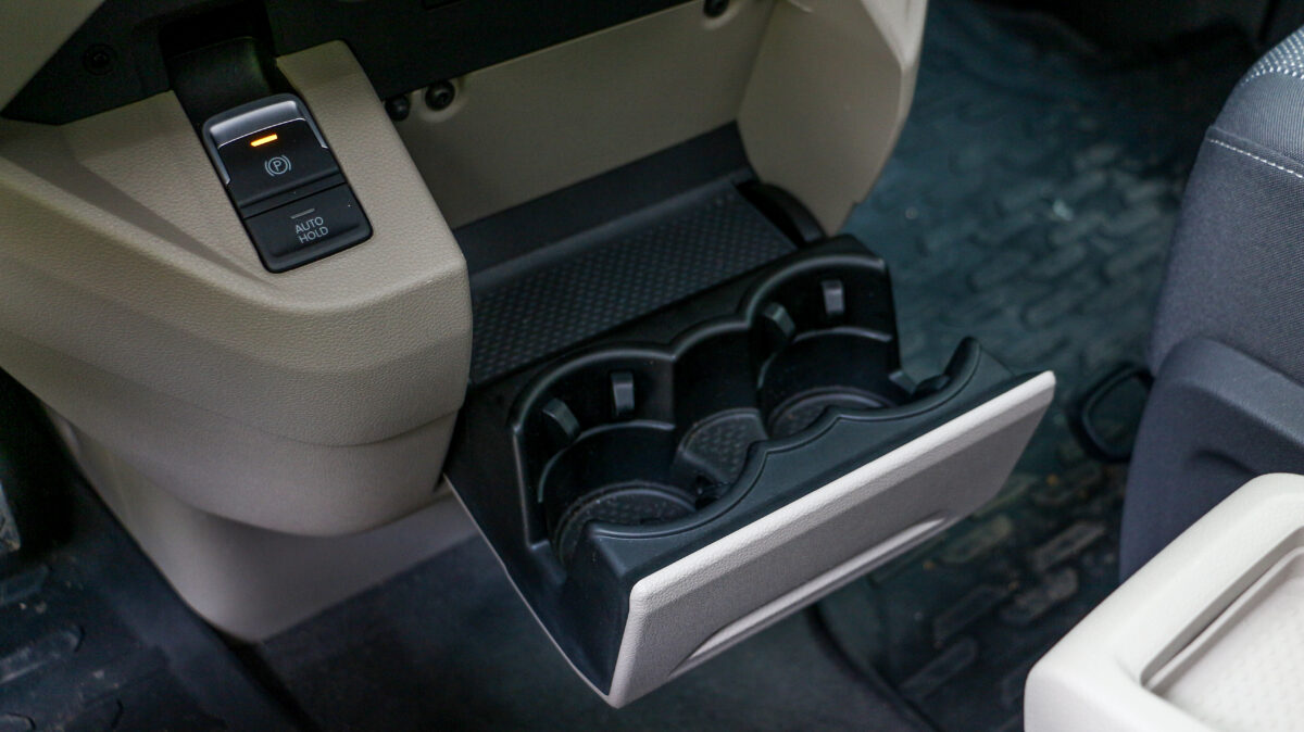 "kisbuszságnak", mindenfelé tárolókat és ötletes apróságokat találunk, ilyenek például a cserélhető zsákos kis kukák az ajtókárpitok térképzsebeiben, és a lehajtható pohártartók az indukciós telefontöltő és a két darab USB-C csatlakozó alatt a műszerfal alsó részén.
