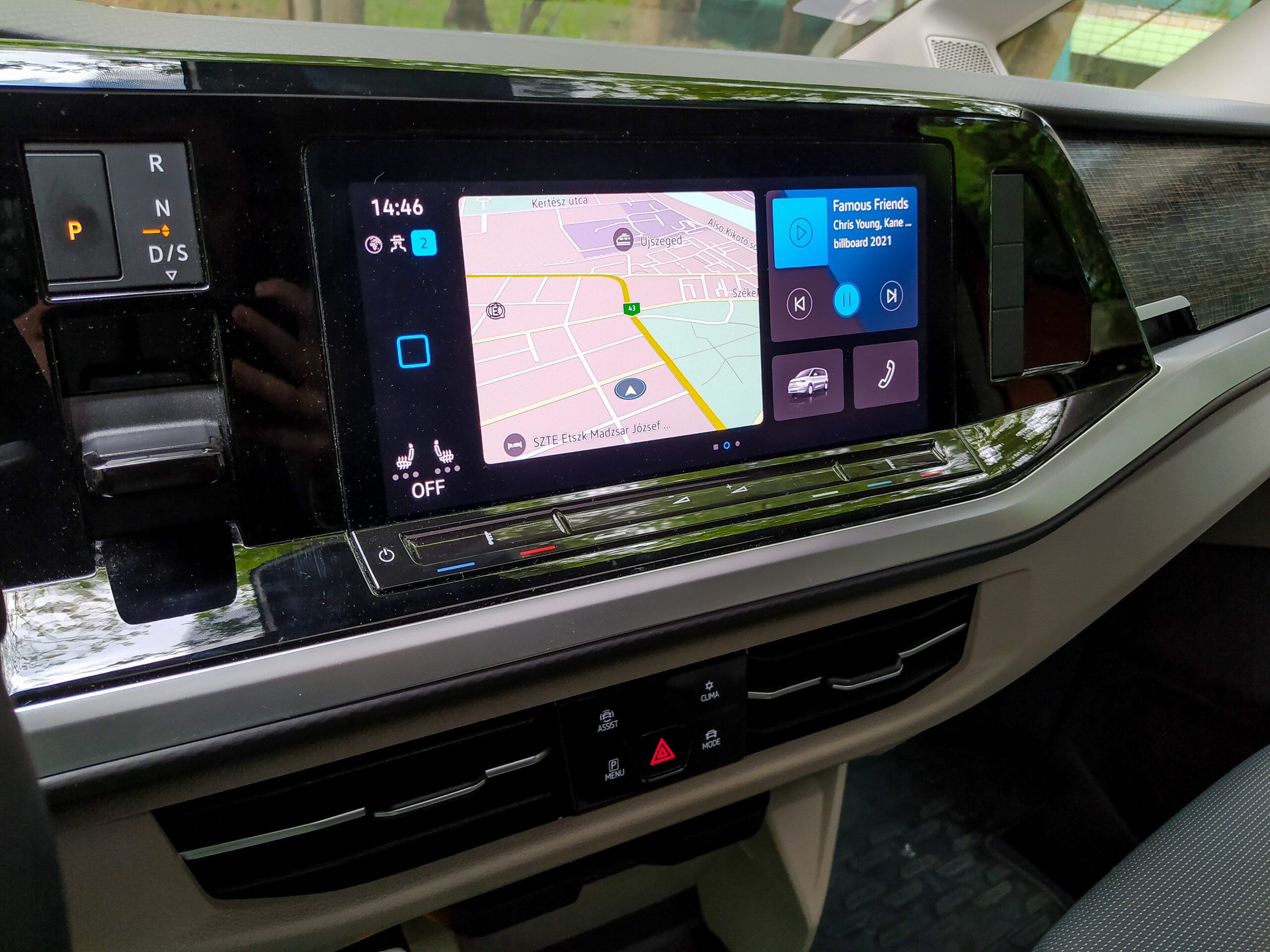 Bent az MQB platform ellenére még ugyanúgy kisbuszos marad a látvány és a térérzet, ám a vezetési élmény korántsem. Minden Multivan a Volkswagen új digitális műszeregységével jön ugyanis, az infotainment pedig akár a képeken látható, 10 colos képernyő is lehet. Nem csak a kütyük ismerősek a gyártó személyautóiból, hanem - bármilyen meglepő - a kormány és a pedálok érzete, valamint a biztonsági felszerelés is. Ettől még a praktikus részei nem vesznek el a