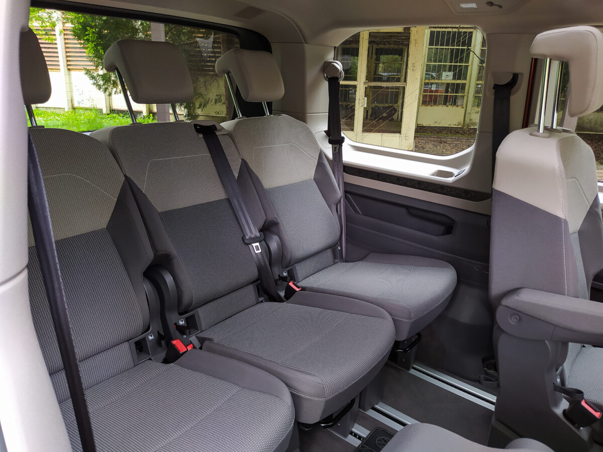 A sors fintora, hogy miközben ezeket a konkrét sorokat írom, épp hátul utazok egy ugyanilyen Multivanban valahol Csehország kellős közepén az autópályán, így arról is első kézből számolhatok be, hogy meglepően jó kényelmet biztosít akár a harmadik sorban is. C típusú töltőcsatlakozó, 12 voltos áramforrás és pohártartó is jutott ide, sőt, még kvázi könyöklő és faberakás is. A klíma hátsó zónája is pillanatok alatt lehűti a teret, volt rá lehetőségünk, hogy megtapasztaljuk a sok száz kilométeres úton. Erre amúgy szükség is van, mert a hatalmas, közel 2 négyzetméteres hátsó tetőablak nem nyílik, és nem is függönyözhető el gyárilag, így pillanatok alatt fűti be az utasteret napsütéses időben.