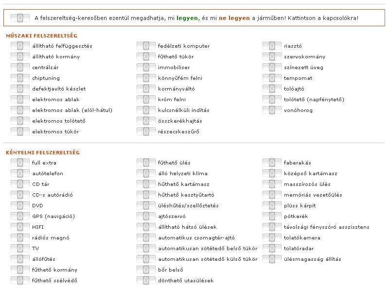 Új részletes keresőnk központi eleme a világhálón először a használtautó.hu-n látható, tologatható gomb, amely programozóink saját ötlete alapján valósult meg. A használatával kapcsolatban az egyszerűség és a kényelem volt az elsődleges a fejlesztés során, így a gomb a megfelelő irányba tetszés szerint kattintható, tologatható, sőt, aki megrögzött híve a korábbi kijelölős módszernek, a szövegre klikkelve is működtetheti a funkciókat. A választási (szűrési) lehetőségeket biztosító szempontokat négy csoportba gyűjtöttük (műszaki felszereltség, kényelmi felszereltség, biztonsági felszereltség, egyéb), természetesen az adott járműkategóriához igazítva a részleteket, így nem fordulhat elő, hogy olyan nyerges vontatóra keresünk rá, amely motorkerékpárra való oldaltáskákkal és lakókocsiba szánt mosdófülkével rendelkezik. Ugyancsak a használtautó.hu oldal egyedi jellemzője a korábbról már ismert legördülő ablak, amelyből akár több dolgot lehet egyszerre választani, de fejlesztőink most ezt is szebbé, könnyebben kezelhetővé varázsolták.