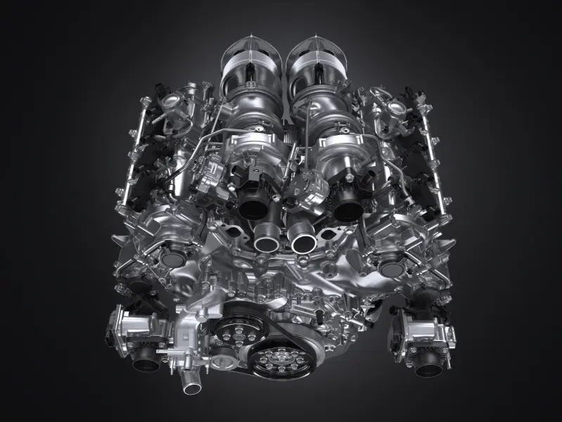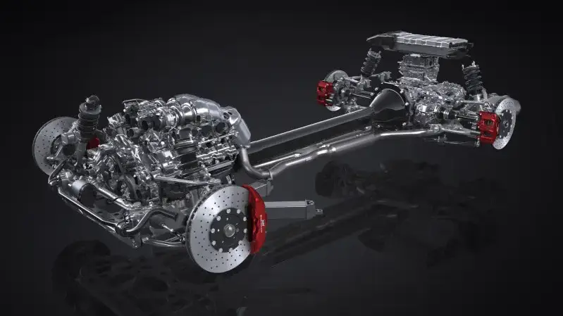„hot V” konfiguráció révén minden hengersornál, a hengersorok között kapott helyet a két turbó. A motor különlegességei közé tartozik a száraz karteres olajozás és a szokásosnál vékonyabb olajteknő, a szénszálas nyomatéktengely, illetve a villanymotorral kiegészített transaxle egység, amelyben új fejlesztésű, olajfürdős kuplungos nyolcfokozatú automata váltó és mechanikus önzáró differenciálmű pihen. A sorozatgyártott példányok maximális rendszerteljesítménye legalább 650 lóerő lesz, míg a maximális rendszernyomaték célértéke legalább 850 newtonméter.