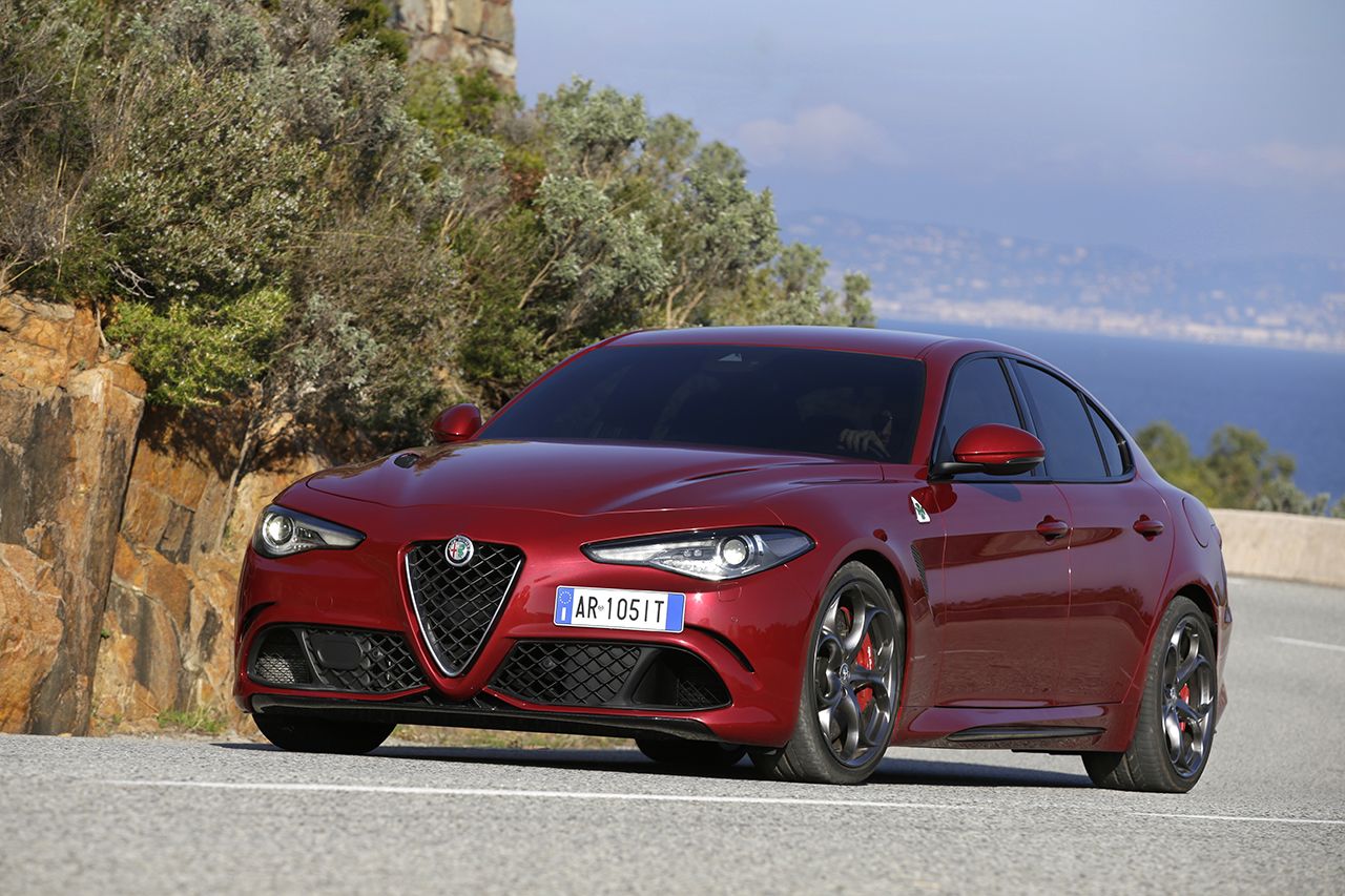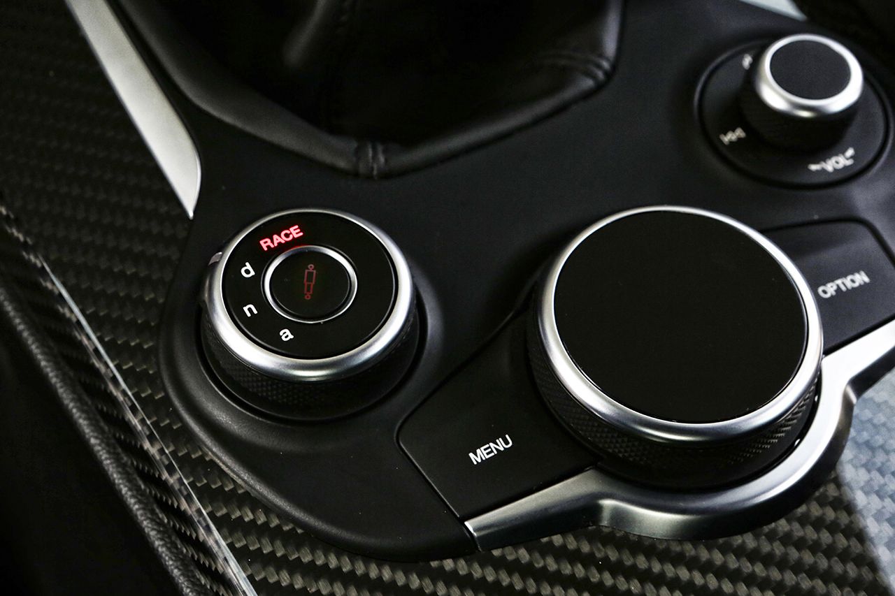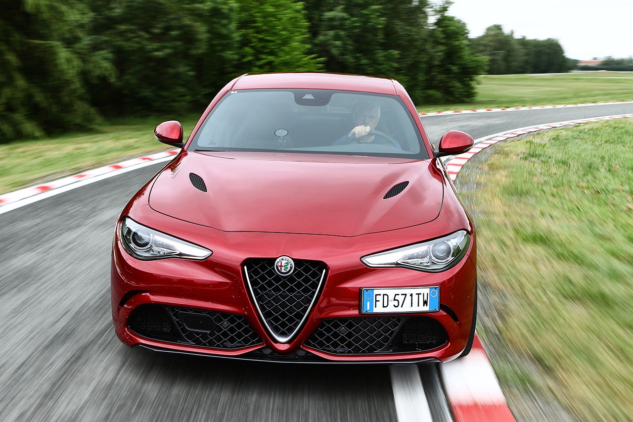 A motorpaletta viszonylag szűkös, szinte csakis a volumen cégautókra koncentrált. Meg persze ott a (részint) Ferrari fejlesztésű 2,9 literes V6-os BiTurbo, 510 lóerővel és 600 Nm nyomatékkal, 3,9 másodperces 100 km/órára gyorsulással és korlátozás nélküli, 307 km/órás végsebességgel, amivel a Giulia kategóriája autópálya-rekordere lehet. A Quadrifoglio csúcsváltozat 1524 kilogrammos saját tömegével igen előkelő, 2,99 kg/lóerő arányt mutat - köszönhetően annak, hogy teteje is karbonszálas plasztik, ahogyan egyébként a teljes spoilerezése is. A feláras karbon-kerámia fékrendszert és a Sparco üléseket rendelve még tovább apasztható a tömege, a két kuplunggal dolgozó, nyomatékszabályzós differenciálmű viszont alapáras hozzá.
