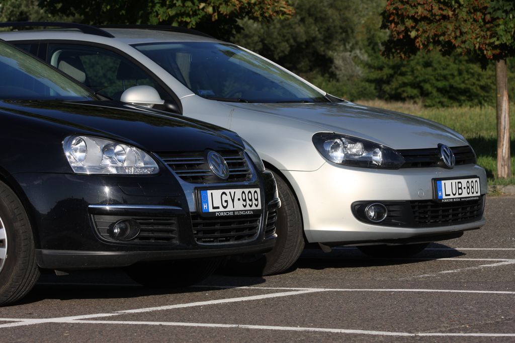 Balra feketében a Golf V alapjaira épülő, 1,6-os, 102 lóerős, Comfortline kivitelű, jobbra az azonosan Golf V alapú, de már a Golf VI orrát viselő, modern, 1,2 TSI motoros, Trendline Golf Variant ezüstben