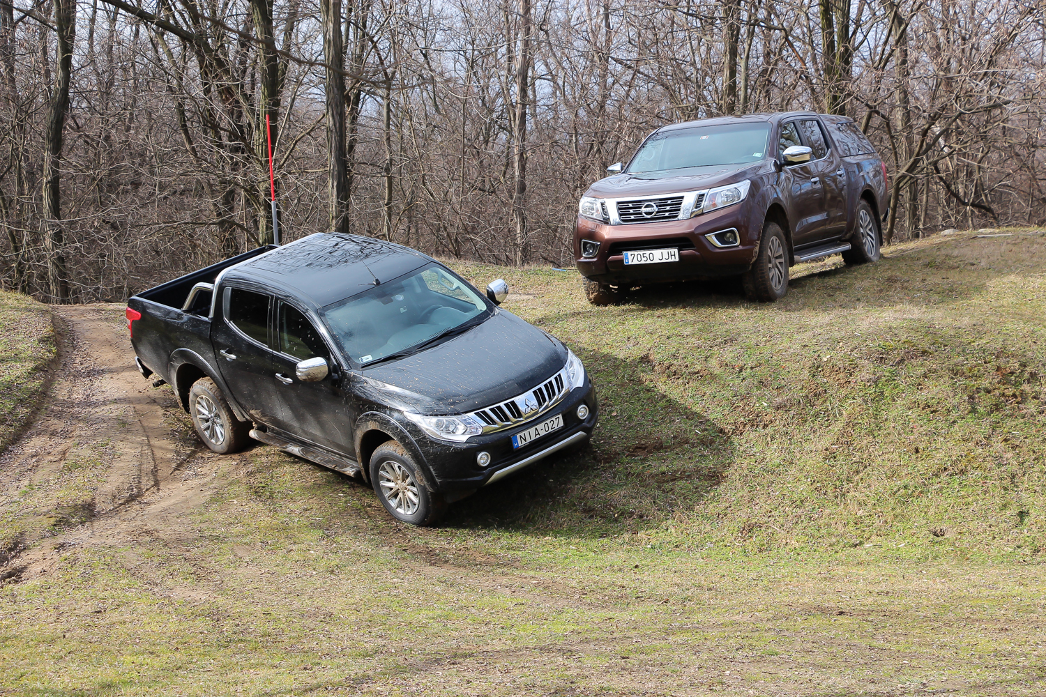Terepképességeik összevetése nehéz kérdés. Változó minőségű csúszós felületen a központi differenciálzárral szerelt L200-asok előnyben vannak, mert rajtuk nem kell folyton átkapcsolgatni a hajtást. Benne maga megoldja a rendszer, hogy ne akadjon össze, eközben a Navarás csakis és kizárólag laza talajon kapcsolhat összkereket a hajtás károsítása nélkül. Komolyabb terepen a könnyű fenekű, terheletlen pickupok csakis hátsó differenciálzárral tudnak boldogulni. A Nissanban volt, így kijelenthetnénk, hogy elverte a Mitsubishit, de ez nem lenne korrekt. Az L200-as jobban felszerelt változataiba ugyanis nem kérhető a hátsó diffi, pedig a munkára szánt szerényebb verziókban alapból benne van. A korrektség jegyében azt még fontos megjegyezni, hogy a Nissan kipörgésgátlója ügyesebben segíti a béna terepjáróst. Az off-road instruktornak nem volt gond, de én a koca, lehetséges, hogy eltemettem volna magam a Hungaroring melletti épített pályán.