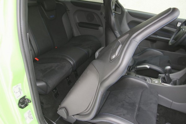 A hétköznapi használhatóság nem szenved csorbát, az RS-ből jóformán semmi nem hiányzik, és minden ugyanúgy működik, ahogy a normál változatban – olyan dolgok is, amiket nem szeretünk. Ilyen az általános szabványtól eltérő ablaktörlő bajuszkapcsoló, amely rövid húzásra nem a szélvédőt mossa, hanem elkezdi szárazon törölni a hátsó üveget… Aki Subaruból ül át Fordba, annak nem lesz újdonság, hogy a mosás a kar végén lévő gomb megnyomásával indítható, bár ez nem hiba, inkább csak alkalmazkodást igénylő megoldás. Hasonló a központi zár is, mert nincs külön gomb a belső zárásra, helyette a kilincs felső része külön mozgatható. A műszerfal kezelőszervei egyértelműek, a kialakítás esztétikus, középen állítható kartámasz fokozza a kényelmet, alatta üreggel és AUX-, illetve USB-csatlakozási lehetőségekkel. Hátra beülni nem bonyolultabb, mint a mezei háromajtós Focusba, a két Recaro támlája könnyedén előre billenthető, és ha szükséges, az alaphelyzetben 385 literes csomagtér bővítése sem okozhat problémát. A Focus RS gyakorlatilag semmilyen kompromisszumot nem kényszeríti rá a tulajdonosra, a dögös külső abszolút élhető és praktikus belsőt takar, bár attól mindenkit óva intünk, hogy tetőcsomagtartóval koronázza meg a Focusok királyát.