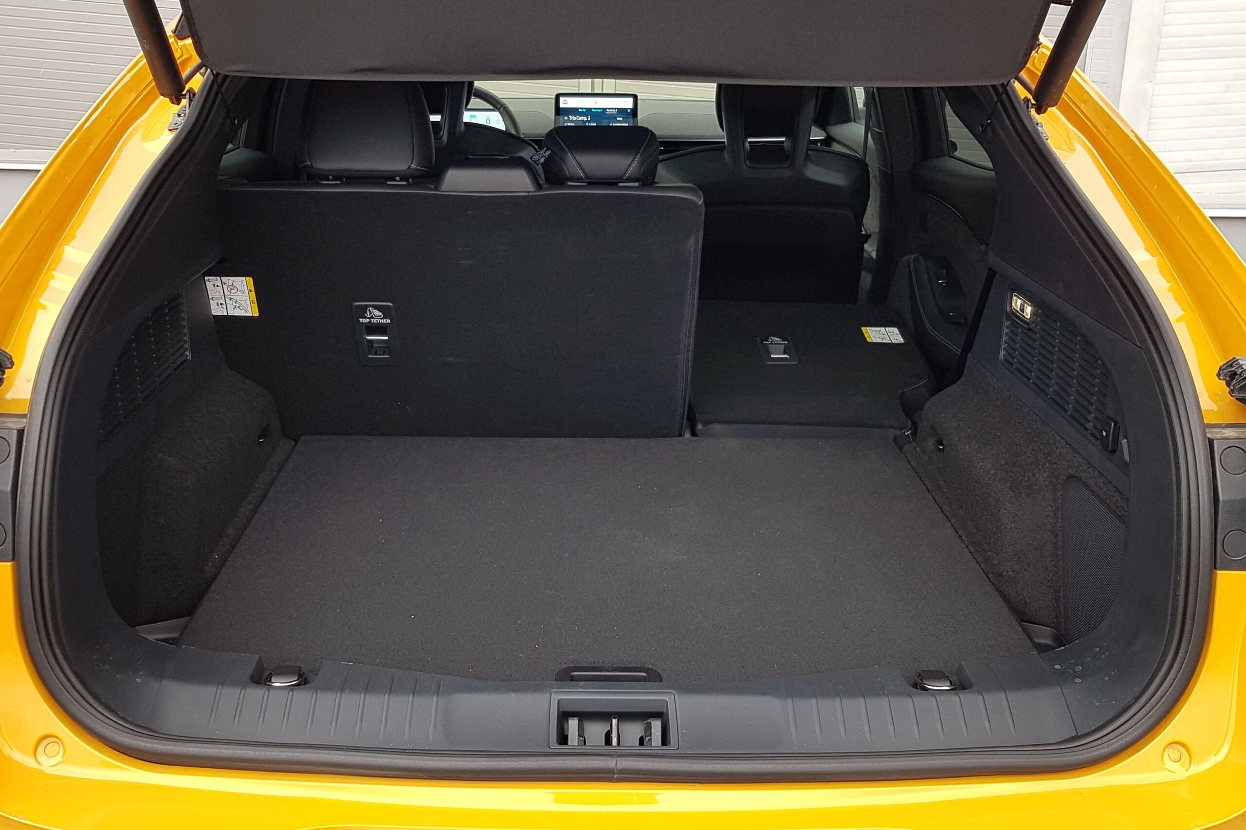Mielőtt a teljesítményre és a menettulajdonságokra kitérnék, gyorsan nézzük az utasteret. A függőlegesen elhelyezett infotainment kijelzőt kivéve kényelmes, praktikus a Mach-E. Anyaghasználata lehetne még igényesebb az árkategóriáját tekintve, de az összeszerelés példás, az ülések kényelmesek elöl-hátul, pakolóhelyekből sincs hiány, és kimondottan ügyes részlet az anyósülés előtt végighúzódó hangfal, ami a 10 hangszórós B&O hangrendszer része. Kellenek ezek a kis trükkök, hiszen életstílus autóról van szó. Na, de az a táblagép középen… Próbálok nem nagyon belerúgni, mert lehet, hogy csak én vagyok túl öreg hozzá. De valójában teljesen mindegy, milyen autóban van, nem tartom túl biztonságosnak, hogy elvonja a figyelmet a vezetésről. Jó-jó tudom, nem kell vezetés közben piszkálni. Ám az olyan funkciók, mint a klíma kezelése, vagy az ülésfűtés kapcsolása azért mégiscsak vezetés közben történnek. És ezek pont lekerültek az alsó sarkába. Az ilyen logikátlanságokat nem nézve a SYNC rendszer új generációja egyébként gyors, nem nehéz az áttekintése, kezelésének megtanulása, bár még mindig nem tud magyarul. A vezető előtti műszeregység is furcsa elsőre, egészen pontosan annak mérete, de valójában nincs nagyobbra szükség. Mondjuk jól kiegészítené egy szélvédőre vetített HUD. Ötletes még az autó orrában a 100 literes „frunk”, tehát az elülső csomagtér, ahol elférnek a töltőkábelek, bár ezeknek a hátsó, alapból 402 literes csomagtérben is jut külön rekesz.