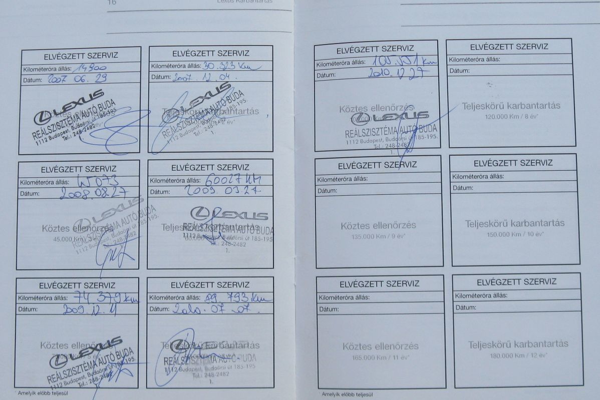 A Mazdánál ugyan később, de 2008-ban szintén digitális szervizkönyvet bevezető Toyota egyik márkaszervize is gond nélkül jelentette a teszthez használt, éppen 2008-as évjáratú Avensis legutóbbi szervizeléskori kilométerállását, de a munkákról nem számoltak be, az importőr tájékoztatása szerint ugyanis csakis az aktuális tulajdonos kérheti le a részletes adatokat – számára akár nyomtatásban is kiadják a szervizkönyvet helyettesítő szoftver adatait. Jó rendszernek tekinthető így a digitális szervizkönyv, főként azt látva, hogy egy 2005-ös Corolláról semmilyen infót nem tudott mondani a kérdezett kereskedő. Úgy néz ki, a még papír-szervizkönyves autókról a munkákat végző kereskedő tudja elmondani a legtöbbet, egy Lexus kapcsán a szervizelő Reálszisztéma (egyébként a márka politikájának ellentmondó, de nagyon is vevőcsábító módon) minden részletet elregélt. A Mercedesnél azonban vasfegyelem van: csak a vezérképviselet, írásos megkeresés alapján, a tulajdonjog igazolásával ad ki információkat a náluk már szintén digitális rendszerbe rögzített szervizmúltból.