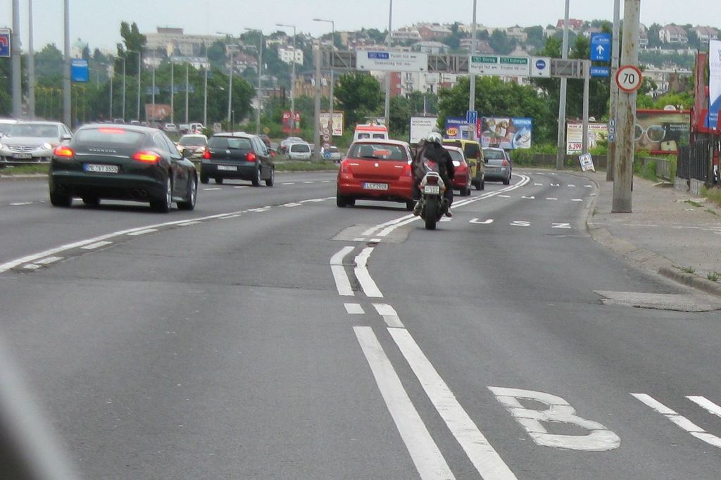 Minden rendben: a kettős záróvonallal védett autóbusz forgalmi sávban nem zavarja semmi a közlekedést, az előrébb látható motorkerékpár pedig a KRESZ szerint szabályosan haladhat a buszsávban