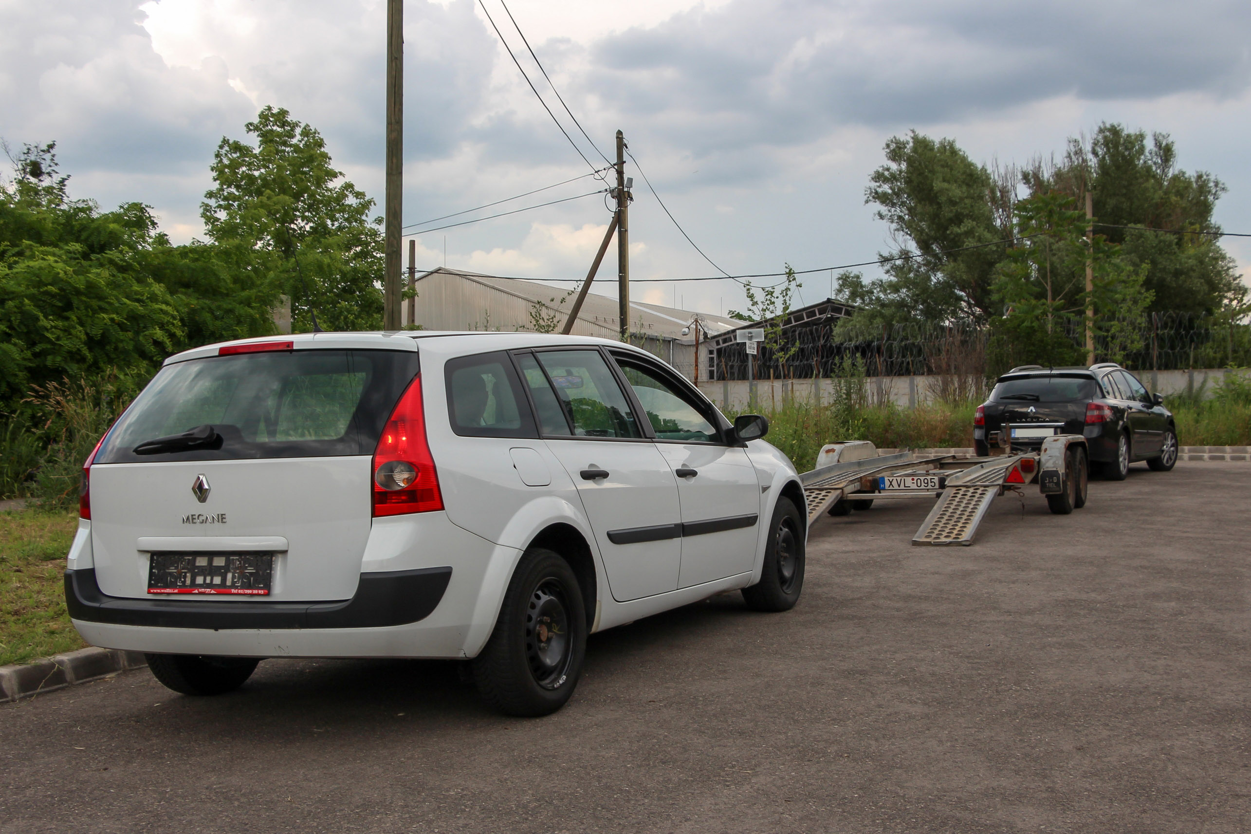 Legutóbb egy Renault Laguna 2.0 dCi-vel vontattuk az 1300 euróért vásárolt Renault Mégane Grandtourt szervizbe. Ekkor a 2,0 literes dízel is alaposan megérezte a csaknem kétszeres súlyt. A Laguna saját tömege egyébként 1576 kg, megengedett össztömege 2051 kg, fék nélkül a Scénicemhez hasonlóan 650 kilogrammos utánfutót húzhat, fékezetten 1500 kilogrammot. Ám vigyázat, ha valaki valóban rátenne egy 1,5 tonnás utánfutót, akkor már csak B+E jogosítvánnyal vezethetné, hiszen a járműszerelvény össztömege túlnyúlna a 3,5 tonnán. Erre az autóra B kategóriás jogosítványhoz csak 1449 kilogramm megengedett össztömegű utánfutó köthető. Sanszosan az önmagában is 1285 kilogrammos Mégane kombival megpakolt kéttengelyes utánfutóval is túlterheltük, számolni kell ugyanis utóbbi több száz kilós tömegével is.