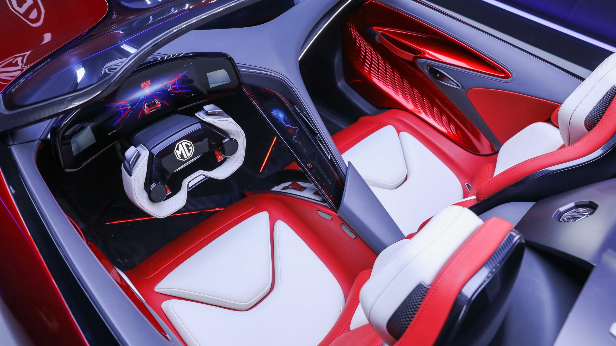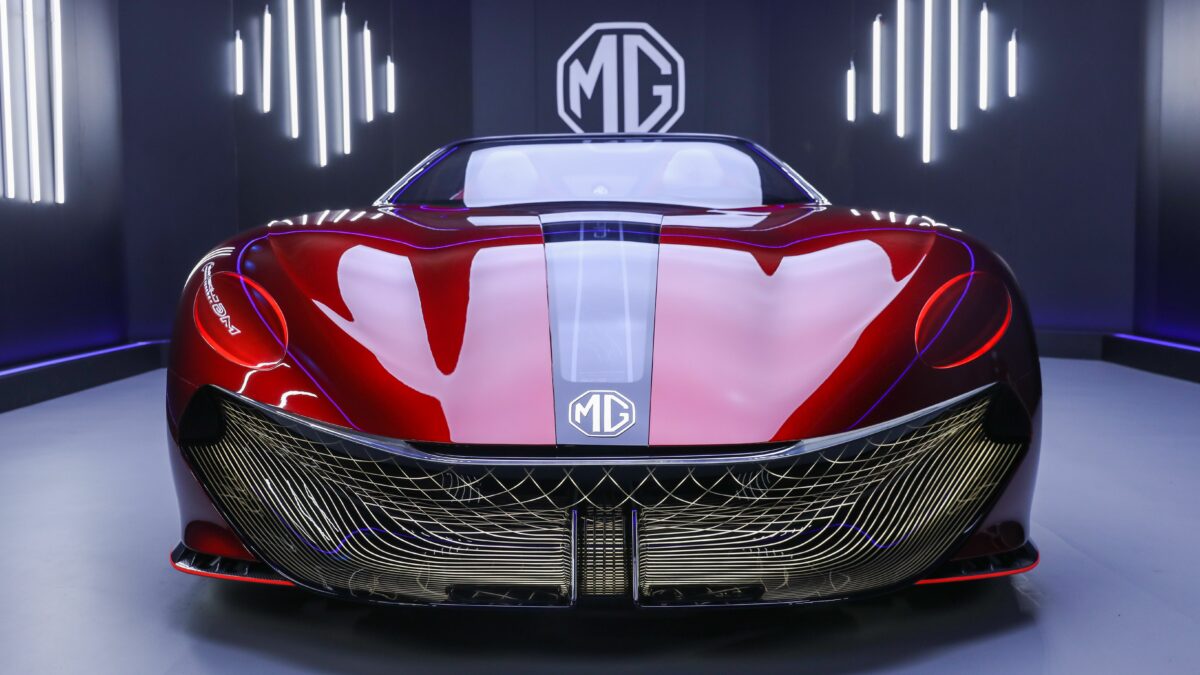 Elöl a bíbor motorháztetőbe integrált, ovális lámpák köszöntik a szemlélőt, amik ráadásul ki is nyílnak bekapcsoláskor (mondhatnánk persze, hogy hasonló formájú volt a Mazda RX-9 koncepció fényszórója, sőt, hasonló volt a mélyvörös fényezés is, de ne legyünk rosszmájúak, adjunk esélyt az MG-nek). Még ütősebb látványt nyújt az első lökhárító: a szemünk által megszokott, majdnem elvárt légbeömlőre itt nincs szükség, de vizuálisan attól még elkülönítik ezt a részt a karosszéria többi elemétől, fekete szín helyett világos árnyalatú, bonyolult mintázatú elemet csináltak belőle. De nem csak a megjelenésnek tesz ez jót, motorhűtés helyett légfüggönyt alakít ki az első kerékjárati ívekben, és a padlólemez alá is bevezeti a levegőt a kedvező aerodinamikai tulajdonságok megteremtése érdekében.