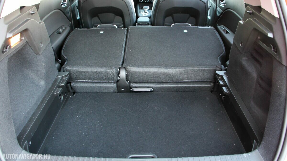 Mielőtt arról beszélnék, hogy milyen vezetni a Capturt, feltétlenül meg kell még emlékezzek a hatalmas hátsó lábtérről, ami egy 180 centis átlagsofőr mögött 27 centinyi, még a középkategóriában is tisztességes térdhelyet jelent. A Captur trükkje a tologatható hátsó üléssor, aminek én mondjuk hatalmas értelmét nem látom, mert alaphelyzetben is elég nagy, 422 literes a csomagtér. Viszont a hátsó üléssor előretolásával már 536 literes, egy kategóriával feljebb is tisztességes teret kapunk, ülésdöntéssel pedig 1,2 köbméternyit. A csomagtér padlója rögzíthető a lehajtott hátsó támlákkal egy szintben és persze rakható alulra is, lehet variálni a térrel.