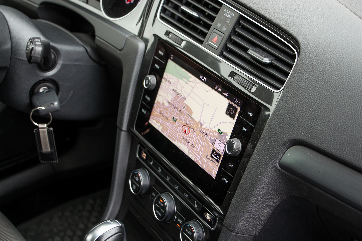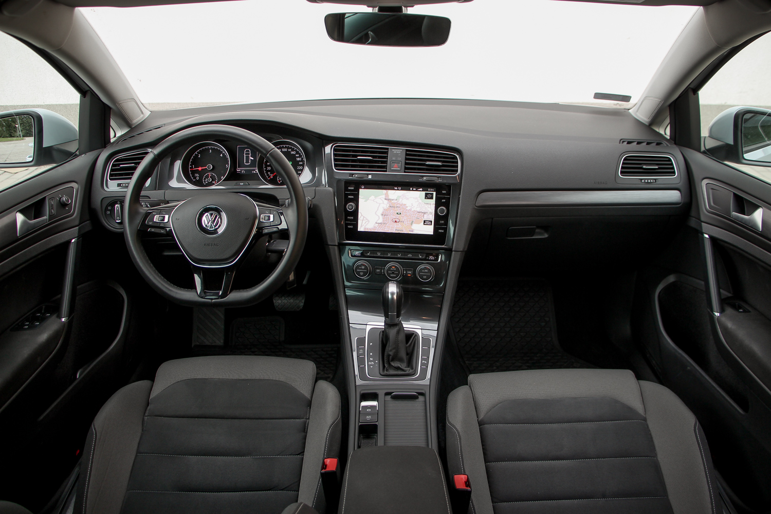 A Golf frissítése új lökhárítókat hozott, hátul kamu kipufogóvégekkel, elöl letisztultabb vonalakkal, valamint hátul már mindenképp LED-esek a fényszórók. Előre felárasak az új, teljesen LED-es lámpák, amiknek a rajzolata jelentősen megváltozott és az alsó részén még a GTI-re emlékeztető méhsejt mintát is megtaláljuk. Kintről ennyi az újítás, egy rendes ráncfelvarrás, semmi több, csak az veszi majd észre, aki akarja. Bent szinte semmi nem változott, az utastér továbbra is logikus elrendezésű, mindent ott találunk, ahol keresnénk, és az ergonómia is egész kellemes. Kormányt az utóbbi időben talán a Volkswagen csinál a legjobban hétköznapi autóba, a formák már kicsit idejétmúltak, persze, hiszen idős már a 7-es Golf, ennél egészen másabb formákkal dolgozik már a Volkswagen. A középső kijelző nem a legújabb, de ez a 8 colos is rendkívül jól kezelhető, valójában nem érzem, hogy jobbra lenne szükség, hiszen másnál még ilyet sem kapunk. A letisztultság jegyében csak két tekerő maradt meg fizikai gombként, az oldalsók már gyűjthetik az értékes ujjlenyomatokat. Gyors, nem kell várni semmire, hogy betöltsön, és a navigáció képe is remek.