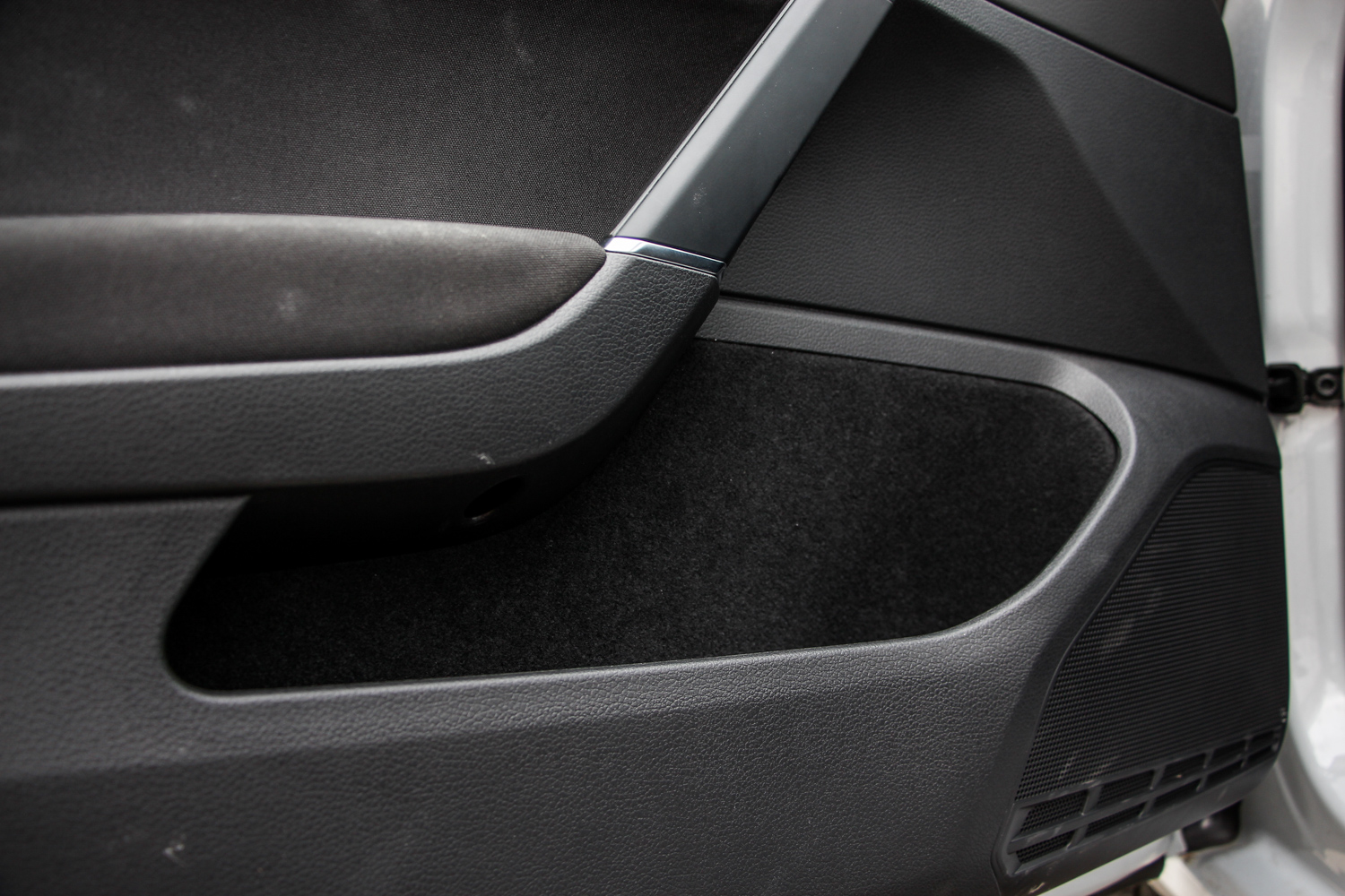 Különös az összeállítás, hisz a halálunalmas megjelenés mellé sportüléseket rendeltek, ráadásul a vezetőé ergoActive, vagyis elektromos állítású, állítható comb és deréktámaszos, valamint masszírozni is tud. Jól mutat az Alcantara középrész, a tartása is megfelelő, elég jól be lehet állítani, de hanyatt nem vágtam magam tőle, szimplán jó. Mondjuk, valahol ezen a ponton kezdtem el vizsgálni az anyagokat – előtte nem volt dolgom Golffal – és például az első és hátsó ajtókárpit között ordító a különbség. Hátul fájdalmasan kemények a műanyagok, elöl vállalható, de az elkoszolódott szövettől menekülni tudtam volna, a kárpitozott zsebek viszont jók. Minden hely komfortos, nem lesz panasz sehol, a kényelmet pedig egész jó hangszigetelés fokozza, ami által az 1,6-os dízelmotor kerregése is csak minimálisan hatol be.
