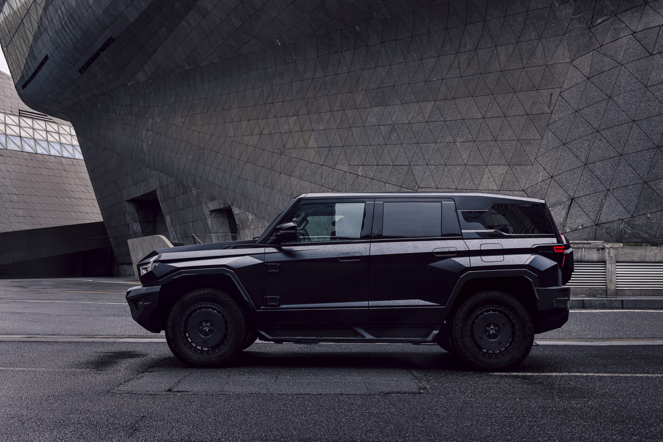 Az alaphelyzetben is 23 centiméteres hasmagasság (amely terep módban 33,5 centire módosul) miatt óriásinak tűnik, viszont a számok valamelyest árnyalják a képet. 4,99 méter hosszú, 2,08 méter széles, 1,94 méter magas, a tengelytávja pedig 2,95 méter hosszú. Ennél egy fokkal meghökkentőbb a saját tömege, amely 3293 kilogrammra rúg az elektromos kivitel esetében, de a REV (range extended electric vehicle = hatótávnövelő belső égésű motorral felszerelt elektromos gépjármű) esetében is 3130 kilogramm. Szóval minden szempontból jókora helyet követel magának, de azért nem olyan óriási, mint amilyennek látszik.Mi hajtja?