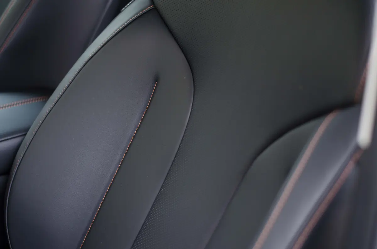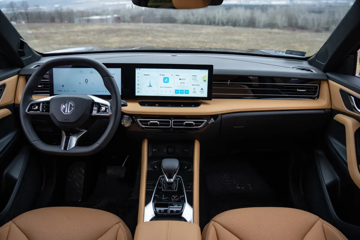 Az utastérben is a modern trendeket követi az MG a közös üveglap mögé helyezett, egyenként 12,3 colos kijelzőkkel, ám nekem a régi, klasszikus műszerfalforma a lekerekített szélű, besüllyesztett óracsoporttal sokkal jobban tetszett. Fontos újítás az alacsonyabb felszereltségi szinten a szövet ülésgarnitúra, a drágább csomag fekete Ecobőrrel érkezik. Extraként sem kérhető viszont vörös bőrbelső, ami számomra az elődöt igazán vonzóvá tette, helyette egy visszafogottabb, és jóval kevésbé megosztó „aranyhomok” fantázianevű barna a feláras szín. Szerencsére mindkét jelenlegi opciót volt lehetőségem kipróbálni: tapintás és minőségérzet terén nagyjából egyforma a kettő, ám a barna jóval hangulatosabb.