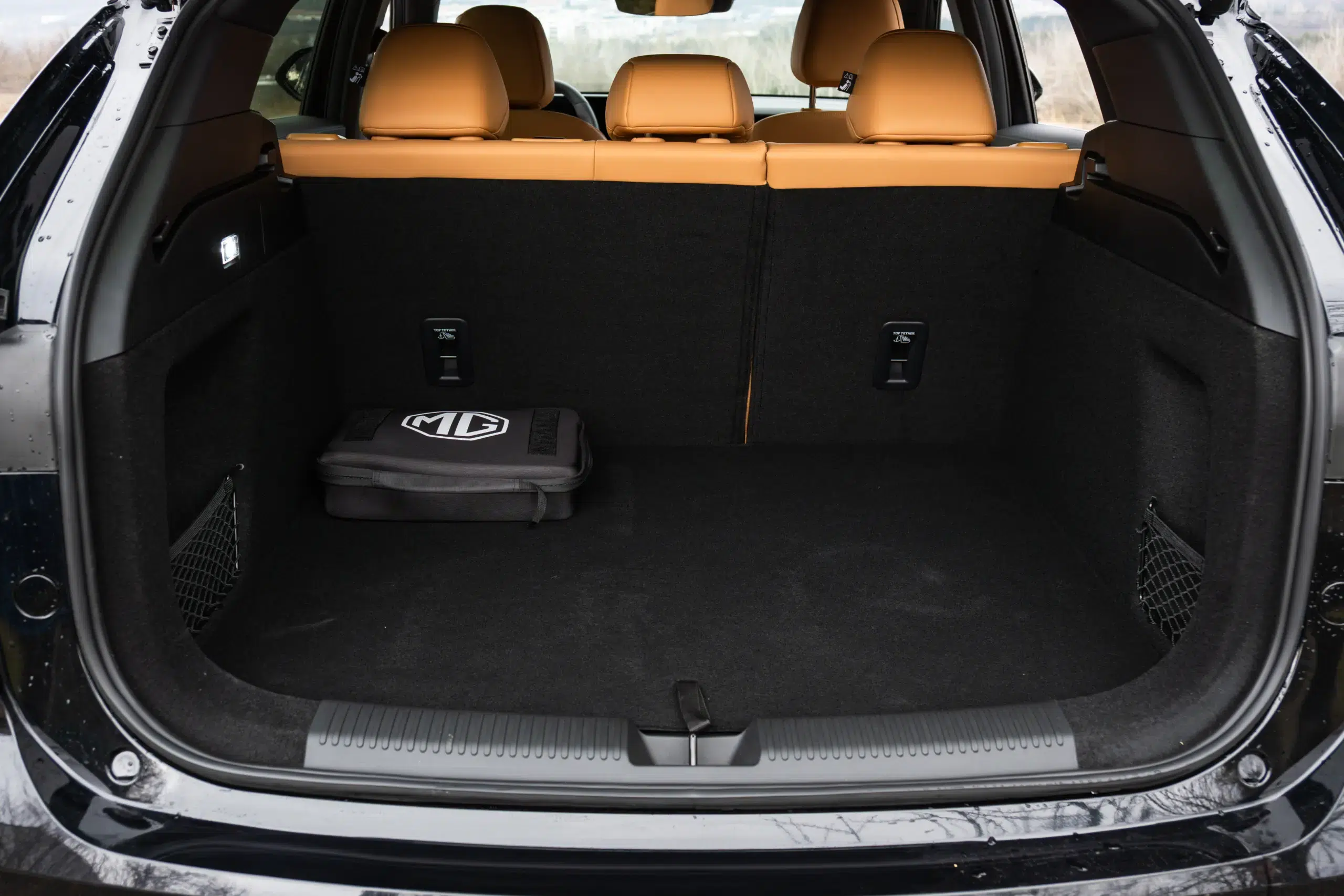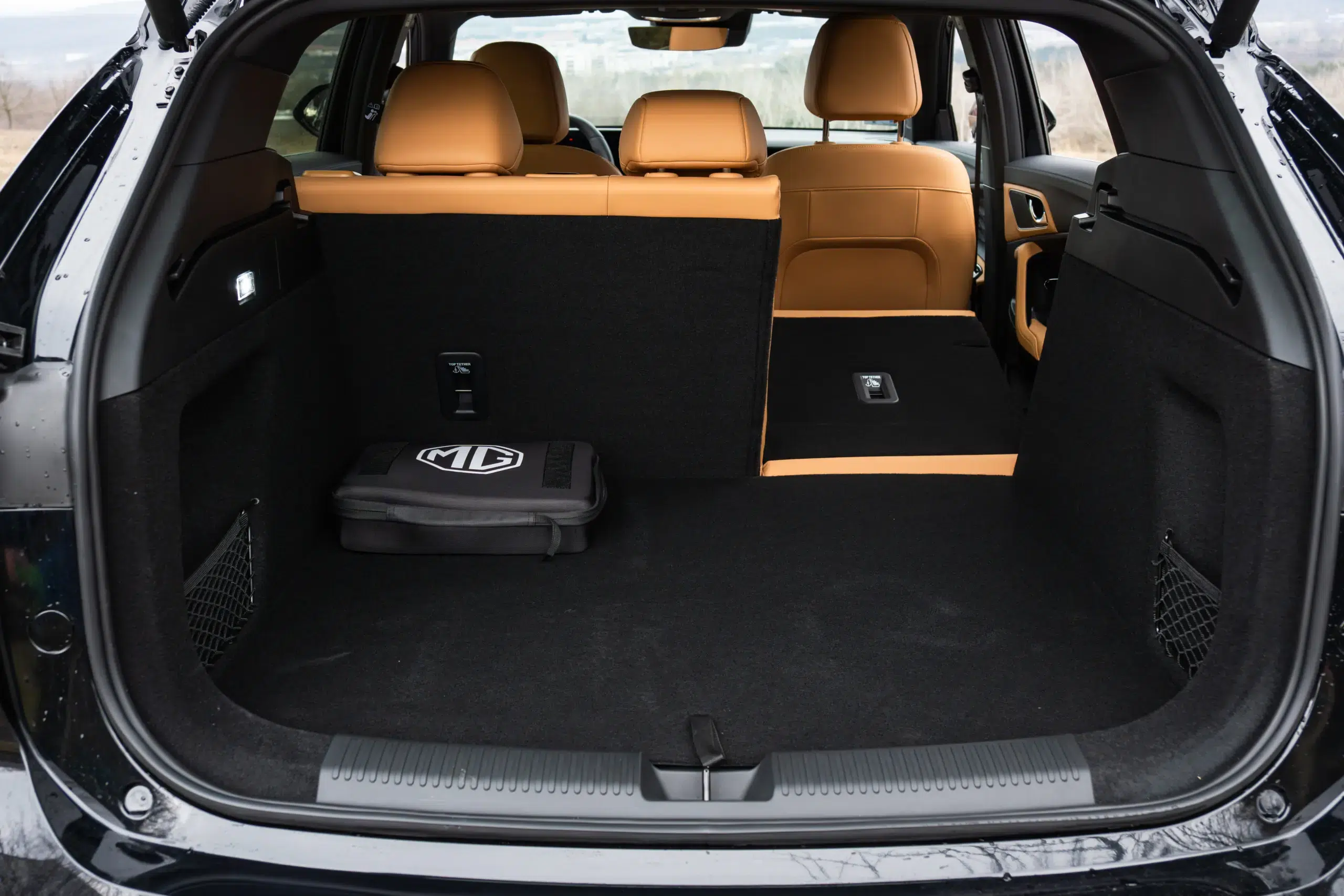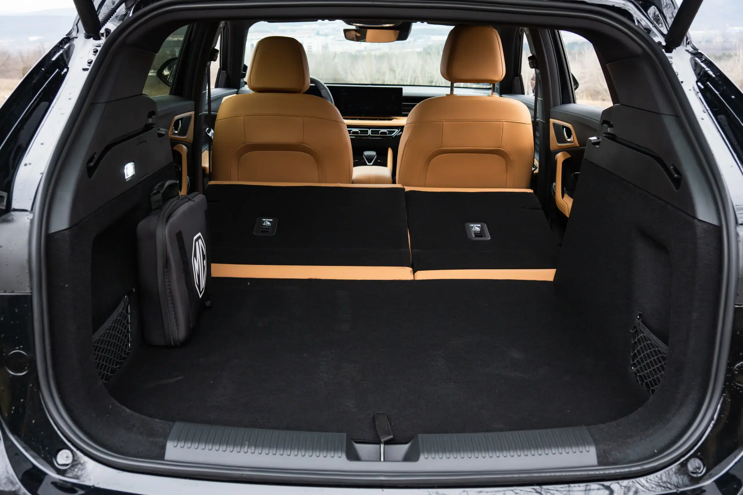 Az utastérben is a modern trendeket követi az MG a közös üveglap mögé helyezett, egyenként 12,3 colos kijelzőkkel, ám nekem a régi, klasszikus műszerfalforma a lekerekített szélű, besüllyesztett óracsoporttal sokkal jobban tetszett. Fontos újítás az alacsonyabb felszereltségi szinten a szövet ülésgarnitúra, a drágább csomag fekete Ecobőrrel érkezik. Extraként sem kérhető viszont vörös bőrbelső, ami számomra az elődöt igazán vonzóvá tette, helyette egy visszafogottabb, és jóval kevésbé megosztó „aranyhomok” fantázianevű barna a feláras szín. Szerencsére mindkét jelenlegi opciót volt lehetőségem kipróbálni: tapintás és minőségérzet terén nagyjából egyforma a kettő, ám a barna jóval hangulatosabb.