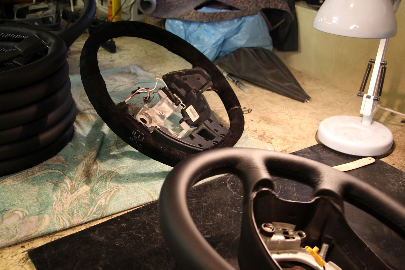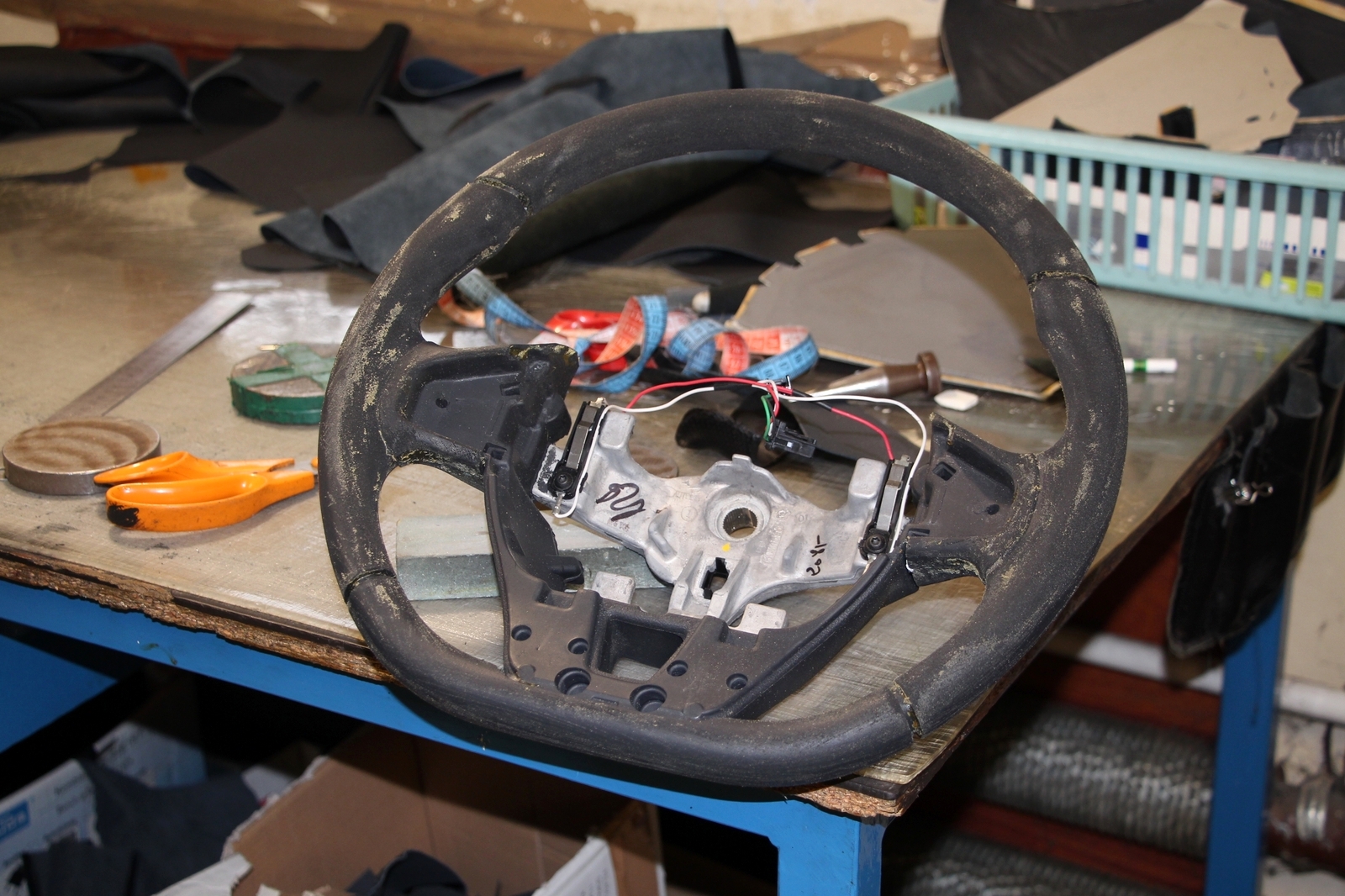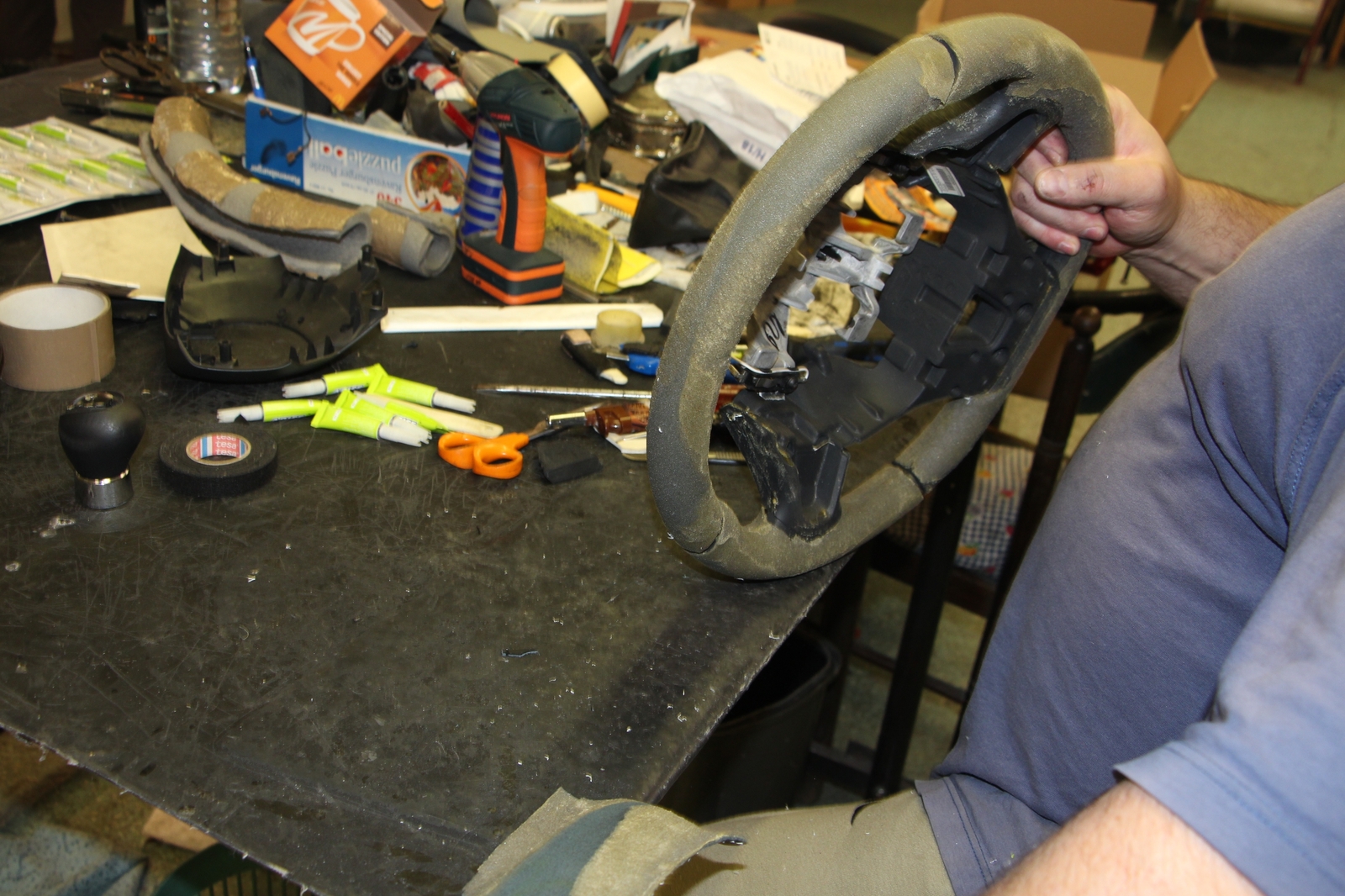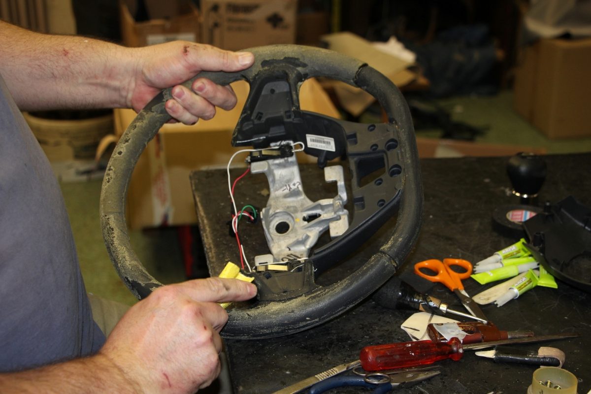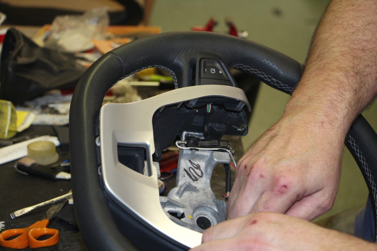 A munka első lépései a bontási munkálatok, minden műanyag elem, kapcsoló, ha van gyári bőrhuzat, az is lekerül a volánról
