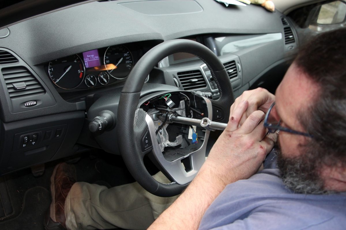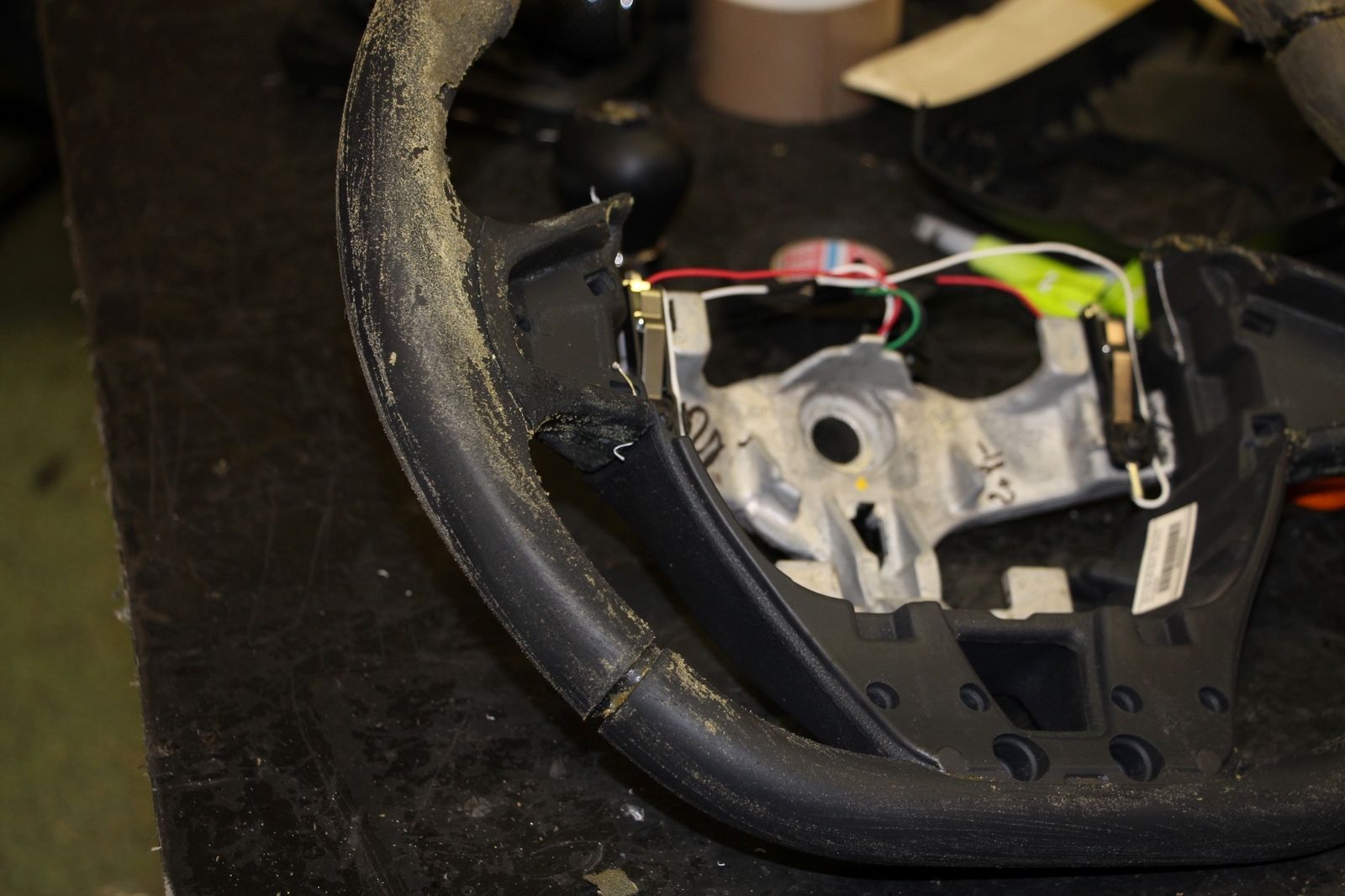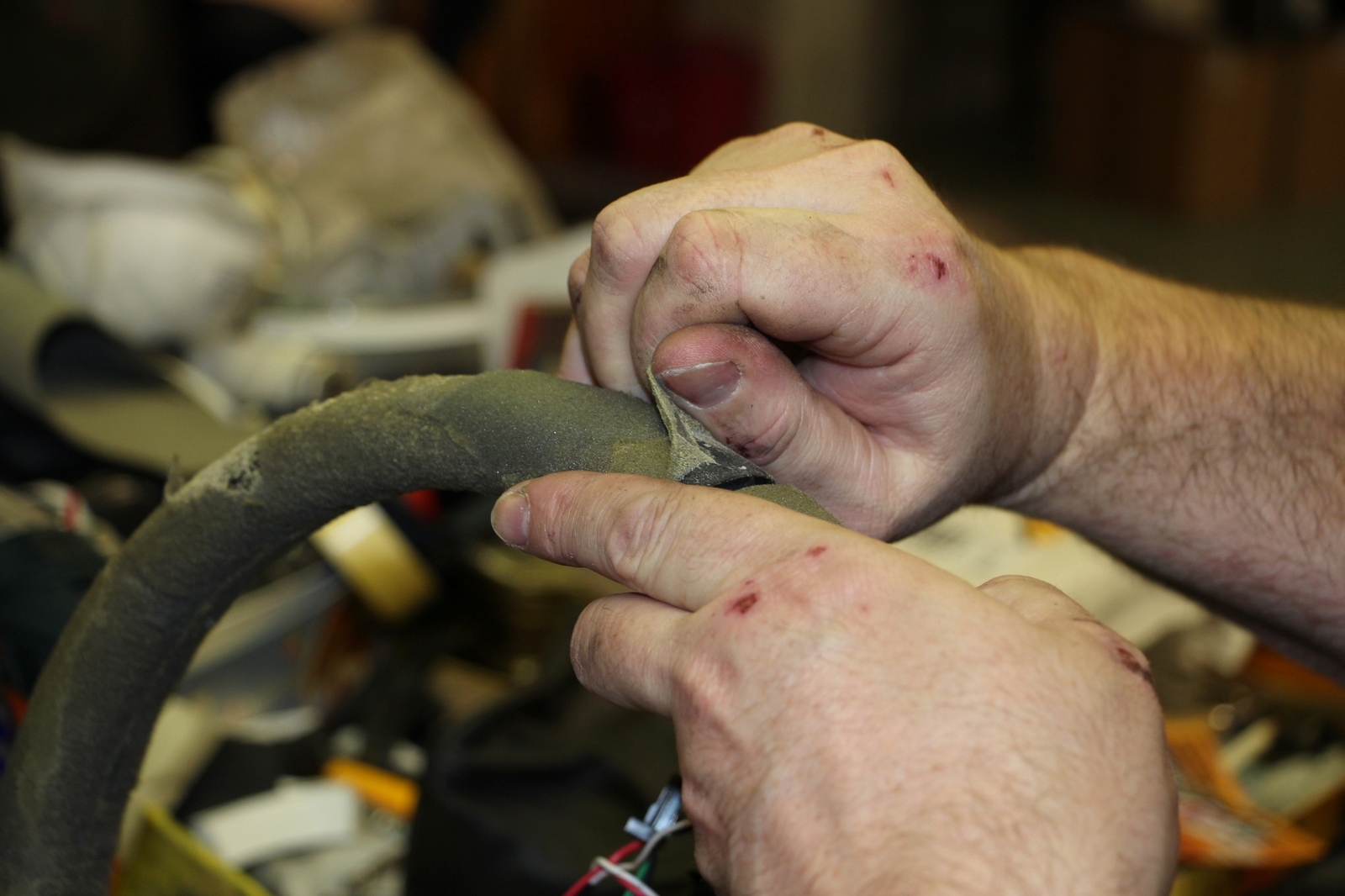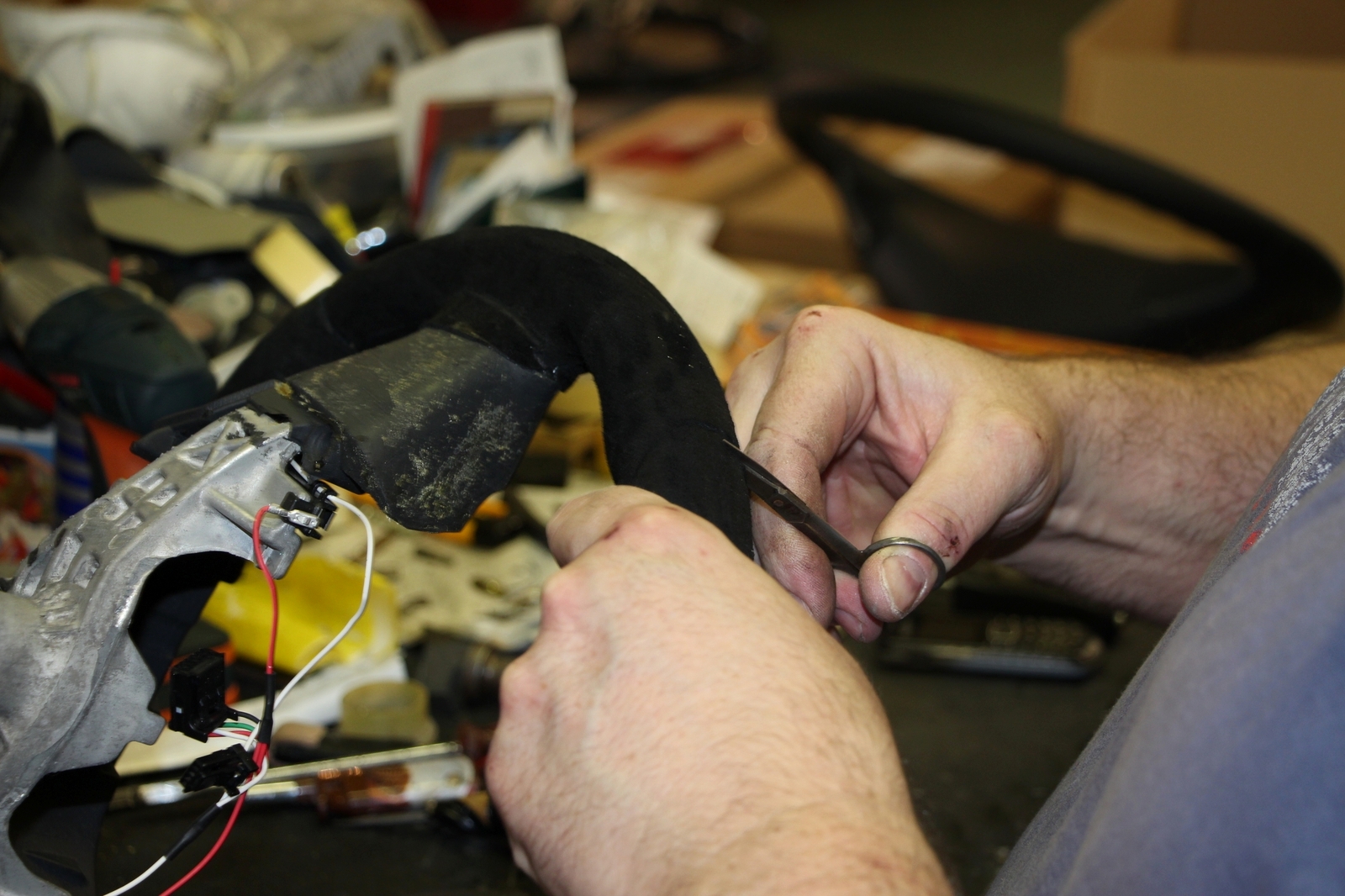 A munka első lépései a bontási munkálatok, minden műanyag elem, kapcsoló, ha van gyári bőrhuzat, az is lekerül a volánról