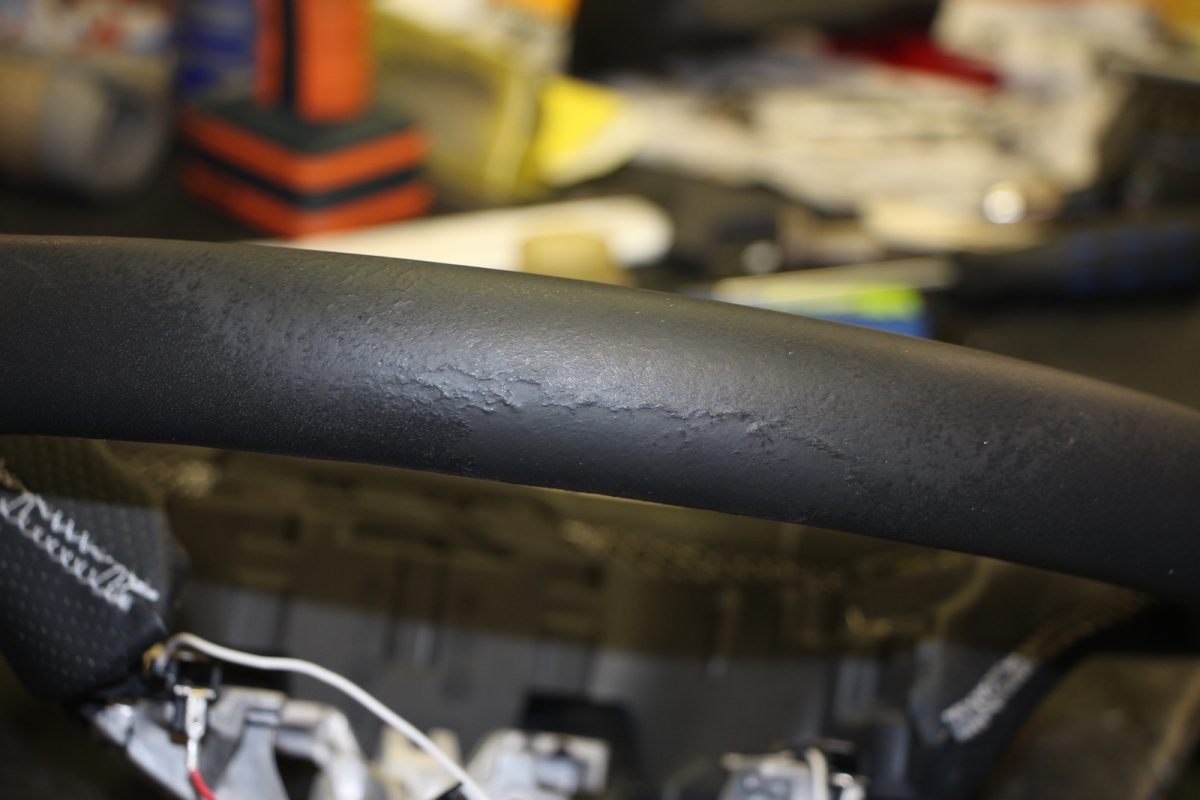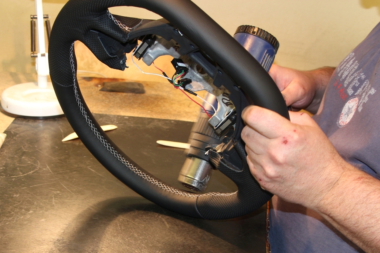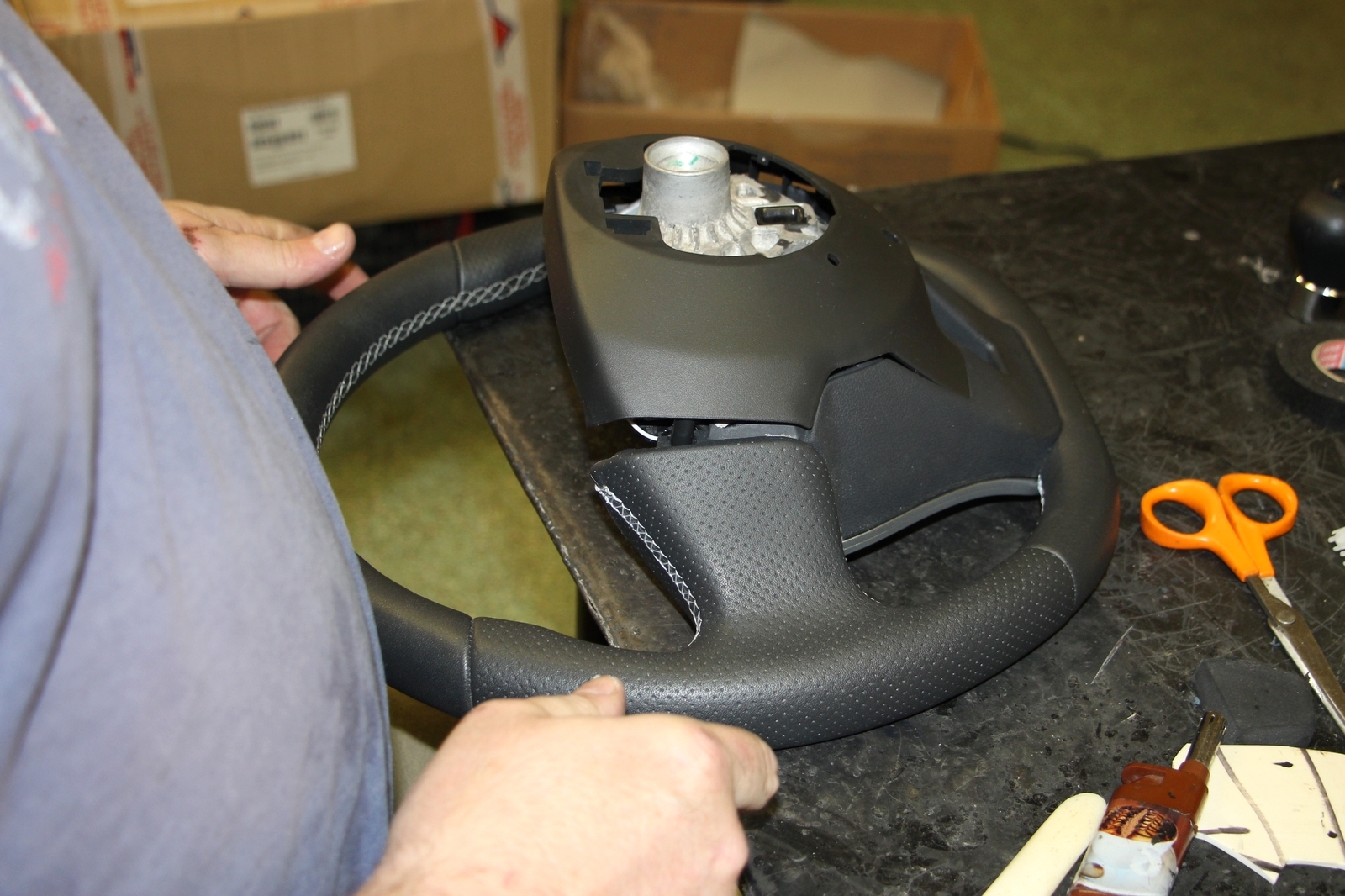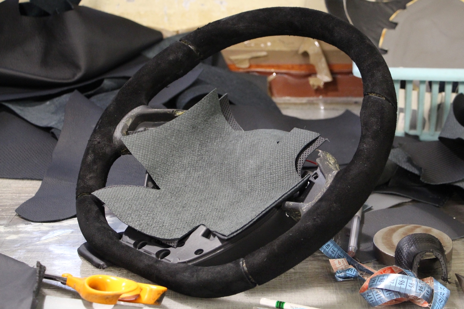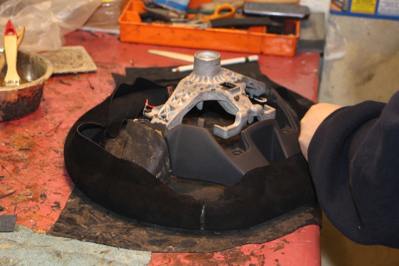 Miután a gyári bőr lekerült, illetve amíg az új részek kivágásra kerülnek, addig a bőrözendő felület is előkészítésre kerül. A kormánykerékről minden puha réteget, az esetlegesen ráragasztott szivacsozást is letisztítják, ez a Renault kormánya esetén komoly munka volt, a gyárilag rárakott réteg ugyanis csak szakadva, darabokban, végül csiszolással jött le. Az utolsó lépés természetesen a zsírtalanítás, de erősen kopott kormányoknál akár a hiányok pótlására is szükség lehet. A bőr alá – és a kemény műanyagkarima közé – puha réteg, egy velúros anyag kerül. A kormánykerékre azt ragasztják, arra pedig a bőrt.