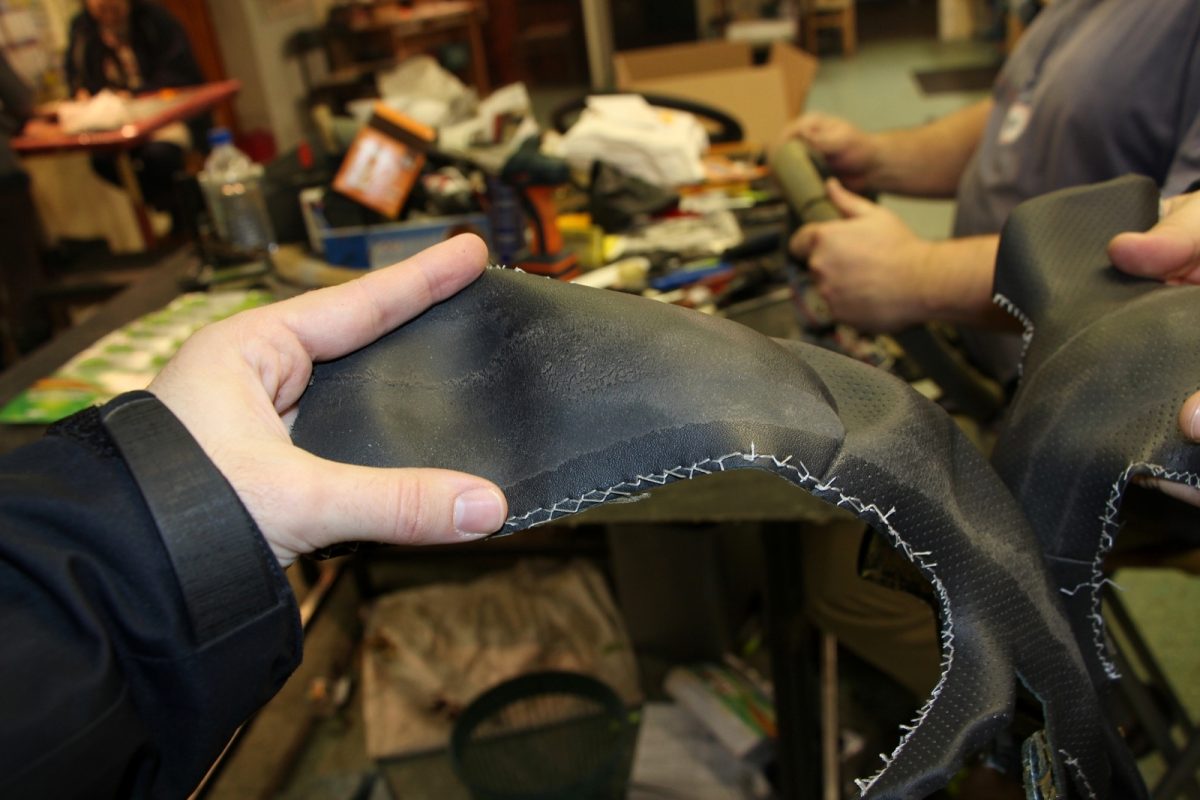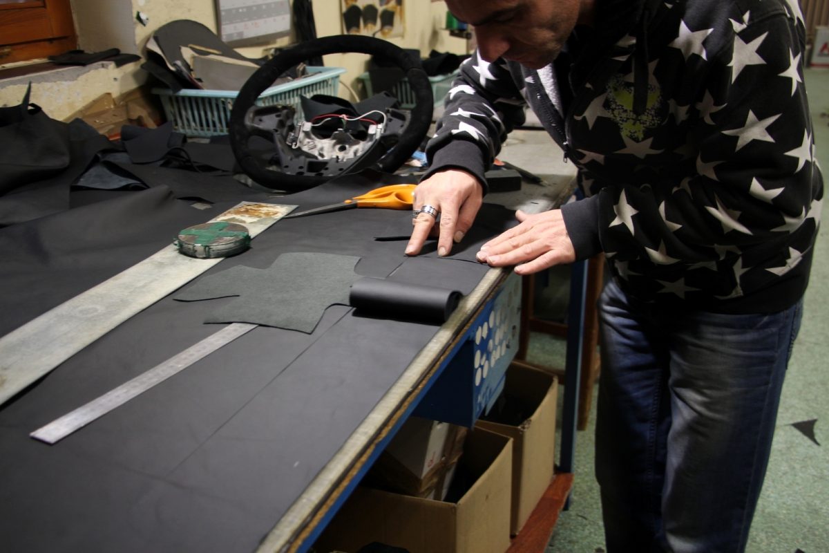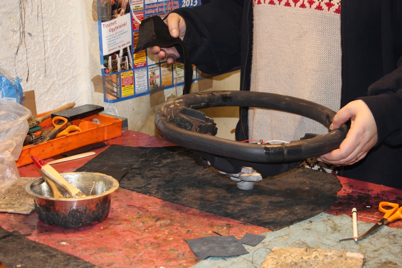 December végén ugyanoda mentünk a Lagunával, ahol az MX-5 kormánykerekét is csináltatta kollégánk. Reklám, de leírjuk, a kecskeméti Fell-ser Kft-hez. A kecskeméti műhely egy kisebbfajta csoda. Egy kertes ház udvarán lévő apró családi vállalkozás, illetve több annál. Egy igazi manufaktúra, ami már Európa legtöbb autógyártója számára is készített bőrkormányokat, folyamatosan gyárt a motorsportban alkalmazott egyedi kormánykerekeket (túlnyomórészt külföldre), illetve bármilyen, akár műanyag, vagy megkopott bőrkormányos autóhoz csinál a gyárival egyező új, vagy akár egyedi bevonatot. Lehet válogatni a színek közül - a bőröknél és a cérnáknál is, lehet kérni perforált vagy hagyományos bőrt, ami természetesen nem csak a kormánykerékre, a váltógombra, illetve a váltószoknyára is kerülhet.