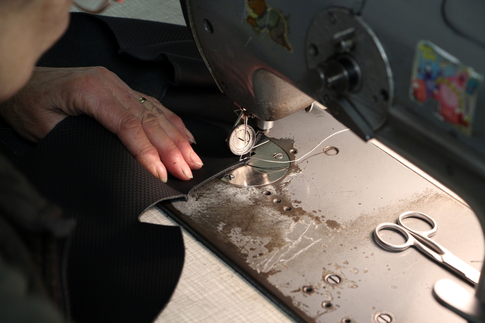 Talán a munka leglátványosabb része a varrás, a széleiknél végigszegett bőröket keresztöltéssel feszítik a karimára. Mindezt villámgyorsan, utóbbit kézzel végezve