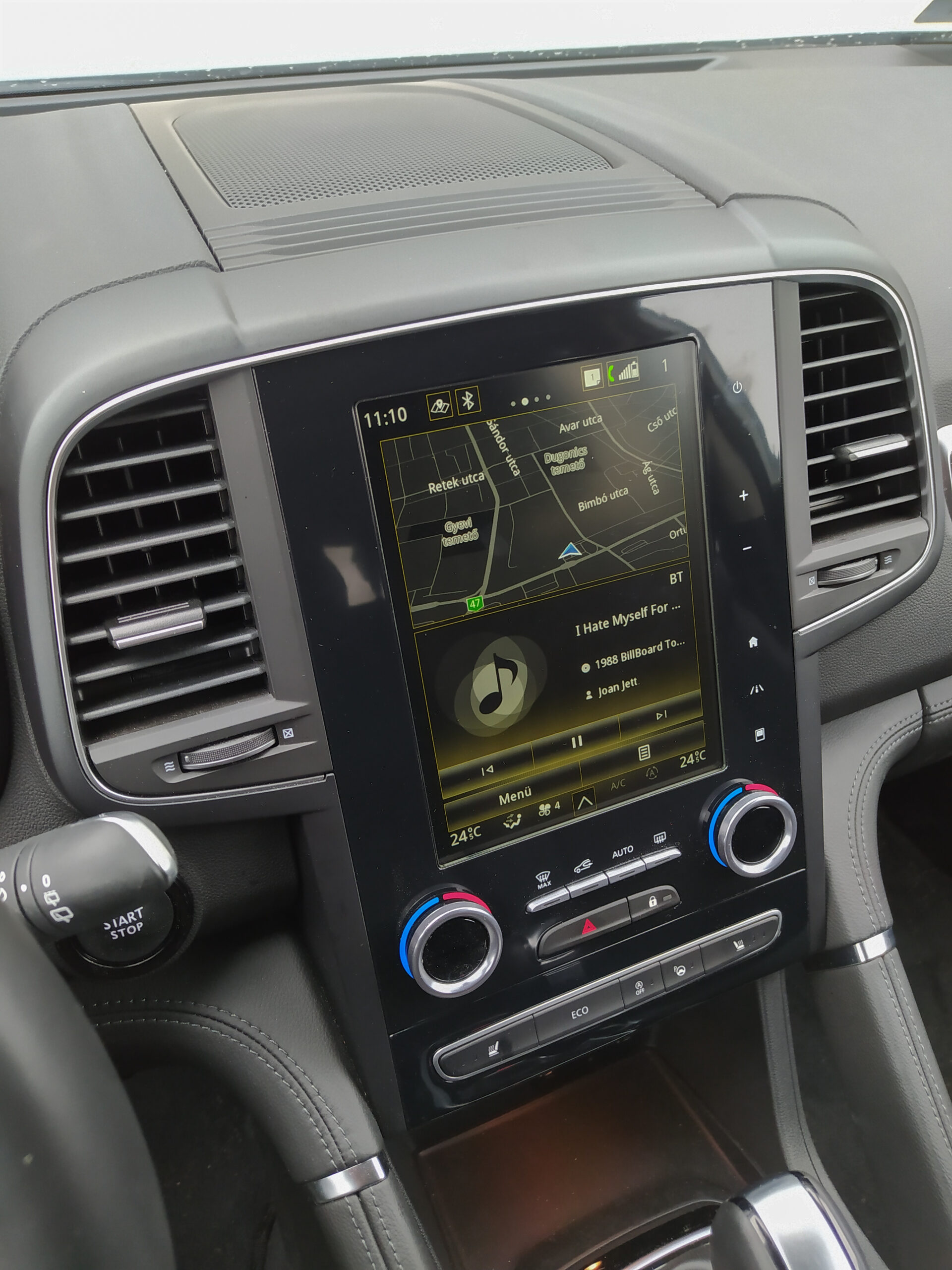 Érdekessége, hogy hátul is tud ülésfűtést, illetve a párnázottság és az ülések anyagminősége sem rosszabb a második sorban. Elölről a feláras, elektromos és memóriás foteleket nem hiányoltam, csak az állítható deréktámasz miatt választanám őket az alap ülések helyett. Amilyen puhák az említett ülések, annyira kemény és feszes viszont a futómű: a Koleos ezen a téren egy igazi SUV érzetét kelti. Hasonlóképp működik a kilátás, magasan ülsz, így távolra remekül látni belőle, közelre már annál kevésbé. Sajnos, ha magunk tervezünk parkolni, akkor ebben 360 fokos kamera nem segít, szenzorokkal és tolatókamerával kell beérni. Van viszont félautomata parkolás, ami hibátlanul és viszonylag gyorsan megoldja a problémát, akadhat, akinek szüksége lesz erre egy ekkora modellnél.