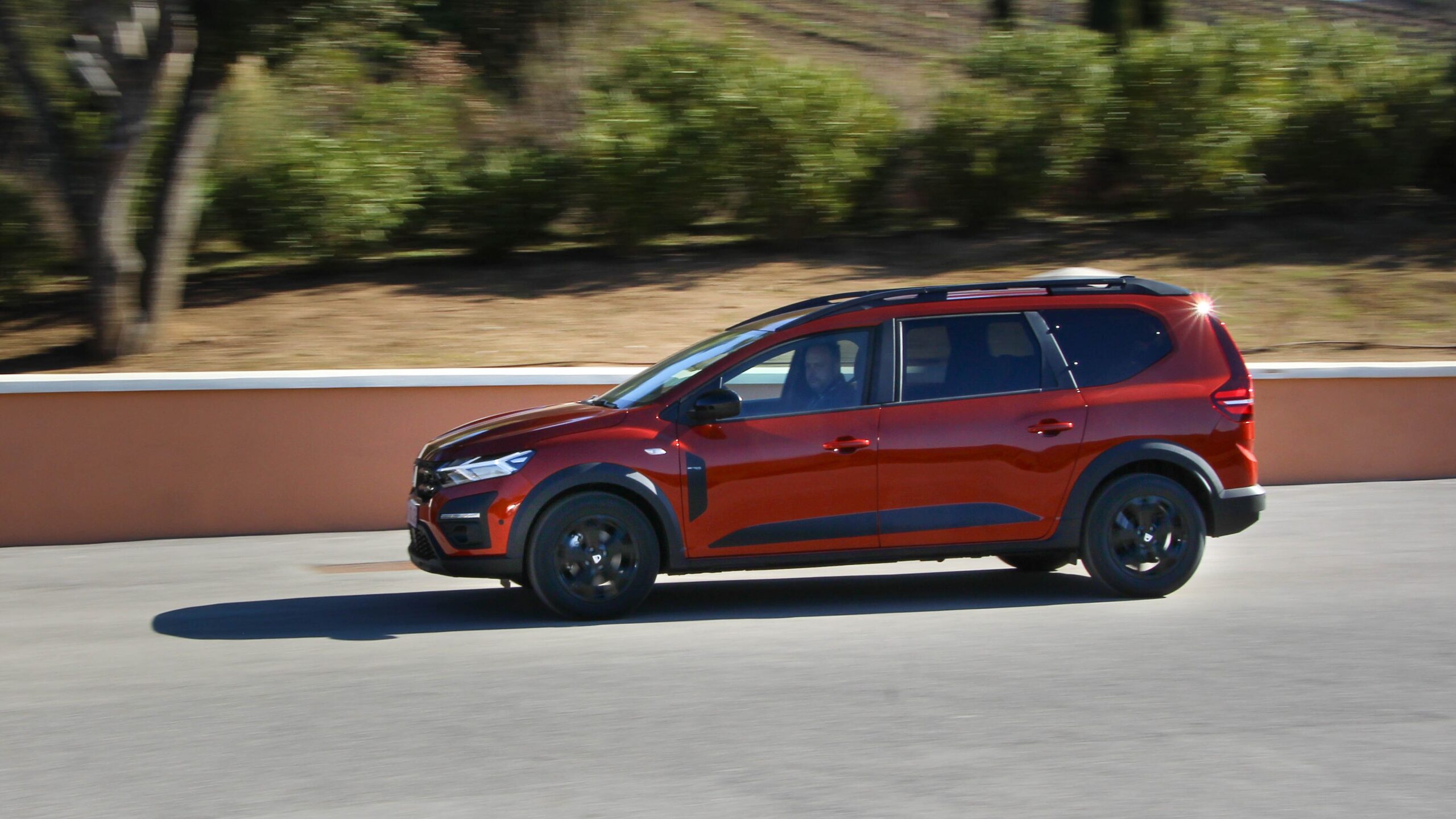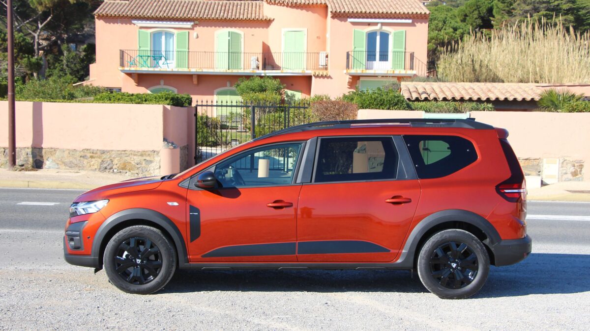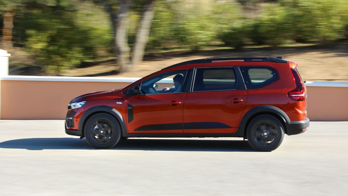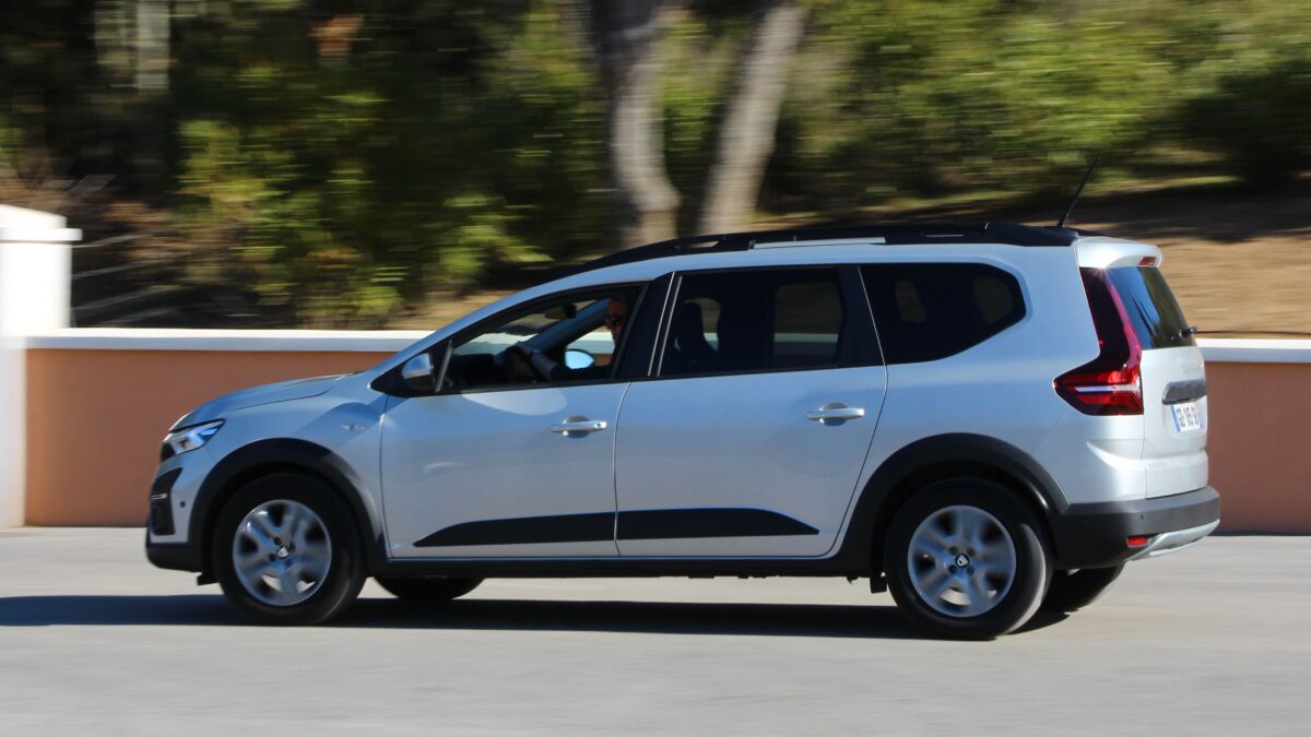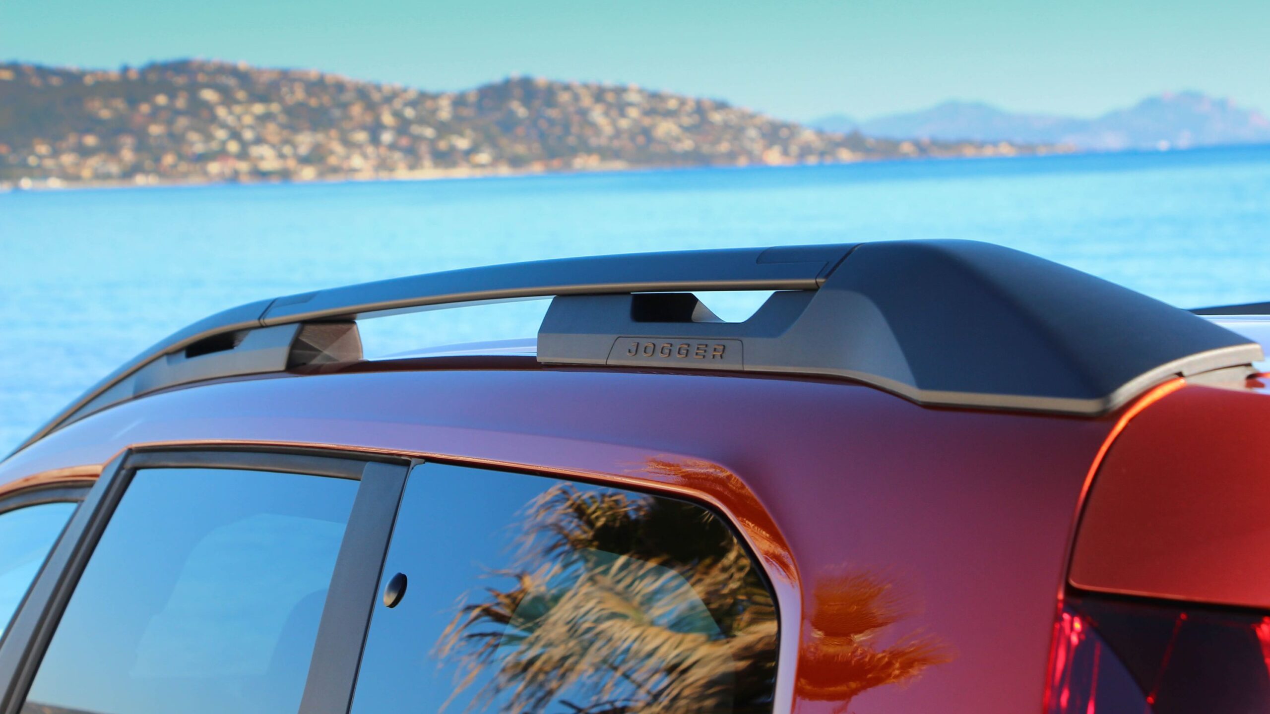 Először fejezzük be az autó körbejárását! Oldalról is érdekes, a kombik és az egyterűek stíluselemei keverednek benne, ahogy azt az elődjein is láthattuk. A B-oszlopnál megemelkedik a tetővonal, amit nem is akartak titkolni, látványos a lépcső a díszbetét felett. Izgalmasak a sárvédő-domborulatok, viszont a koptatócsíkok csak matricák, nem igazi műanyag elemek. Ugyanakkor szinte fel sem tűnnek a tetőrudak, hiszen olyan szépen illeszkednek az összképbe, meg hát egy valamire való kombiról, vagy egyterűről amúgy sem hiányozhatnak. Igen ám, de a Joggeren úgynevezett moduláris tetőrudak találhatók, amelyek keresztbefordíthatóak, így adva tetőcsomagtartót. Említést érdemel a “legvadabb” karosszériaszín, a terrakotta barna is, amelyért 160 ezer forintos felárat kérnek, ám Extreme felszereltségi szinttel már járnak a fekete, 16 colos könnyűfém felnik is, habként a dizájntortán. Szerencsére a vásárlók egyre bátrabbak a színválasztás terén, ami jól mutatja azt is, hogy most már nem akarják az ügyfelek titkolni a világ elől, hogy Daciát vásároltak, sokkal inkább büszkén megmutatnák. Magyarán már nem csak a száraz racionalitás a legfontosabb tényező egy Dacia vásárlásakor, most már bizony a szív is megdobban.