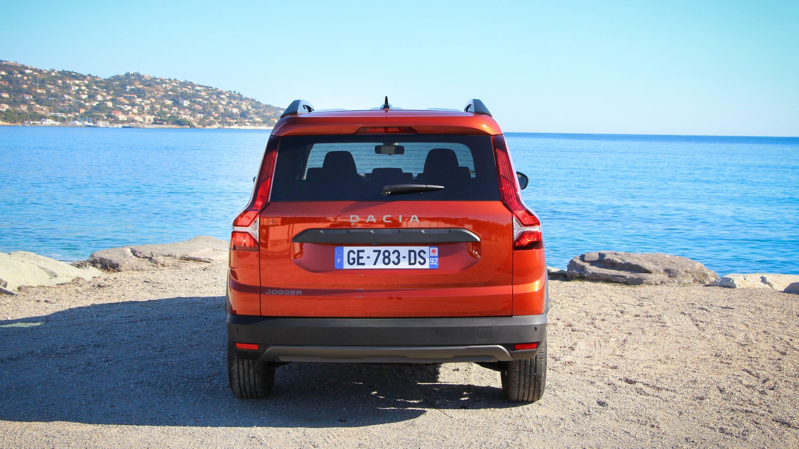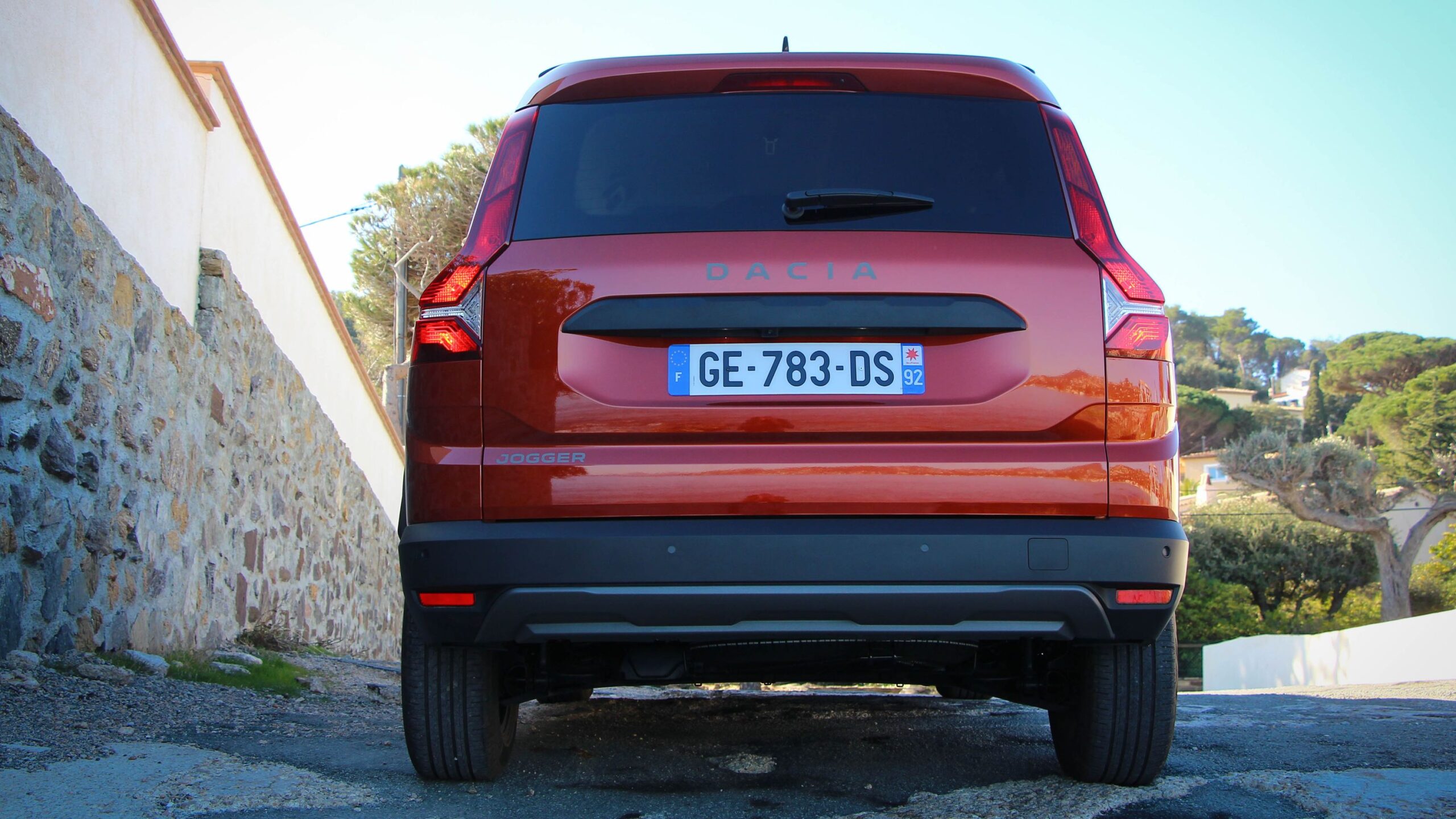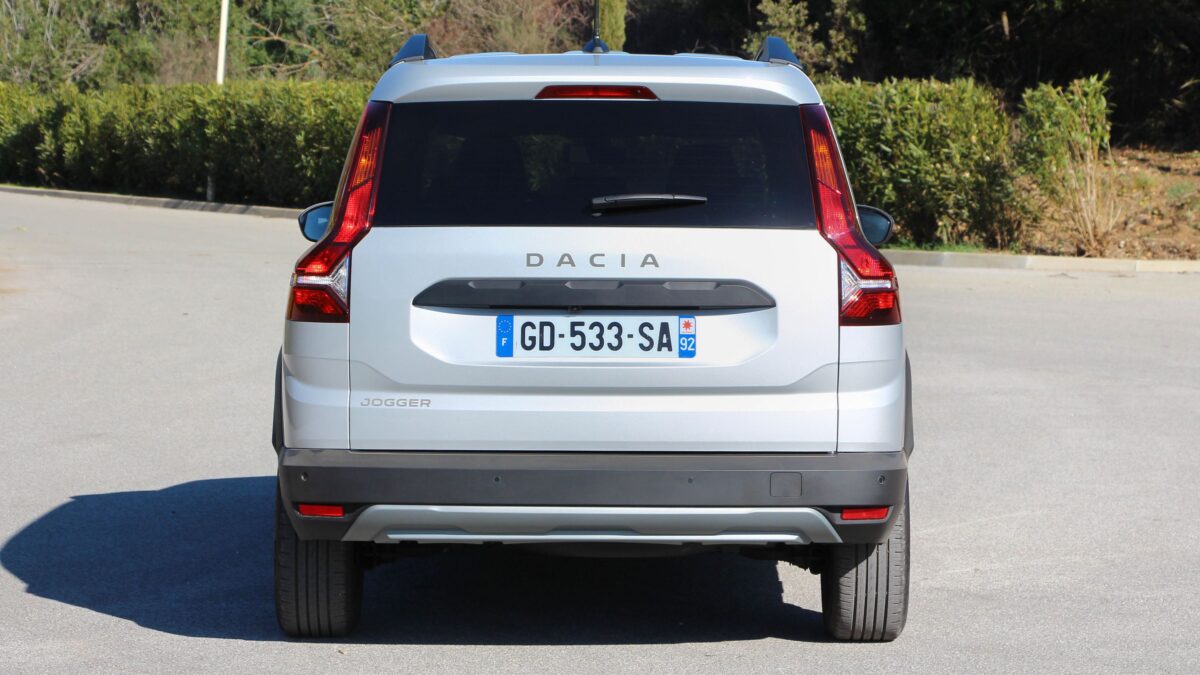 Végül eljutottunk hátra, ahol nehéz nem belelátni egy Volvót a hátsó lámpák kialakítása miatt, ám ez nem baj, hiszen egy prémium márka modelljéhez hasonlónak lenni nem bűn. A fekete, fényezetlen sárvédőívek pedig itt folytatódnak fekete lökhárítóban, ami azért kapott egy ezüst dekorelemet is, a márkanevet pedig büszkén kiírták jó nagy betűkkel középre. Amit még nem említettem, az a CMF-B platform, erre épül ugyanis a Jogger, ami jelenleg a Dacia kínálatának leghosszabb modellje, a maga 2,9 méteres tengelytávolságával és 4,55 méter hosszú karosszériájával. Elődjéhez képest megnövelték a hátsó ajtók hosszát, így könnyebben tudnak beszállni a hátul utazók.