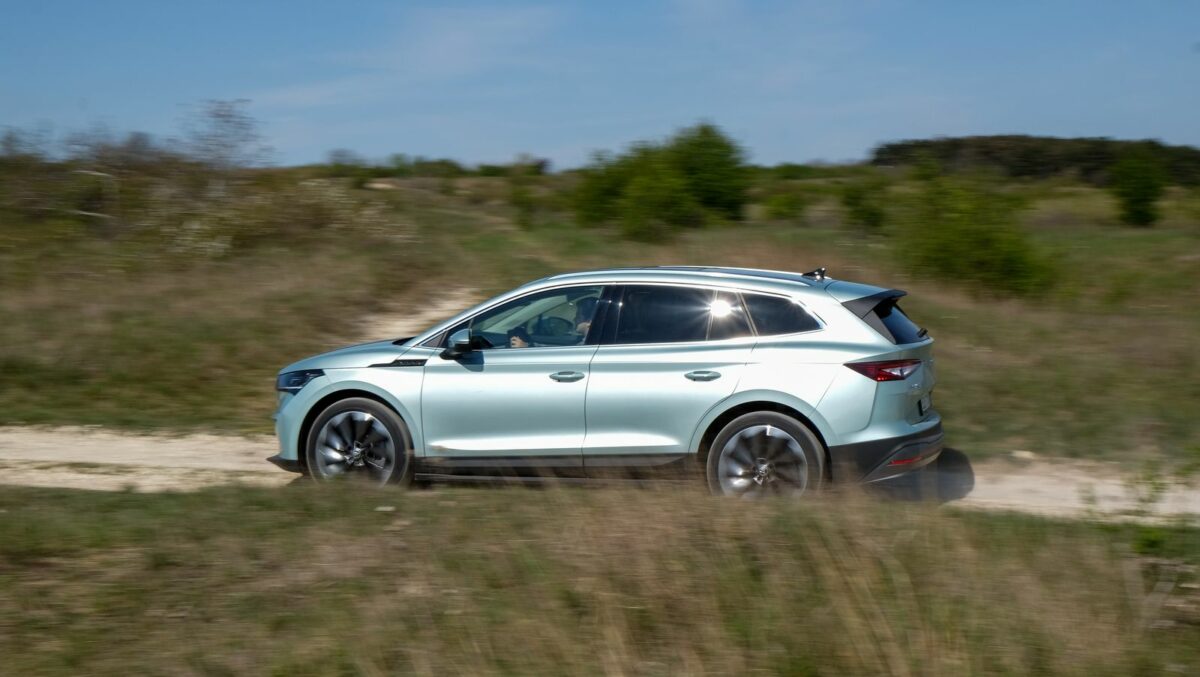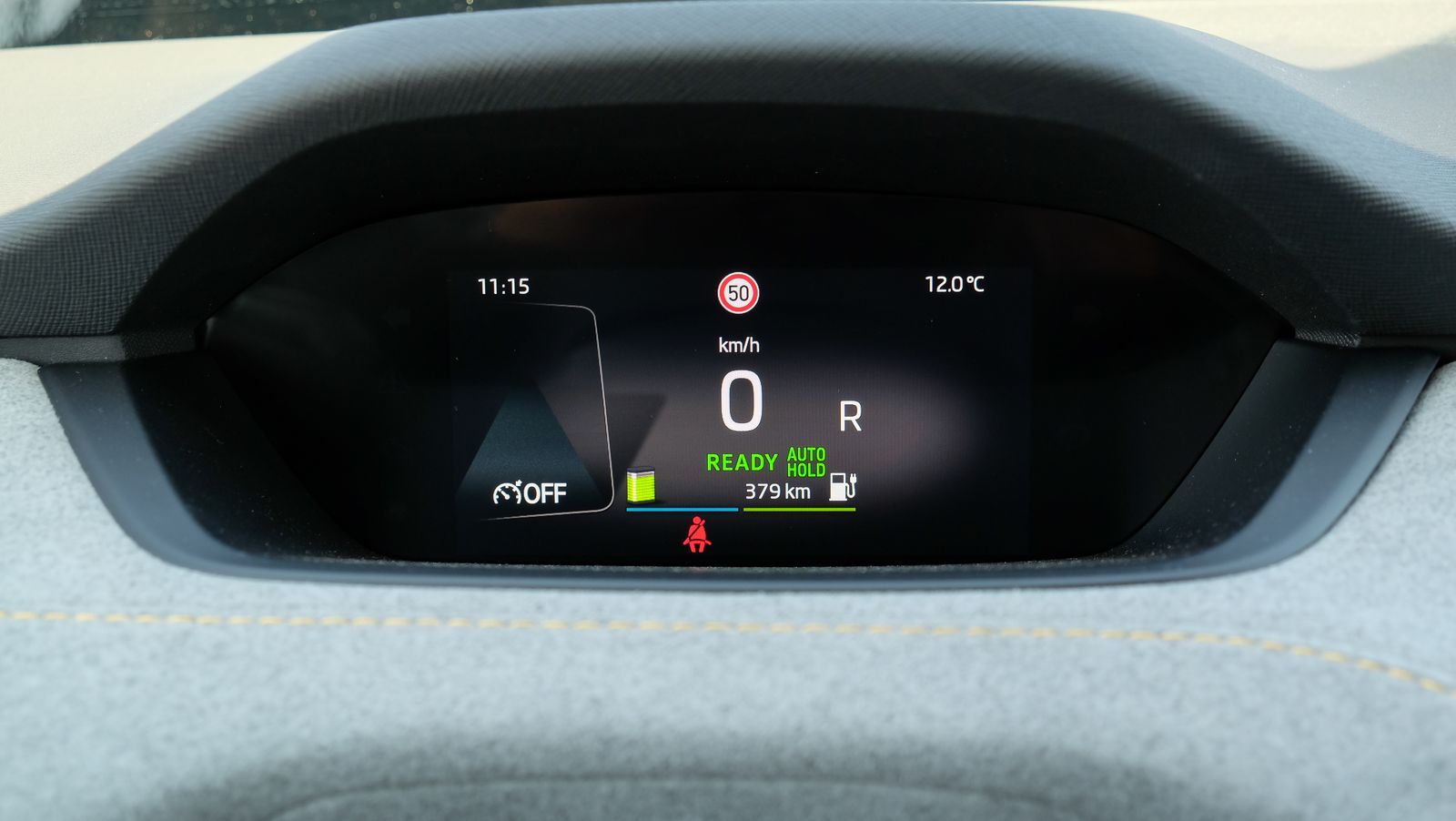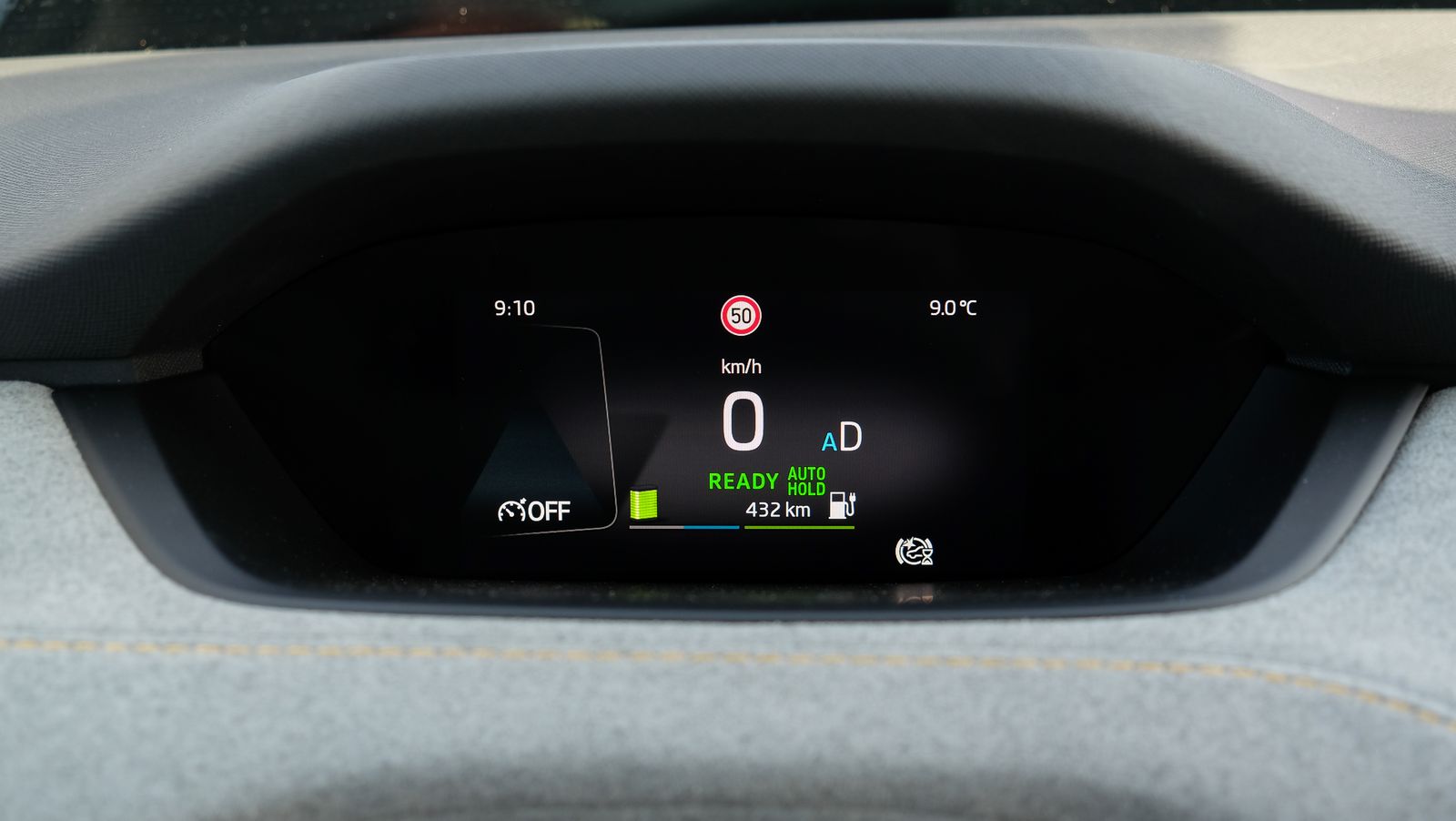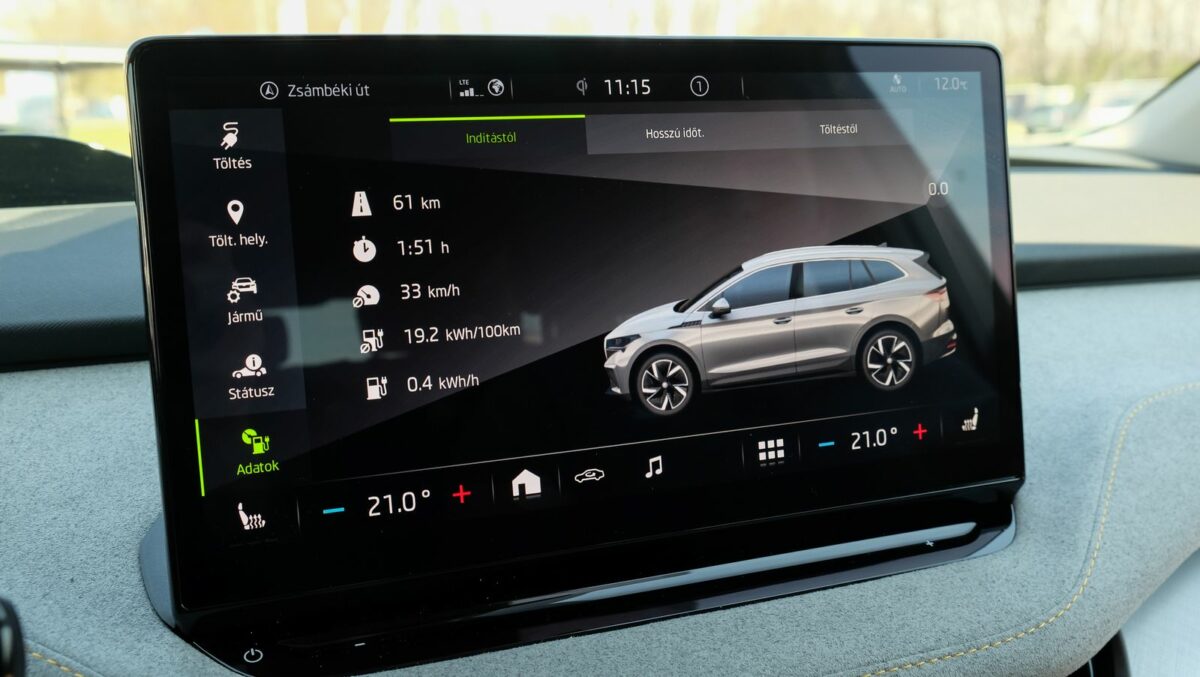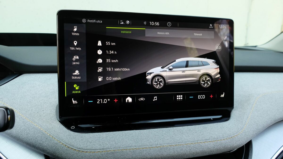 A kormánykerék vágott aljú, az Octaviából ismerős, a váltókapcsoló pedig új, tényleg csak egy kis gomb, az előre- és hátramenet mellett fokozott visszatöltést adó B-mód is kapcsolható, de a visszatöltés mértéke a kormány mögötti fülekkel is szabályozható, sőt a navigáció alapján magától is hangolódhat. A 204 lóerős, 310 Nm nyomatékú villanymotor 8,5 másodperces 100-ra gyorsulása még nem fájdalmas, de már kellően az ülésbe préselő, a végsebességet az RS verzió kivételével 160 km/órában maximalizálták a csehek, ami a villanyautók körében viszonylag magas érték. A dinamika nem csak 100-ig van meg, felette is, igaz sokkal feljebb nem mehettünk, hiszen a tesztút nem tartalmazott autópályát.