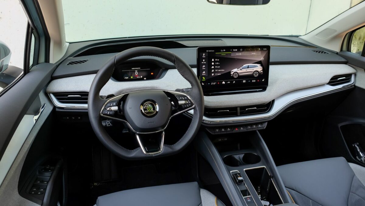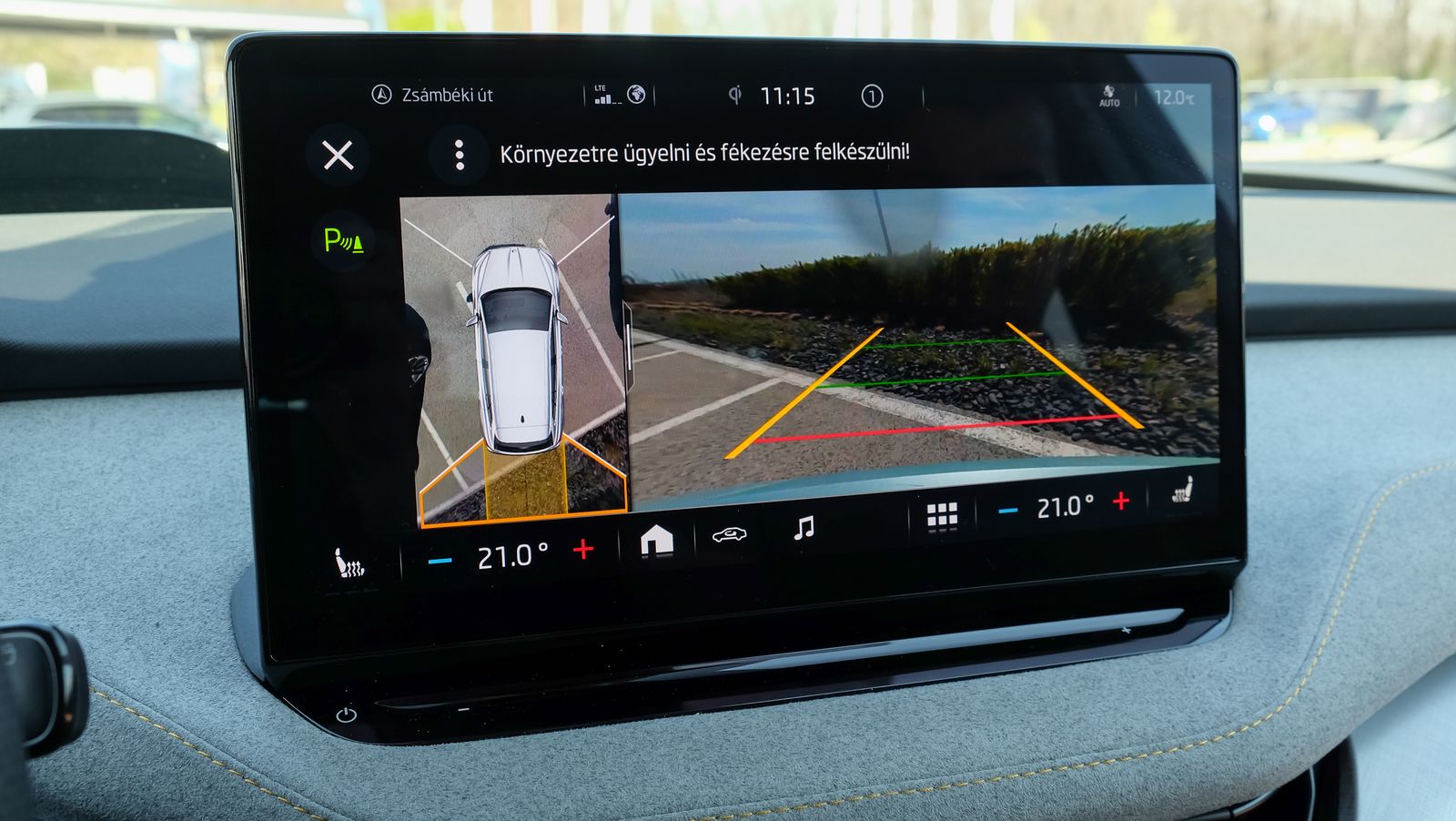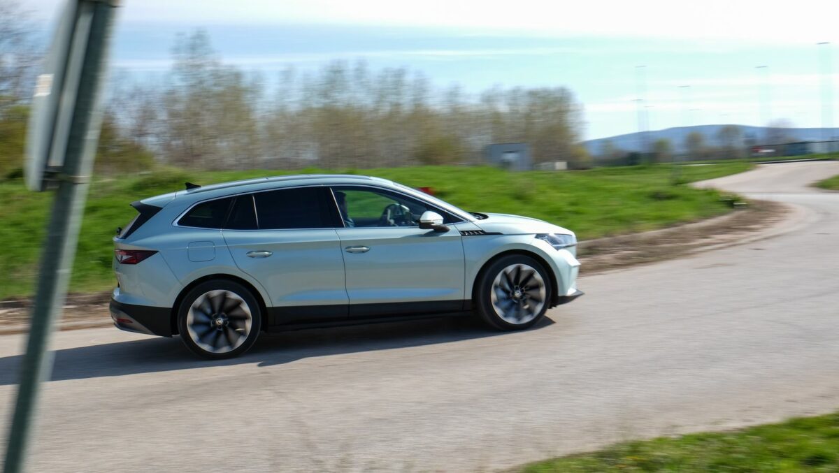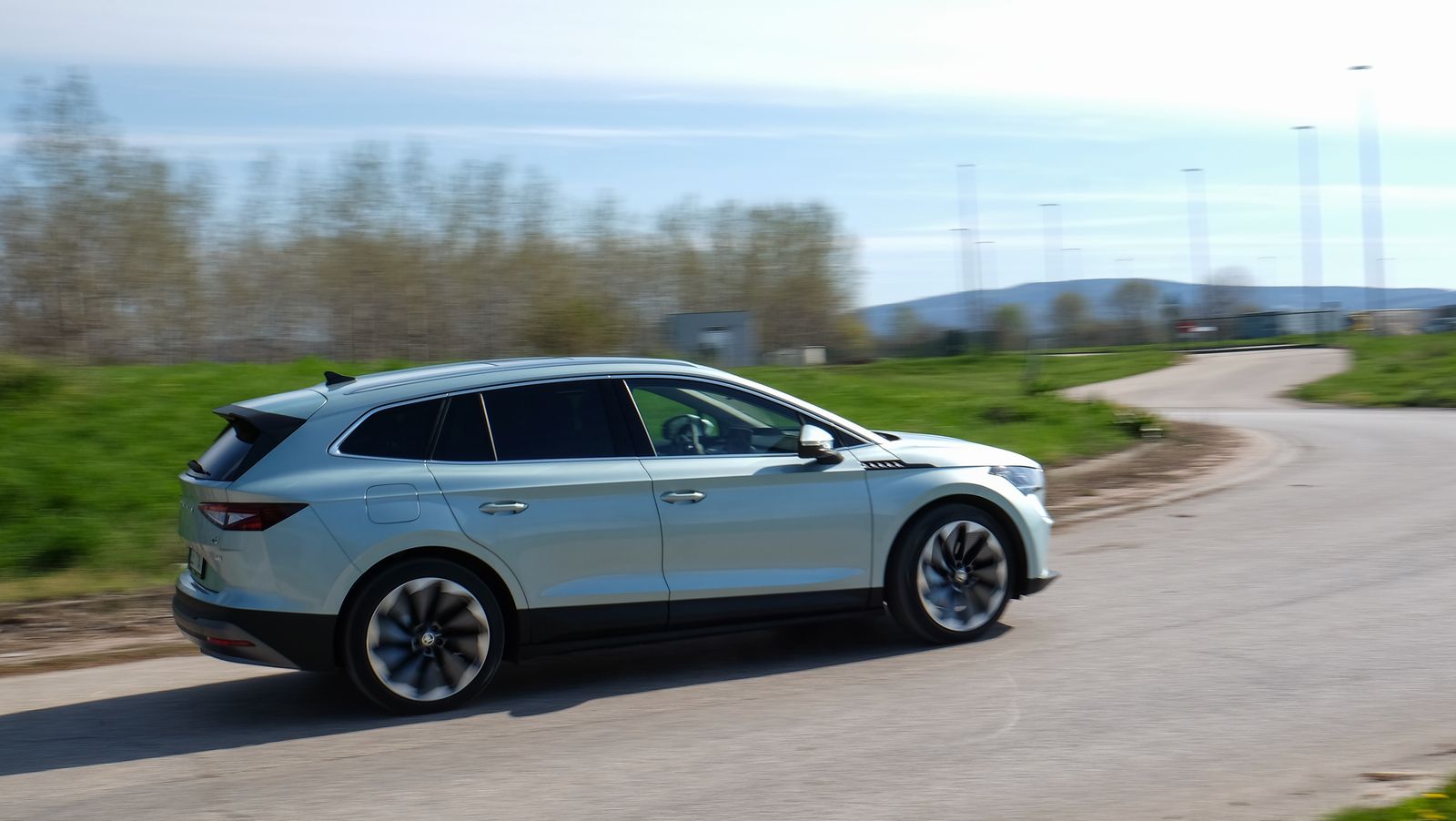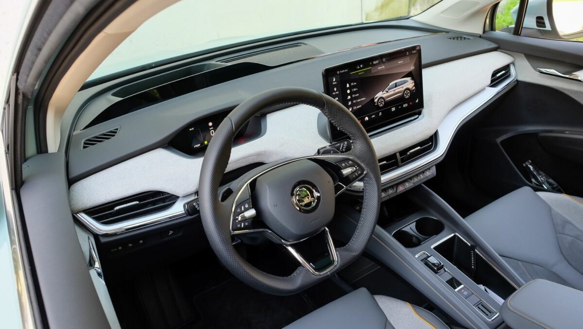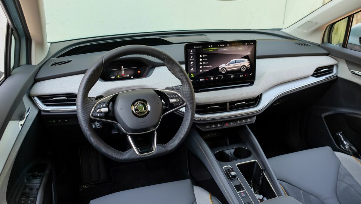 A kormánykerék vágott aljú, az Octaviából ismerős, a váltókapcsoló pedig új, tényleg csak egy kis gomb, az előre- és hátramenet mellett fokozott visszatöltést adó B-mód is kapcsolható, de a visszatöltés mértéke a kormány mögötti fülekkel is szabályozható, sőt a navigáció alapján magától is hangolódhat. A 204 lóerős, 310 Nm nyomatékú villanymotor 8,5 másodperces 100-ra gyorsulása még nem fájdalmas, de már kellően az ülésbe préselő, a végsebességet az RS verzió kivételével 160 km/órában maximalizálták a csehek, ami a villanyautók körében viszonylag magas érték. A dinamika nem csak 100-ig van meg, felette is, igaz sokkal feljebb nem mehettünk, hiszen a tesztút nem tartalmazott autópályát.