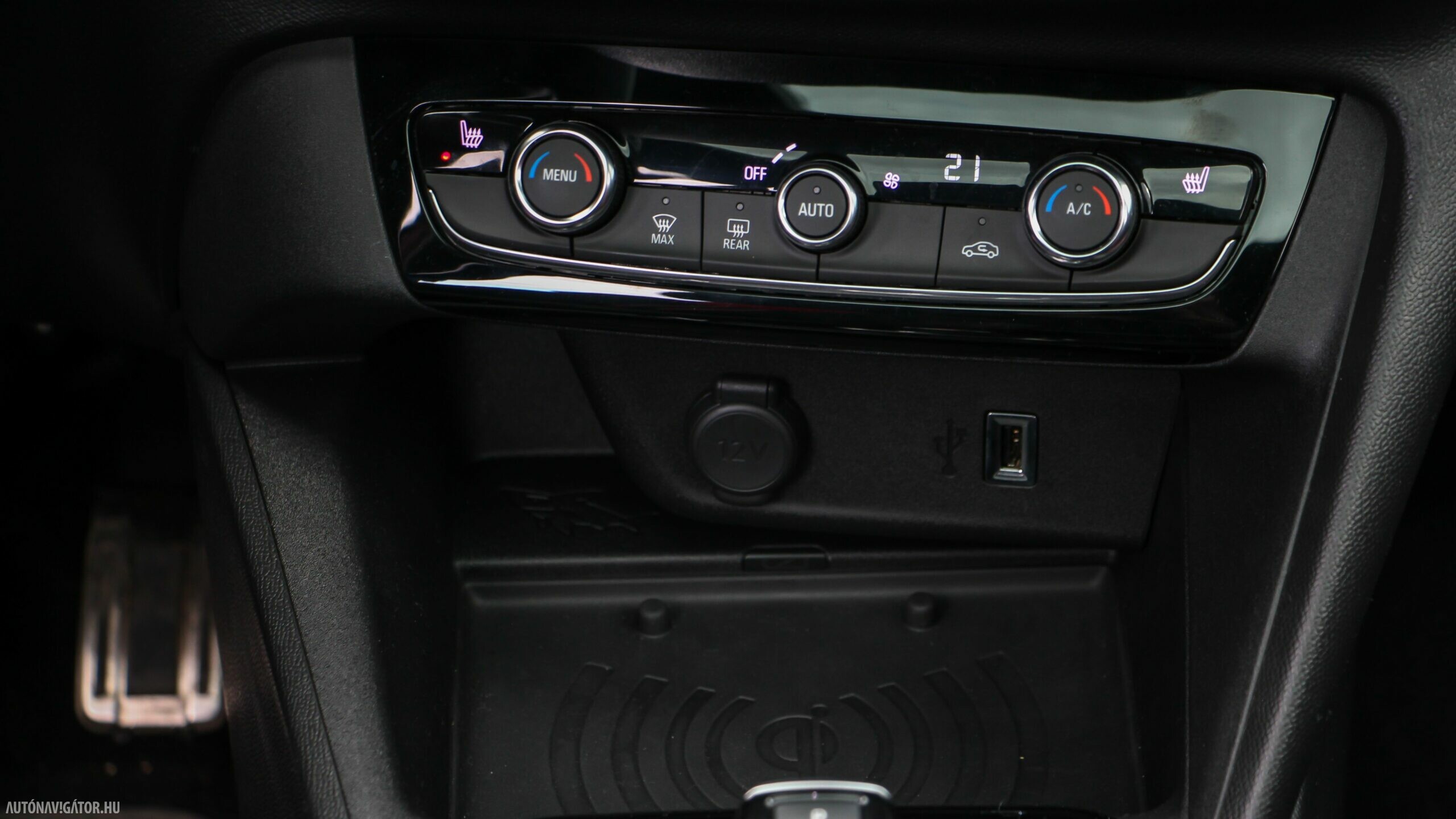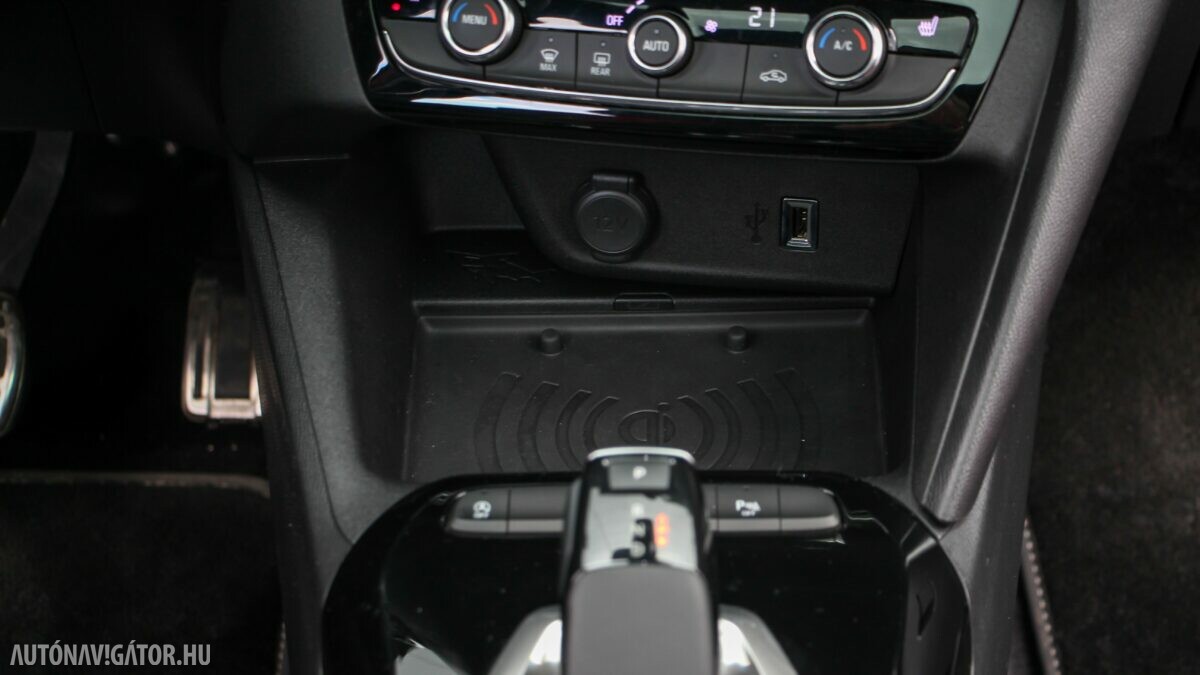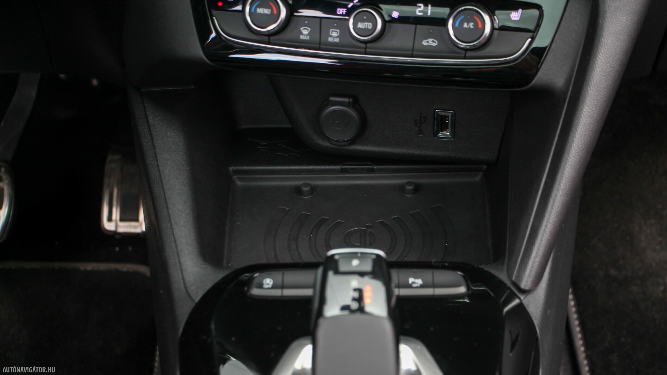 PSA-féle elektronikus váltókar, menetmódválasztó, előtte pedig vezeték nélküli töltőpad. A klímapanel két tekerőgombjával kétzónásnak tűnik, pedig nem az. A gyári navigációt az Apple CarPlay korában nem érdemes megvenni