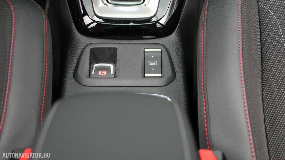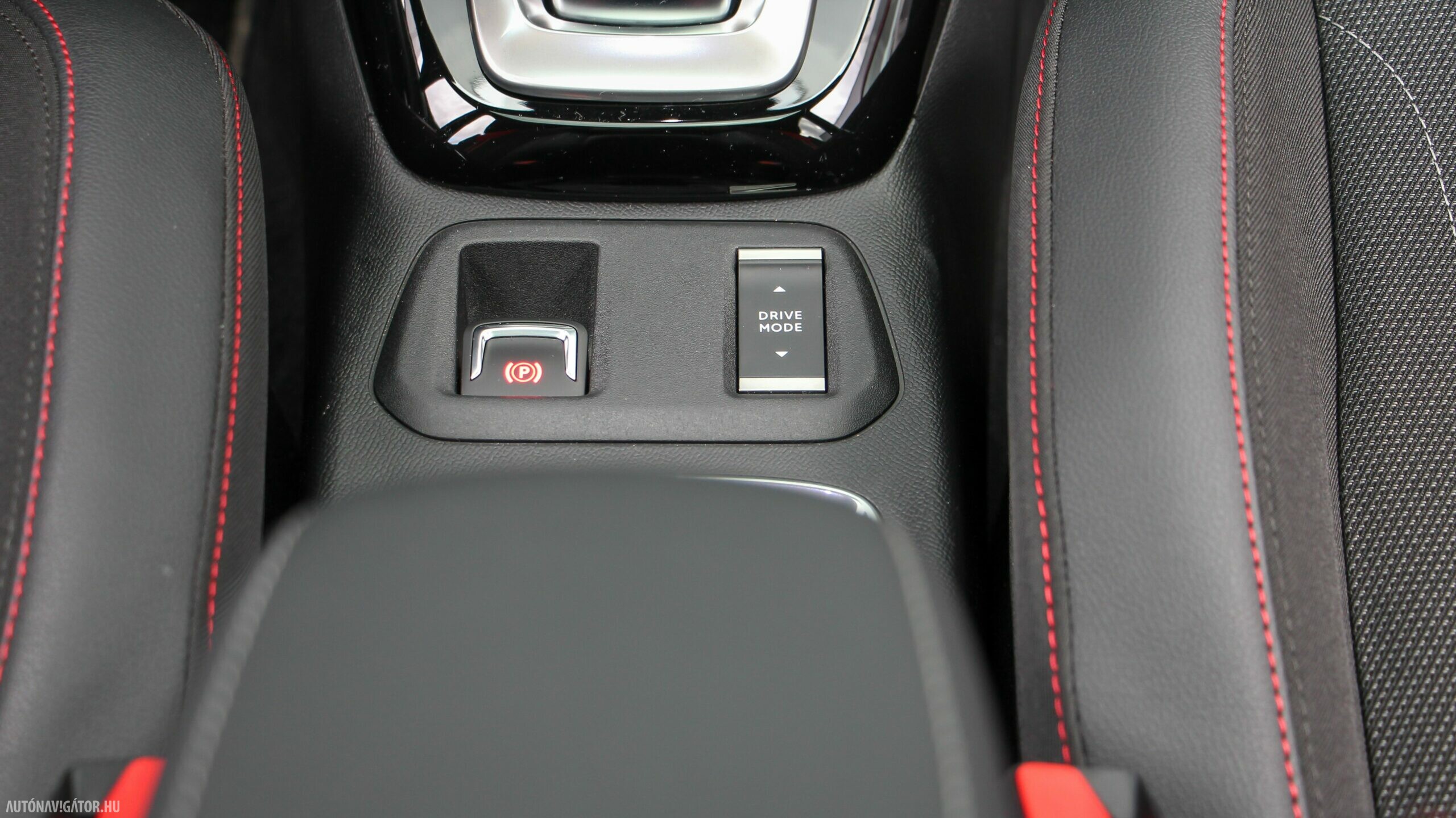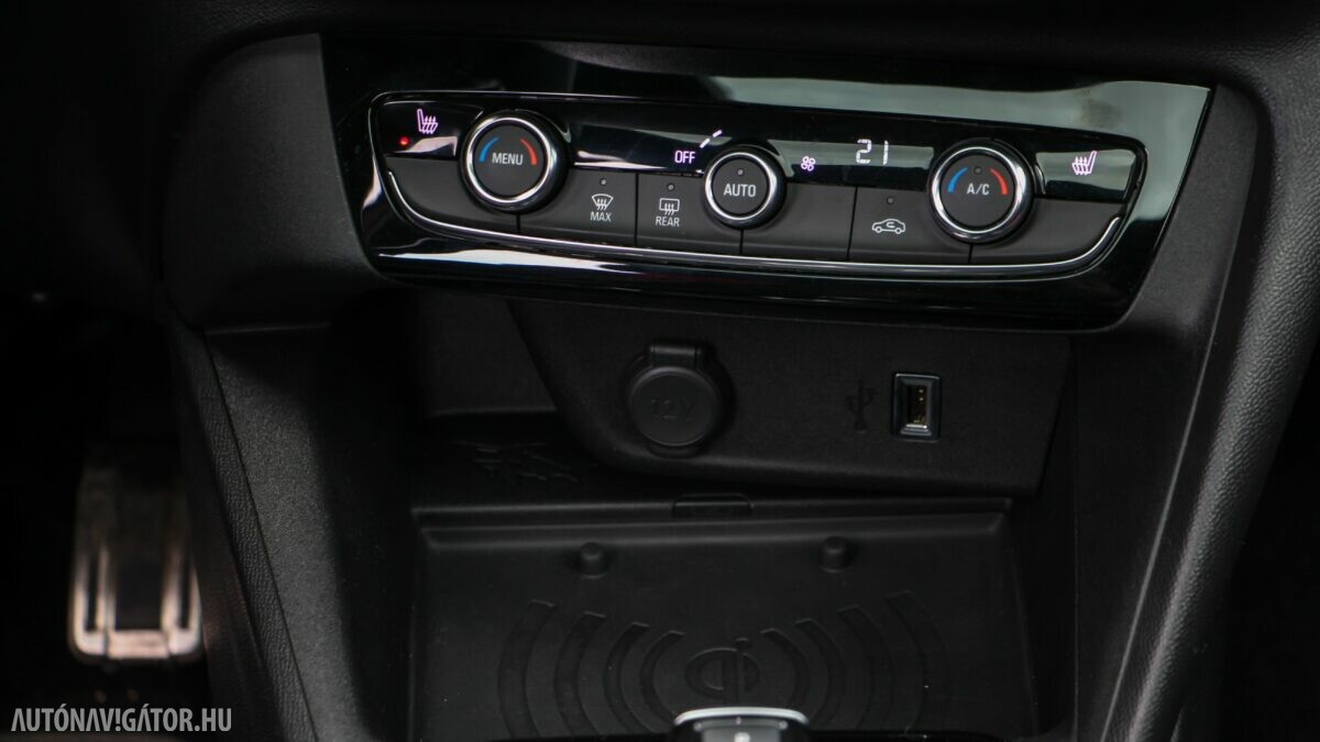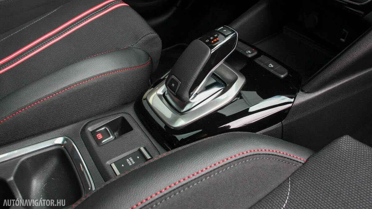 PSA-féle elektronikus váltókar, menetmódválasztó, előtte pedig vezeték nélküli töltőpad. A klímapanel két tekerőgombjával kétzónásnak tűnik, pedig nem az. A gyári navigációt az Apple CarPlay korában nem érdemes megvenni