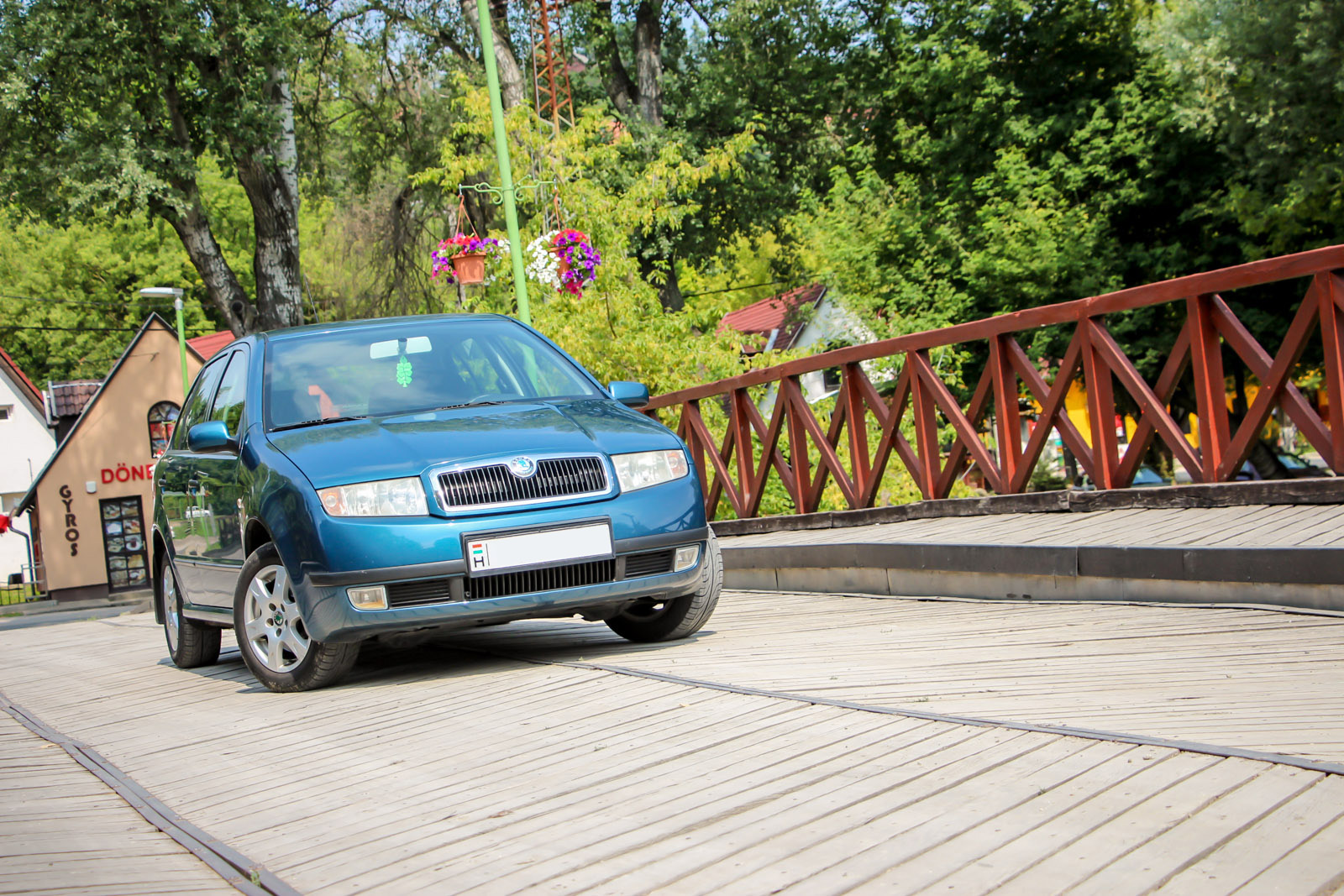 Tesztünk alanya is belefért, minden jóval felszerelve, amit minimum elvárhatunk egy átlagos kocsitól. Mivel tulaja rendszeresen motorozik, így nem a mindennapi autózásban szeretné örömét lelni, egyszerű járósnak kellett, nagyon sok típust megnézett, de a Fabia jött ki győztesen. Nem is csoda, már messziről is jól mutat, nem túl gyakori a sötét türkiz árnyalat, ráadásul gyári alufelnik is jártak hozzá, elég jó állapotban, a lámpabúrák meg néhány ezresért felpolírozhatók. Kívülről csak egy korábbi koccanás eredménye látszik, az első lökös és a jobb első sárvédő fényezése kicsit más árnyalatra sikerült, de nem eget verő a különbség.