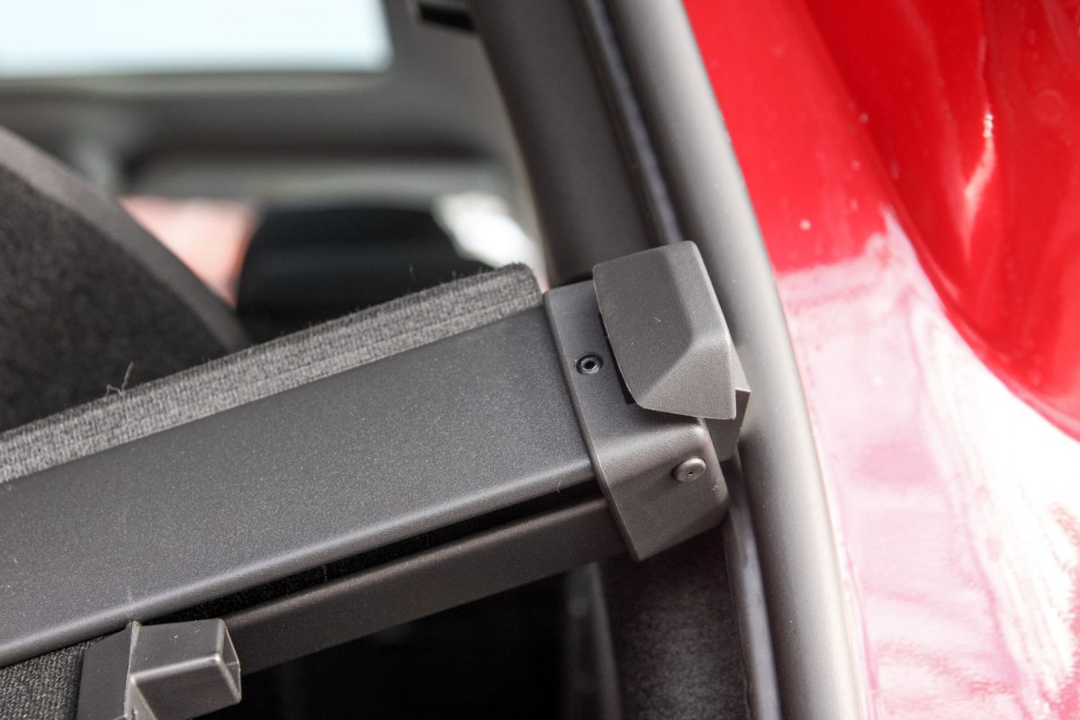 Nehézkességből akad még. Még mindig hangár méretű raktér alakítható az utastérből, amiben még akár két személy kényelmesen el is alszik, mivel a lehajtott ülések ügyesen sík padlót adnak. Lehajtásuk viszont komoly feladat, ugyanis a középső sor ülésein egyenként öt kallantyúból kell kitalálnunk, vajon melyik lesz a jó megoldás. A fölső karral felcsapódik az ülőlap és előretolhatjuk a hátra beszálláshoz. Ha le akarjuk dönteni, akkor a piros hátsó fityegőt kell válasszuk. De csak akkor tudjuk ledönteni, ha az ülőlap és a háttámla is reteszelve van, úgy viszont nem érjük el, így előre kell húzni az első kallantyúval, úgy viszont nem dől le az első ülés miatt, így tolhatjuk vissza. Még mindig maradt ülésenként két flepni, amit nem használtunk, és nem is jöttem rá, hogy mire jók, de inkább több legyen, mint kevesebb. Ezt három üléssel eljátszani, plusz az első utasülés síkba hajthatóságával együtt egy délutáni családi programnak betudható, simán elszórakoztam vele a fotózás miatt jó fél órát, közben edzésnek is jó volt.