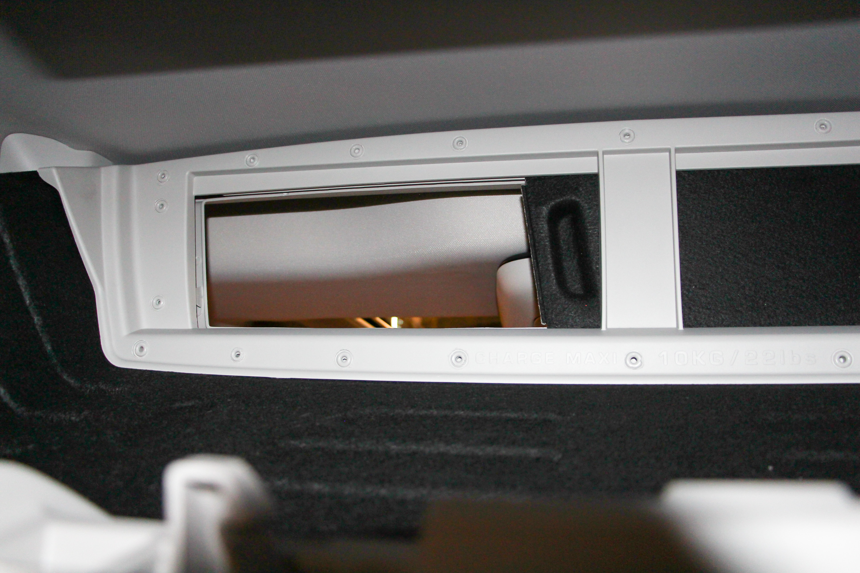 Szűk helyen pakoláshoz nyitható a hátsó ablak is, a tetőből lehajtható tároló az utastérből is elérhető