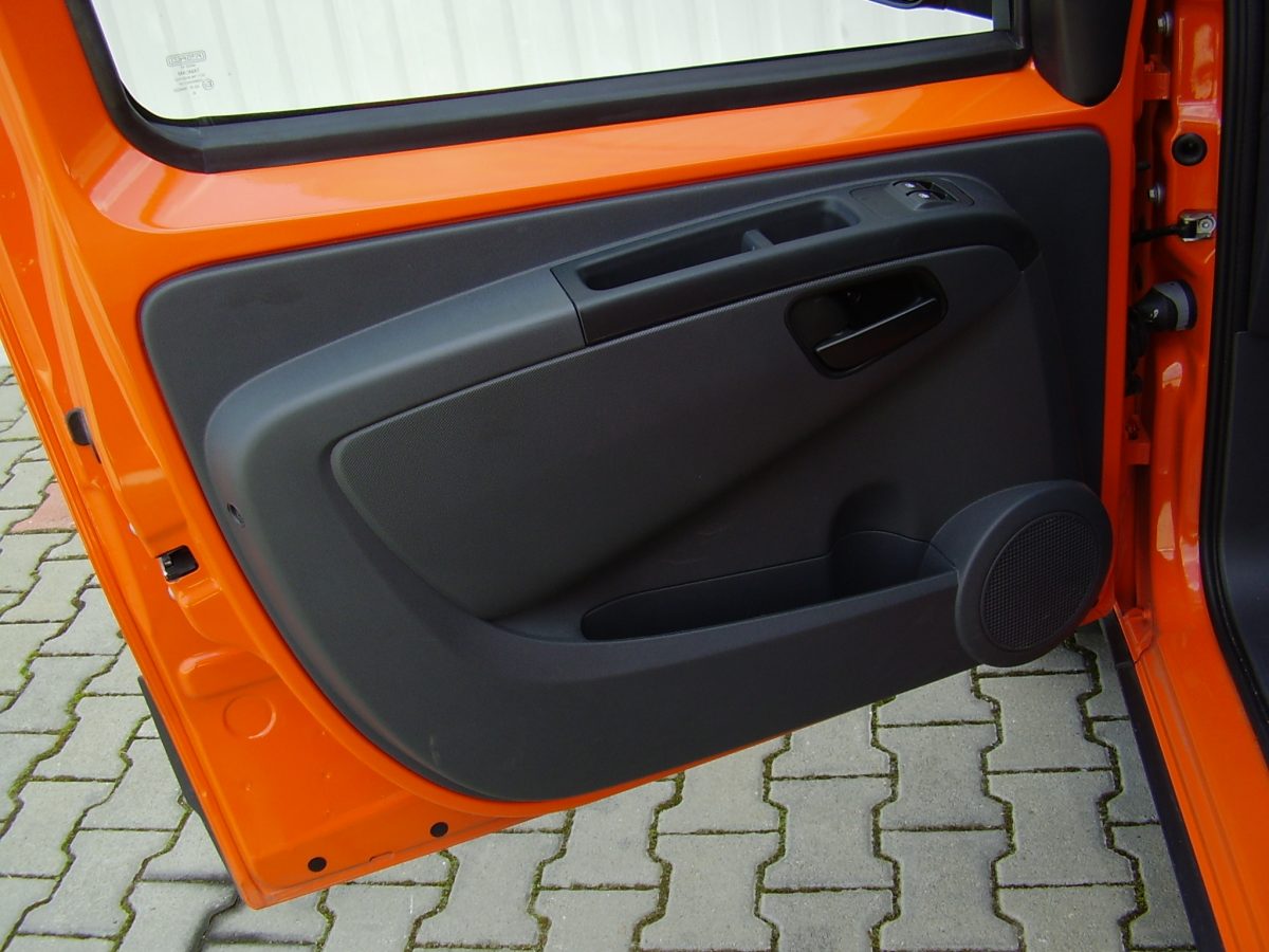 Rögzíthetők az oldalfalon a KRESZ tartozékok. Nincs rakodóperem, könnyen meg lehet pakolni a doboz forma rakteret. A támla ledönthető, az ülés előrebillenthető, vagy akár ki is emelhető a hátsó részből