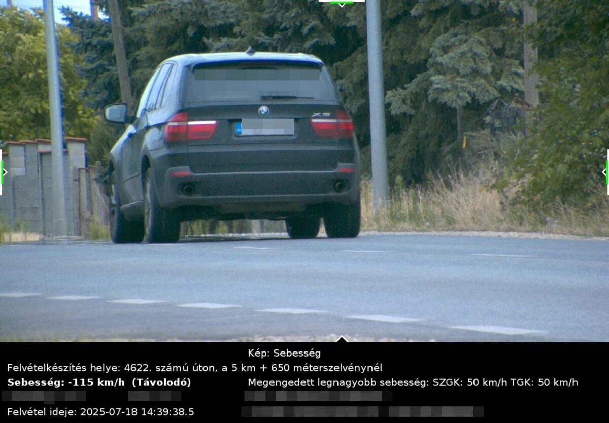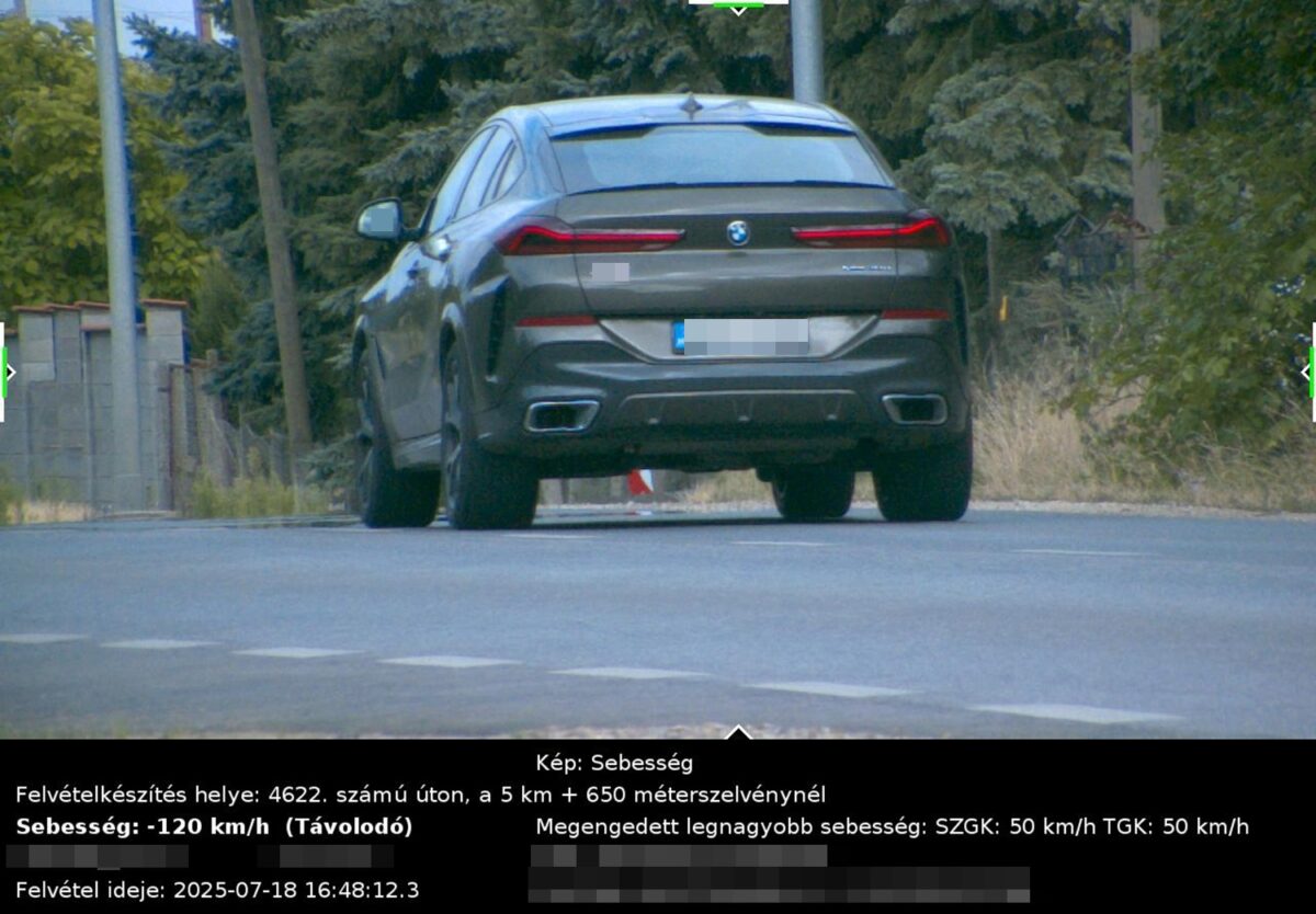 Ezzel szemben a 4622. számú főúton a két BMW bizonyos értelemben súlyosabb kihágást követett el. A sebességük 115, illetve 120 km/óra volt az 50-es szakaszon, vagyis bőven a legális duplájával haladtak. A rendőrség tájékoztatása szerint utóbbi üzembentartójának 312 ezer forintot kell befizetnie. A másik két esetben nem közölték a bírság pontos mértékét, de a hatályos jogszabályok alapján minden bizonnyal a 115 km/órával közlekedő sofőrnek 210 ezer, míg a 157 km/órával haladónak 140 ezer forint szerepel majd a csekken.