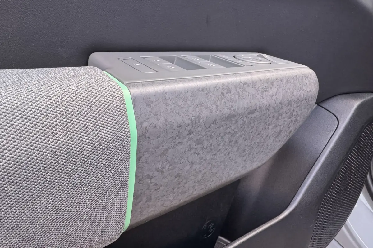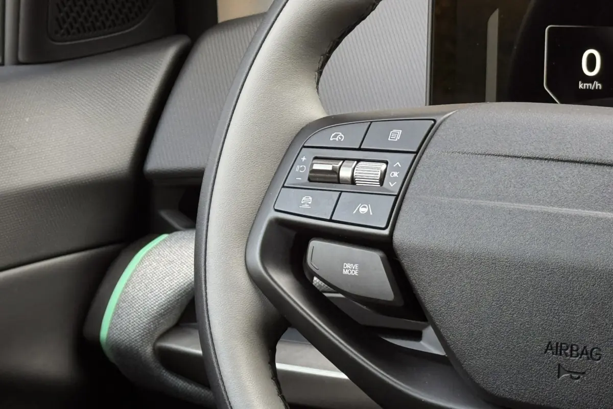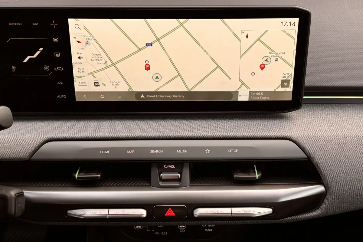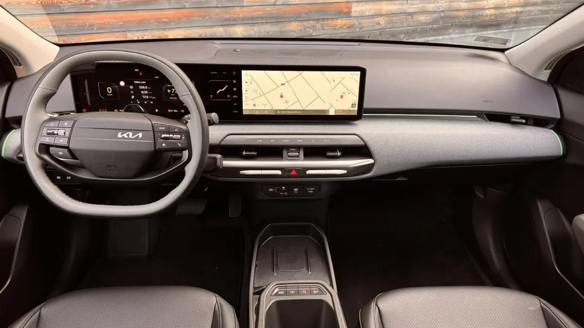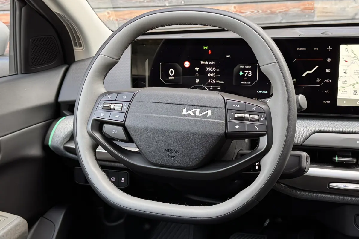 Elöl ugyanez a helyzet, kényelmesek és jól tartanak az ülések, külön dicséretet érdemelnek a fejtámlák, amelyek kialakítása nyugodtan lehetne iparági standard. A műszerfalban nagy meglepetés nincs az EV3 után. Jól átlátható, könnyen értelmezhető és főleg könnyűszerrel kezelhető úgy az érintőképernyő menürendszere, mint a fizikai gombok. A digitális műszeregység képe is éles, jól leolvasható, viszont a HUD kicsit torz, valószínűnek tartom, hogy a szélvédő dőlésszöge a ludas. A tojásdad alakú multikormány fogása is jó, súlyozása megfelelő, gombjain ennek is könnyű kiigazodni.