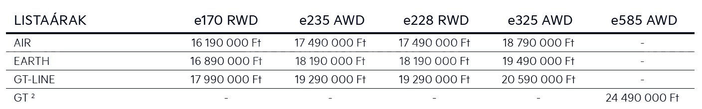 A Kia tehát a piac – nyilván szubjektív, de sokak szerint – legdögösebb, egyben leginkább használható villanyautóját hozta el, ráadásul a hasonló méretű konkurens modelleknél olcsóbban. Nem is kicsivel! Az e170 RWD alapverzió 16 190 000 forintról indul (a nem létező állami támogatással és a márka kedvezményével 13,49 milliós belépőárat hirdetnek). Az EV6 a leggazdagabb GT-Line felszereltséggel is 18 millió forint alatt van, de a nagyobb akkus és összkerékhajtású csúcsverzió is megáll 20,59 millió forintnál. Oké a távirányítós parkolást és az önálló sávváltást is lehetővé tevő, Meridian csúcshifis, óriási és eléggé intuitív head-up display-t adó Premium Vision csomag még 1,5 millió forint hozzá, ahogyan a hőszivattyús légkondit és az áramleadást adó „Power csomag” is 500 ezer forintos tétel, viszont az EV6 a konkurenseihez mérten mindenképp határozottan olcsó.
