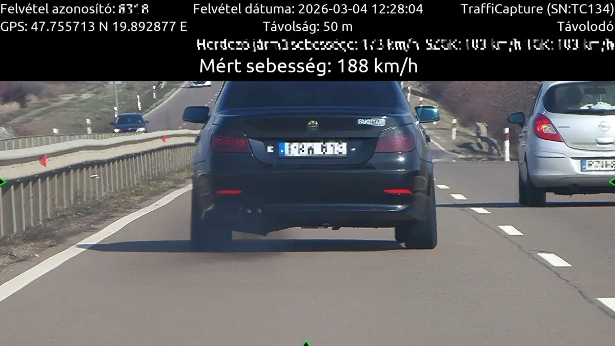 A Gyöngyösre bevezető úton, az általános országúti sebességhatár mellett készült a fenti fotó, vagyis a megengedett 90-re további 98 km/órát még ráemelt fekete BMW vezetője. Eközben szabad szemmel is jól látható füstfelhőt is eregetett, ami arra utal, hogy az autó sem felel meg a vonatkozó előírásoknak. Az egyenruhásoknak sikerült utolérni a 188 km/órás sebességgel kormoló autóst: megállították és meg is kapta a 312 ezer forintos közigazgatási bírságot. A BMW műszaki állapotával kapcsolatban azonban nem tudtak mit tenni az egyenruhások. Hiába küldenél ugyanis soron kívüli vizsgára egy olyan autót, ami egyébként sem közlekedhetne közúton. Mint kiderült, a fekete 5-öst hivatalból kivonták a forgalomból korábban, így a sofőr további 65 ezer forint bírságot is kapott. A gyorshajtásért járó 8 szabálysértési előéleti pont már csak hab volt a tortán az összesen 377 ezer forintnyi befizetendő mellé.